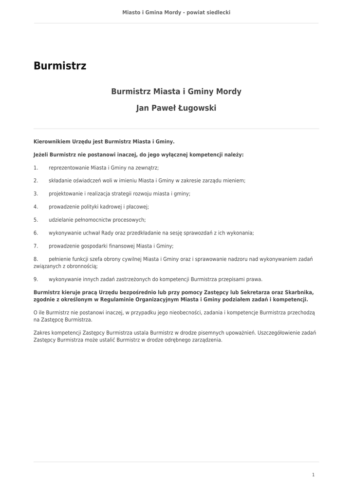 Miasto i Gmina Mordy - powiat siedlecki Burmistrz Burmistrz Miasta i Gminy Mordy Jan Paweł Ługowski Kierownikiem Urzędu jest Burmistrz Miasta i Gminy. Jeżeli Burmistrz nie postanowi inaczej, do jego wyłącznej kompetencji należy: 1. reprezentowanie Miasta i Gminy na zewnątrz; 2. składanie oświadczeń woli w imieniu Miasta i Gminy w zakresie zarządu mieniem; 3. projektowanie i realizacja strategii rozwoju miasta i gminy; 4. prowadzenie polityki kadrowej i płacowej; 5. udzielanie pełnomocnictw procesowych; 6. wykonywanie uchwał Rady oraz przedkładanie na sesję sprawozdań z ich wykonania; 7. prowadzenie gospodarki finansowej Miasta i Gminy; 8. pełnienie funkcji szefa obrony cywilnej Miasta i Gminy oraz i sprawowanie nadzoru nad wykonywaniem zadań związanych z obronnością; 9. wykonywanie innych zadań zastrzeżonych do kompetencji Burmistrza przepisami prawa. Burmistrz kieruje pracą Urzędu bezpośrednio lub przy pomocy Zastępcy lub Sekretarza oraz Skarbnika, zgodnie z określonym w Regulaminie Organizacyjnym Miasta i Gminy podziałem zadań i kompetencji. O ile Burmistrz nie postanowi inaczej, w przypadku jego nieobecności, zadania i kompetencje Burmistrza przechodzą na Zastępcę Burmistrza. Zakres kompetencji Zastępcy Burmistrza ustala Burmistrz w drodze pisemnych upoważnień. Uszczegółowienie zadań Zastępcy Burmistrza może ustalić Burmistrz w drodze odrębnego zarządzenia. 1