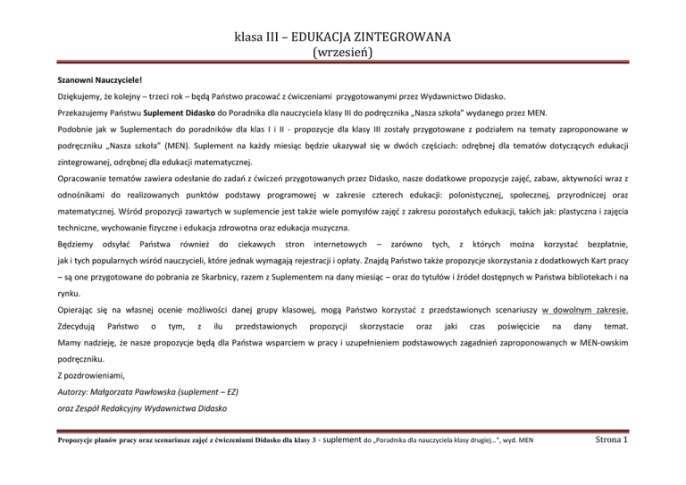 klasa III – EDUKACJA ZINTEGROWANA (wrzesień) Szanowni Nauczyciele! Dziękujemy, że kolejny – trzeci rok – będą Państwo pracować z ćwiczeniami przygotowanymi przez Wydawnictwo Didasko. Przekazujemy Państwu Suplement Didasko do Poradnika dla nauczyciela klasy III do podręcznika „Nasza szkoła” wydanego przez MEN. Podobnie jak w Suplementach do poradników dla klas I i II - propozycje dla klasy III zostały przygotowane z podziałem na tematy zaproponowane w podręczniku „Nasza szkoła” (MEN). Suplement na każdy miesiąc będzie ukazywał się w dwóch częściach: odrębnej dla tematów dotyczących edukacji zintegrowanej, odrębnej dla edukacji matematycznej. Opracowanie tematów zawiera odesłanie do zadań z ćwiczeń przygotowanych przez Didasko, nasze dodatkowe propozycje zajęć, zabaw, aktywności wraz z odnośnikami do realizowanych punktów podstawy programowej w zakresie czterech edukacji: polonistycznej, społecznej, przyrodniczej oraz matematycznej. Wśród propozycji zawartych w suplemencie jest także wiele pomysłów zajęć z zakresu pozostałych edukacji, takich jak: plastyczna i zajęcia techniczne, wychowanie fizyczne i edukacja zdrowotna oraz edukacja muzyczna. Będziemy odsyłać Państwa również do ciekawych stron internetowych – zarówno tych, z których można korzystać bezpłatnie, jak i tych popularnych wśród nauczycieli, które jednak wymagają rejestracji i opłaty. Znajdą Państwo także propozycje skorzystania z dodatkowych Kart pracy – są one przygotowane do pobrania ze Skarbnicy, razem z Suplementem na dany miesiąc – oraz do tytułów i źródeł dostępnych w Państwa bibliotekach i na rynku. Opierając się na własnej ocenie możliwości danej grupy klasowej, mogą Państwo korzystać z przedstawionych scenariuszy w dowolnym zakresie. Zdecydują Państwo o tym, z ilu przedstawionych propozycji skorzystacie oraz jaki czas poświęcicie na dany temat. Mamy nadzieję, że nasze propozycje będą dla Państwa wsparciem w pracy i uzupełnieniem podstawowych zagadnień zaproponowanych w MEN-owskim podręczniku. Z pozdrowieniami, Autorzy: Małgorzata Pawłowska (suplement – EZ) oraz Zespół Redakcyjny Wydawnictwa Didasko Propozycje planów pracy oraz scenariusze zajęć z ćwiczeniami Didasko dla klasy 3 - suplement do „Poradnika dla nauczyciela klasy drugiej…”, wyd. MEN Strona 1 klasa III – EDUKACJA ZINTEGROWANA (wrzesień) 1. tydzień nauki – Pierwszego września (NASZ PLAN NA TRZECIĄ KLASĘ) Temat: Pierwszego września Powitanie – wykonanie plakatu „Krąg przyjaznych dłoni” Kolejność liter w alfabecie - przypomnienie Nasze wizytówki - wykonanie wizytówek. Nasze podręczniki - omówienie tematyki zawartej w książkach. Jestem w trzeciej klasie - Moje ćwiczenia, cz. A, str.2). Kodeks klasowy – praca plastyczna. Edukacja polonistyczna 1.3.c 1.1.b; 1.3.e 1.3.a; 1.3.f 1.1.a; 1.1.c 1.3.f 1.3.c Edukacja społeczna 5.1; 5.4; 5.6 Edukacja przyrodnicza 5.1; 5.4; 5.6 Propozycje zajęć: Powitanie – odrysowanie na dużym kartonie dłoni dzieci . Każde dziecko koloruje swoją dłoń na ulubioną barwę, wpisuje w nią swoje imię oraz nazwę tego , co lubi najbardziej robić. Umieszczenie plakatu „Krąg przyjaznych dłoni” w wybranym miejscu w klasie. Kolejność liter w alfabecie – przypomnienie. Zabawy z alfabetem. Nasze wizytówki - wykonanie wizytówek: najpierw dzieci piszą imię, a potem nazwisko. Na kolejnej odwrotnie najpierw nazwisko, a potem imię. Przypomnienie segregowania wyrazów wg kolejności alfabetycznej. Dzieci na dywanie rozkładają wizytówki, na których jako pierwsze zapisały swoje imię. Zadaniem uczniów jest ich ułożenie w kolejności alfabetycznej. Następnie dzieci rozkładają wizytówki , na których zapisały pierwsze nazwiska. Znów nauczyciel prosi o ułożenie ich wg alfabetu. Rozmowa z dziećmi o tym, czym różniło się pierwsze i drugie ułożenie wizytówek. Dlaczego zmieniła się kolejność ułożonych wizytówek? Wyjaśnienie polecenia: „Ułóż wg kolejności alfabetycznej”. Rozważanie – „Do czego jest to nam potrzebne? Gdzie i kiedy to wykorzystujemy?” Ozdabianie wizytówek tych, na których dzieci zapisały pierwsze nazwisko i przypięcie ich w wybranym miejscu w klasie. Nasze podręczniki - obejrzenie nowych książek, omówienie tematyki. Jestem w trzeciej klasie - uzupełnienie wizytówki swoimi danymi (Moje ćwiczenia, cz. A, str.2). Propozycje planów pracy oraz scenariusze zajęć z ćwiczeniami Didasko dla klasy 3 - suplement do „Poradnika dla nauczyciela klasy drugiej…”, wyd. MEN Strona 2 klasa III – EDUKACJA ZINTEGROWANA (wrzesień) Kodeks klasowy – burza mózgów – ustalenie i zapisanie klasowego kodeksu postępowania na dużym formacie. Ozdobienie kodeksu w wybrany przez dzieci sposób. Pomysły: o odciski dłoni w farbie ułożone w formie kwiatka, serca o zasady zapisane na wyciętych z kolorowego papieru kształtach t-shirtów, do których dzieci doklejają swoje twarze wycięte z fotografii lub wydrukowane o zasady zapisane na kolorowych puzzlach, zestawionych w jeden obraz Propozycje planów pracy oraz scenariusze zajęć z ćwiczeniami Didasko dla klasy 3 - suplement do „Poradnika dla nauczyciela klasy drugiej…”, wyd. MEN Strona 3 klasa III – EDUKACJA ZINTEGROWANA (wrzesień) 1. tydzień nauki – Pod starym dębem (NASZ PLAN NA TRZECIĄ KLASĘ) Temat: Pod starym dębem Czym jest wojna? – mapa myśli Wycieczka do miejsca związanego z działaniami wojennymi. Tragedie wojenne - swobodne wypowiedzi na podstawie filmów, zdjęć, czytanych książek Czym jest pokój – mapa myśli Plakat o tematyce pokojowej – praca w grupach List do dorosłych z prośbą o pokój na całym świecie – praca wspólna. Edukacja polonistyczna 1.1.a; 1.3.a; 1.3.c 1.1.a; 1.1.b 1.1.a; 1.2.a; 1.2.b; 1.2.d; 1.3.a; 1.3.c 1.1.a; 1.3.a; 1.3.c 1.1.a; 1.3.a; 1.3.c; 1.3.f 1.1.a; 1.3.a; 1.3.c; 1.3.f Edukacja społeczna 5.2; 5.5