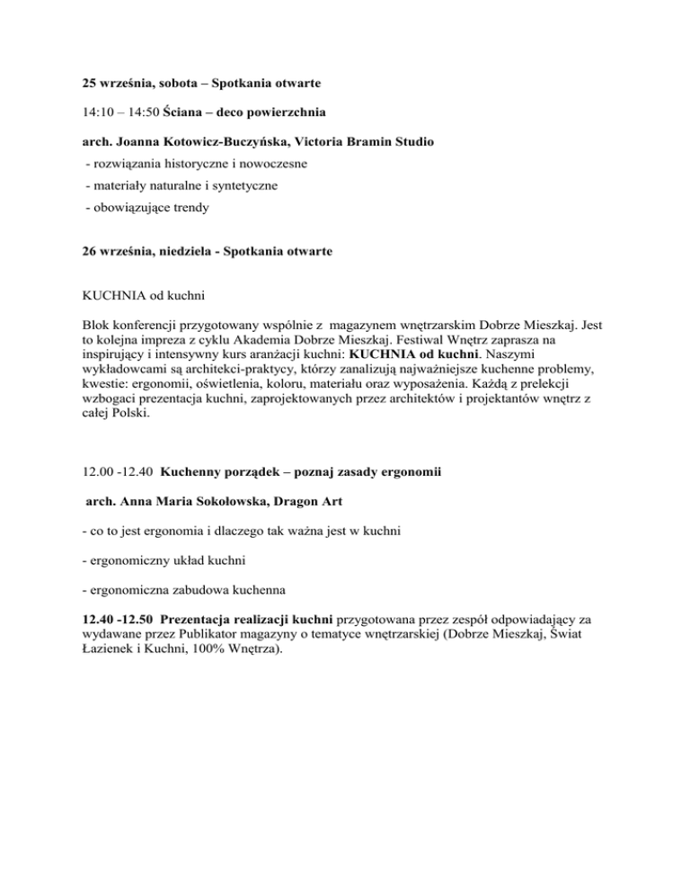 25 września, sobota – Spotkania otwarte 14:10 – 14:50 Ściana – deco powierzchnia arch. Joanna Kotowicz-Buczyńska, Victoria Bramin Studio - rozwiązania historyczne i nowoczesne - materiały naturalne i syntetyczne - obowiązujące trendy 26 września, niedziela - Spotkania otwarte KUCHNIA od kuchni Blok konferencji przygotowany wspólnie z magazynem wnętrzarskim Dobrze Mieszkaj. Jest to kolejna impreza z cyklu Akademia Dobrze Mieszkaj. Festiwal Wnętrz zaprasza na inspirujący i intensywny kurs aranżacji kuchni: KUCHNIA od kuchni. Naszymi wykładowcami są architekci-praktycy, którzy zanalizują najważniejsze kuchenne problemy, kwestie: ergonomii, oświetlenia, koloru, materiału oraz wyposażenia. Każdą z prelekcji wzbogaci prezentacja kuchni, zaprojektowanych przez architektów i projektantów wnętrz z całej Polski. 12.00 -12.40 Kuchenny porządek – poznaj zasady ergonomii arch. Anna Maria Sokołowska, Dragon Art - co to jest ergonomia i dlaczego tak ważna jest w kuchni - ergonomiczny układ kuchni - ergonomiczna zabudowa kuchenna 12.40 -12.50 Prezentacja realizacji kuchni przygotowana przez zespół odpowiadający za wydawane przez Publikator magazyny o tematyce wnętrzarskiej (Dobrze Mieszkaj, Świat Łazienek i Kuchni, 100% Wnętrza). 12.50 – 13.30 Wnętrze podsycone apetytem – kolor i materiał w kuchni arch. Kamila Pawłowska, Design Republic -znaczenie koloru w kuchni -materiał do kuchni (zabudowa kuchenna, podłoga, ściana między górnym a dolnym ciągiem szafek) 13.30-13.40 – Prezentacja realizacji kuchni 13.40 – 14.20 Rozświetlamy kuchenne mroki arch. Monika Gorlikowska, Moho-design -rodzaje kuchennego oświetlenia -oświetlamy blaty robocze i wnętrza szafek -oświetlenie jadalni (stołu do spożywania posiłków) 14.20 -14.30 – Prezentacja realizacji 15.00- Losowanie nagród - odkurzacz Hoover Purepower TPP 2330 - zegar ścienny BIG TIME (Studio Interio) - zestaw (pościel + ręcznik) firmy GRENO