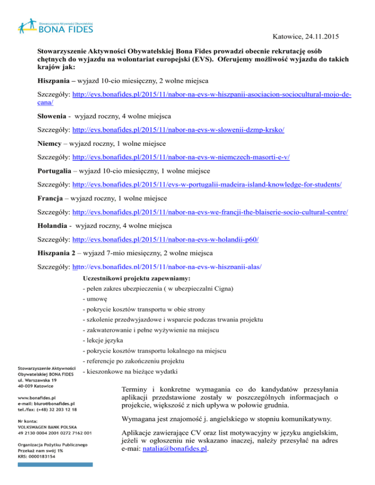 Katowice, 24.11.2015 Stowarzyszenie Aktywności Obywatelskiej Bona Fides prowadzi obecnie rekrutację osób chętnych do wyjazdu na wolontariat europejski (EVS). Oferujemy możliwość wyjazdu do takich krajów jak: Hiszpania – wyjazd 10-cio miesięczny, 2 wolne miejsca Szczegóły: http://evs.bonafides.pl/2015/11/nabor-na-evs-w-hiszpanii-asociacion-sociocultural-mojo-decana/ Słowenia - wyjazd roczny, 4 wolne miejsca Szczegóły: http://evs.bonafides.pl/2015/11/nabor-na-evs-w-slowenii-dzmp-krsko/ Niemcy – wyjazd roczny, 1 wolne miejsce Szczegóły: http://evs.bonafides.pl/2015/11/nabor-na-evs-w-niemczech-masorti-e-v/ Portugalia – wyjazd 10-cio miesięczny, 1 wolne miejsce Szczegóły: http://evs.bonafides.pl/2015/11/evs-w-portugalii-madeira-island-knowledge-for-students/ Francja – wyjazd roczny, 1 wolne miejsce Szczegóły: http://evs.bonafides.pl/2015/11/nabor-na-evs-we-francji-the-blaiserie-socio-cultural-centre/ Holandia - wyjazd roczny, 4 wolne miejsca Szczegóły: http://evs.bonafides.pl/2015/11/nabor-na-evs-w-holandii-p60/ Hiszpania 2 – wyjazd 7-mio miesięczny, 2 wolne miejsca Szczegóły: http://evs.bonafides.pl/2015/11/nabor-na-evs-w-hiszpanii-alas/ Uczestnikowi projektu zapewniamy: - pełen zakres ubezpieczenia ( w ubezpieczalni Cigna) - umowę - pokrycie kosztów transportu w obie strony - szkolenie przedwyjazdowe i wsparcie podczas trwania projektu - zakwaterowanie i pełne wyżywienie na miejscu - lekcje języka - pokrycie kosztów transportu lokalnego na miejscu - referencje po zakończeniu projektu - kieszonkowe na bieżące wydatki Terminy i konkretne wymagania co do kandydatów przesyłania aplikacji przedstawione zostały w poszczególnych informacjach o projekcie, większość z nich upływa w połowie grudnia. Aplikacje zawierające CV oraz list motywacyjny w języku angielskim, Wymagana jeżeli w ogłoszeniu niej. angielskiego wskazano inaczej, należy jest znajomość w stopniu komunikatywny. przesyłać na adres e-mai: [email protected]. Aplikacje zawierające CV oraz list motywacyjny w języku angielskim, jeżeli w ogłoszeniu nie wskazano inaczej, należy przesyłać na adres e-mai: [email protected]. Terminy przesyłania aplikacji przedstawione zostały w poszczególnych informacjach o projekcie, większość z nich upływa już w marcu lub początkiem kwietnia.