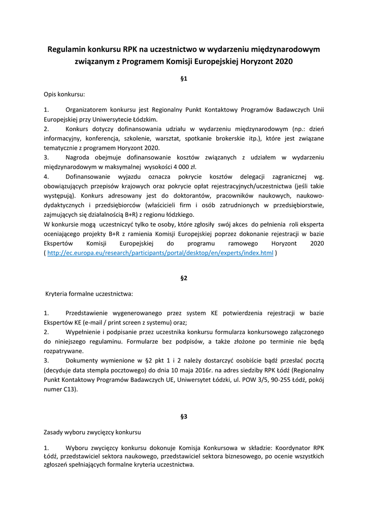 Regulamin konkursu RPK na uczestnictwo w wydarzeniu międzynarodowym związanym z Programem Komisji Europejskiej Horyzont 2020 §1 Opis konkursu: 1. Organizatorem konkursu jest Regionalny Punkt Kontaktowy Programów Badawczych Unii Europejskiej przy Uniwersytecie Łódzkim. 2. Konkurs dotyczy dofinansowania udziału w wydarzeniu międzynarodowym (np.: dzień informacyjny, konferencja, szkolenie, warsztat, spotkanie brokerskie itp.), które jest związane tematycznie z programem Horyzont 2020. 3. Nagroda obejmuje dofinansowanie kosztów związanych z udziałem w wydarzeniu międzynarodowym w maksymalnej wysokości 4 000 zł. 4. Dofinansowanie wyjazdu oznacza pokrycie kosztów delegacji zagranicznej wg. obowiązujących przepisów krajowych oraz pokrycie opłat rejestracyjnych/uczestnictwa (jeśli takie występują). Konkurs adresowany jest do doktorantów, pracowników naukowych, naukowodydaktycznych i przedsiębiorców (właścicieli firm i osób zatrudnionych w przedsiębiorstwie, zajmujących się działalnością B+R) z regionu łódzkiego. W konkursie mogą uczestniczyć tylko te osoby, które zgłosiły swój akces do pełnienia roli eksperta oceniającego projekty B+R z ramienia Komisji Europejskiej poprzez dokonanie rejestracji w bazie Ekspertów Komisji Europejskiej do programu ramowego Horyzont 2020 ( http://ec.europa.eu/research/participants/portal/desktop/en/experts/index.html ) §2 Kryteria formalne uczestnictwa: 1. Przedstawienie wygenerowanego przez system KE potwierdzenia rejestracji w bazie Ekspertów KE (e-mail / print screen z systemu) oraz; 2. Wypełnienie i podpisanie przez uczestnika konkursu formularza konkursowego załączonego do niniejszego regulaminu. Formularze bez podpisów, a także złożone po terminie nie będą rozpatrywane. 3. Dokumenty wymienione w §2 pkt 1 i 2 należy dostarczyć osobiście bądź przesłać pocztą (decyduje data stempla pocztowego) do dnia 10 maja 2016r. na adres siedziby RPK Łódź (Regionalny Punkt Kontaktowy Programów Badawczych UE, Uniwersytet Łódzki, ul. POW 3/5, 90-255 Łódź, pokój numer C13). §3 Zasady wyboru zwycięzcy konkursu 1. Wyboru zwycięzcy konkursu dokonuje Komisja Konkursowa w składzie: Koordynator RPK Łódź, przedstawiciel sektora naukowego, przedstawiciel sektora biznesowego, po ocenie wszystkich zgłoszeń spełniających formalne kryteria uczestnictwa. 2. Od decyzji Komisji konkursowej nie przysługuje odwołanie. 3. Komisja Konkursowa sporządza listę rezerwową osób (uporządkowaną według kolejności przedstawionej przez Komisję Konkursową), których udział w wydarzeniu może być dofinansowany w przypadku zaistnienia sytuacji opisanych w pkt. §4 pkt 3 4. O rozstrzygnięciu konkursu uczestnicy zostaną poinformowani drogą emailową. §4 Zasady realizacji wyjazdu: 1. Wyłoniona przez Komisję Konkursową osoba powinna zrealizować wyjazd do dnia 1 grudnia 2016 roku, osobiście. Oznacza to, że nie może przekazać otrzymanego grantu na realizację swojego uczestnictwa w międzynarodowym wydarzeniu, innej osobie fizycznej w ramach tzw. zastępstwa. 2. W przypadku rezygnacji lub zaistnienia sytuacji uniemożliwiającej wyjazd na wskazane wydarzenie, zwycięzca zobowiązany jest do niezwłocznego powiadomienia o tym fakcie Koordynatora RPK Łódź (drogą mailową, adres: [email protected]), najpóźniej w terminie 5 dni kalendarzowych od momentu zaistnienia w/w zdarzenia. 3. Komisja Konkursowa, po otrzymaniu formalnego powiadomienia o rezygnacji lub innej przyczyny braku możliwości zrealizowania wyjazdu przez zwycięzcę konkursu, powiadomi o możliwości otrzymania dofinansowania kolejnego uczestnika konkursu, który został umieszczony na liście rezerwowej wg. rankingu, czyli od pierwszego miejsca . 4. Dofinansowaniem objęte będą koszty podróży, przejazdów i dojazdów, noclegów, diet oraz pokrycie opłat rejestracyjnych/uczestnictwa (jeśli takie występują) związanych z wydarzeniem. 5. Procedura dofinansowania wyjazdu: A. W przypadku osoby będącej pracownikiem Uniwersytetu Łódzkiego: Zgodnie z Zarządzeniem nr 5 Rektora UŁ z dnia 2013-10-31 w sprawie: zasad delegowania i rozliczania kosztów wyjazdów krajowych i zagranicznych pracowników UŁ, doktorantów i studentów UŁ oraz osób spoza UŁ. B. W przypadku osoby nie będącej pracownikiem Uniwersytetu Łódzkiego: Zwycięzca konkursu zobowiązany będzie do zawarcia z UŁ umowy cywilno-prawnej. Dalsza procedura realizacji wyjazdu odbywać się będzie zgodnie z Zarządzeniem nr 5 Rektora UŁ z dnia 2013-10-31 w sprawie: zasad delegowania i rozliczania kosztów wyjazdów krajowych i zagranicznych pracowników UŁ, doktorantów i studentów UŁ oraz osób spoza UŁ. 6. Termin rozliczenia kosztów to 14 dni po przyjeździe z wydarzenia, nie później jednak niż 30 grudnia 2016. 7. W przypadku wątpliwości dotyczących prawidłowości przedstawionej dokumentacji wyjazdowej RPK Łódź ma prawo do żądania wyjaśnień. Formularz konkursowy 1. Dane osobowe Imię Nazwisko Adres zamieszkania Adres korespondencyjny Telefon kontaktowy Adres e-mail Miejsce zatrudnienia Dziedzina naukowa Branża gospodarki / 2. Uzasadnienie I. PROPONOWANE WYDARZENIE Nazwa wydarzenia, kraj i miasto, organizator, termin II. Opis wydarzenia i celu uczestnictwa w wydarzeniu np.: zdobycie nowej wiedzy (jakiej), nawiązanie kontaktów, prezentacja itd. max ½ strony A4 (rozmiar czcionki min. 9) III. Czy planuje Pani/Pan upowszechnienie zdobytej wiedzy/umiejętności/doświadczenia w jednostce macierzystej / innych instytucjach / środowiskach 3. Potwierdzenie rejestracji w bazie Ekspertów Komisji Europejskiej do Programu Horyzont 2020 (patrz §1 punkt 4), np. email/printscreen. ………………………………………………………………….. (podpis i data)