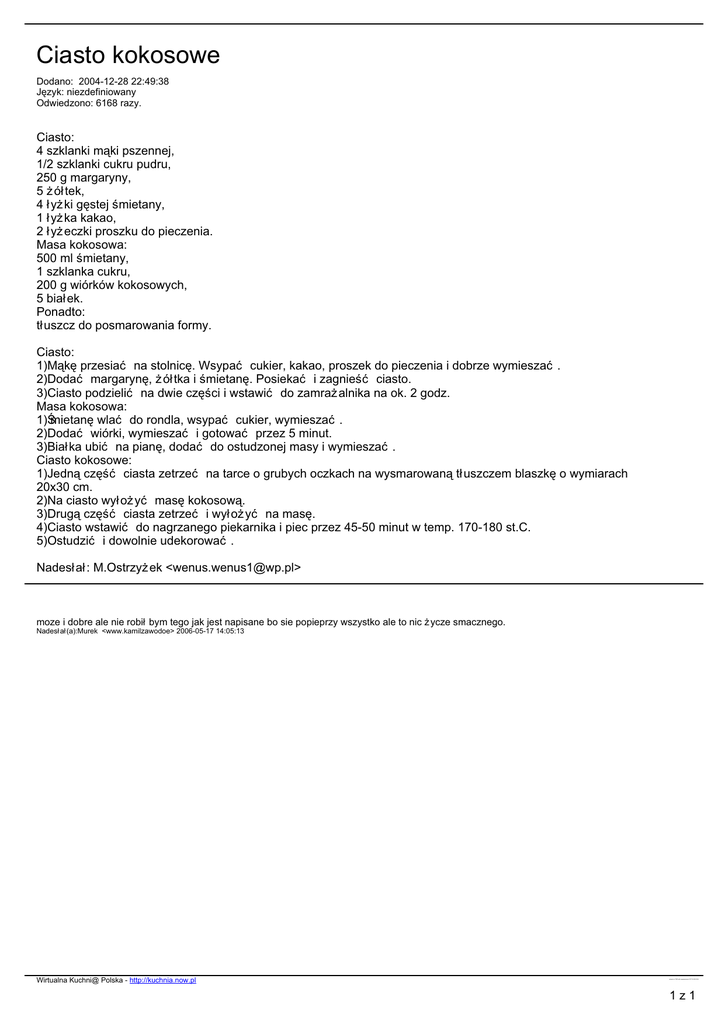 Ciasto kokosowe Dodano: 2004-12-28 22:49:38 Język: niezdefiniowany Odwiedzono: 6168 razy. Ciasto: 4 szklanki mąki pszennej, 1/2 szklanki cukru pudru, 250 g margaryny, 5 żółtek, 4 łyżki gęstej śmietany, 1 łyżka kakao, 2 łyżeczki proszku do pieczenia. Masa kokosowa: 500 ml śmietany, 1 szklanka cukru, 200 g wiórków kokosowych, 5 białek. Ponadto: tłuszcz do posmarowania formy. Ciasto: 1)Mąkę przesiać na stolnicę. Wsypać cukier, kakao, proszek do pieczenia i dobrze wymieszać. 2)Dodać margarynę, żółtka i śmietanę. Posiekać i zagnieść ciasto. 3)Ciasto podzielić na dwie części i wstawić do zamrażalnika na ok. 2 godz. Masa kokosowa: 1)Śmietanę wlać do rondla, wsypać cukier, wymieszać. 2)Dodać wiórki, wymieszać i gotować przez 5 minut. 3)Białka ubić na pianę, dodać do ostudzonej masy i wymieszać. Ciasto kokosowe: 1)Jedną część ciasta zetrzeć na tarce o grubych oczkach na wysmarowaną tłuszczem blaszkę o wymiarach 20x30 cm. 2)Na ciasto wyłożyć masę kokosową. 3)Drugą część ciasta zetrzeć i wyłożyć na masę. 4)Ciasto wstawić do nagrzanego piekarnika i piec przez 45-50 minut w temp. 170-180 st.C. 5)Ostudzić i dowolnie udekorować. Nadesłał: M.Ostrzyżek <[email protected]> moze i dobre ale nie robił bym tego jak jest napisane bo sie popieprzy wszystko ale to nic życze smacznego. Nadesłał(a):Murek <www.kamilzawodoe> 2006-05-17 14:05:13 Wirtualna Kuchni@ Polska - http://kuchnia.now.pl przepis nr 7082, plik wygenerowano 2017.03.08 03:06 1z1