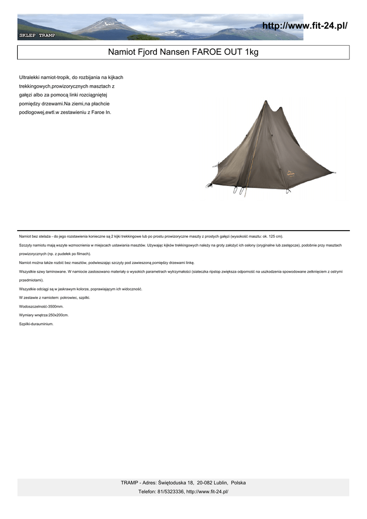 http://www.fit-24.pl/ Namiot Fjord Nansen FAROE OUT 1kg Ultralekki namiot-tropik, do rozbijania na kijkach trekkingowych,prowizorycznych masztach z gałęzi albo za pomocą linki rozciągniętej pomiędzy drzewami.Na ziemi,na płachcie podlogowej,ewtl.w zestawieniu z Faroe In. Namiot bez stelaża - do jego rozstawienia konieczne są 2 kijki trekkingowe lub po prostu prowizoryczne maszty z prostych gałęzi (wysokość masztu: ok. 125 cm). Szczyty namiotu mają wszyte wzmocnienia w miejscach ustawiania masztów. Używając kijków trekkingowych należy na groty założyć ich osłony (oryginalne lub zastępcze), podobnie przy masztach prowizorycznych (np. z pudełek po filmach). Namiot można także rozbić bez masztów, podwieszając szczyty pod zawieszoną pomiędzy drzewami linkę. Wszystkie szwy laminowane. W namiocie zastosowano materiały o wysokich parametrach wytrzymałości (siateczka ripstop zwiększa odporność na uszkodzenia spowodowane zetknięciem z ostrymi przedmiotami). Wszystkie odciągi są w jaskrawym kolorze, poprawiającym ich widoczność. W zestawie z namiotem: pokrowiec, szpilki. Wodoszczelność-3500mm. Wymiary wnętrza:250x200cm. Szpilki-durauminium. TRAMP - Adres: Świętoduska 18, 20-082 Lublin, Polska Telefon: 81/5323336, http://www.fit-24.pl/ http://www.fit-24.pl/ TRAMP - Adres: Świętoduska 18, 20-082 Lublin, Polska Telefon: 81/5323336, http://www.fit-24.pl/