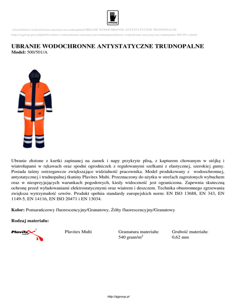 /oferta/Odzież wodoochronna antystatyczna trudnopalna/UBRANIE WODOCHRONNE ANTYSTATYCZNE TRUDNOPALNE https://ajgroup-pros.pl/pl/offer/odziez-wodoochronna-antystatyczna-trudnopalna/ubranie-wodochronne-antystatyczne-trudnopalne-500-501-a.html/ UBRANIE WODOCHRONNE ANTYSTATYCZNE TRUDNOPALNE Model: 500/501/A Ubranie złożone z kurtki zapinanej na zamek i napy przykryte plisą, z kapturem chowanym w stójkę i wiatrołapami w rękawach oraz spodni ogrodniczek z regulowanymi szelkami z elastycznej, szerokiej gumy. Posiada taśmy ostrzegawcze zwiększające widzialność pracownika. Model produkowany z wodoochronnej, antystatycznej i trudnopalnej tkaniny Plavitex Multi. Przeznaczony do użytku w strefach zagrożonych wybuchem oraz w niesprzyjających warunkach pogodowych, kiedy widoczność jest ograniczona. Zapewnia skuteczną ochronę przed wyładowaniami elektrostatycznymi oraz wiatrem i deszczem. Technika obustronnego zgrzewania zwiększa wytrzymałość szwów. Produkt spełnia standardy europejskich norm: EN ISO 13688, EN 343, EN 1149-5, EN 14116, EN ISO 20471 i EN 13034. Kolor: Pomarańczowy fluorescencyjny/Granatowy, Żółty fluorescencyjny/Granatowy Rodzaj materiału: Plavitex Multi Gramatura materiału: 540 gram/m² http://ajgroup.pl Grubość materiału: 0,62 mm Rozmiar: 48, 50, 52, 54, 56, 58, 60, 62 Tabela rozmiarów: S Rozmiar 48 Wzrost 164 Obwód 96-100 klat. piersiowej Obwód w 80-84 pasie M 50 170 100-104 L 52 176 104-108 L 54 176 108-112 XL 56 182 112-116 XXL 58 188 116-120 XXXL 60 194 120-124 XXXXL 62 198 124-128 80-84 84-88 84-88 88-92 92-96 96-100 96-100 Normy: Cechy specyficzne: EN ISO 13688 Odzież ochronna wymagania ogólne. EN 343 Odzież ochronna. Ochrona przed deszczem. EN 1149-5 Odzież ochronna. Właściwości elektrostatyczne. EN ISO 20471 Odzież o intensywnej widzialności. EN ISO 14116 Odzież ochronna. Ochrona przed czynnikami gorącymi i płomieniem. EN 13034 Odzież chroniąca przed ciekłymi chemikaliami. Typ 6 i PB (6). -50ºC Produkt odporny na zginanie przy dużych ujemnych temperaturach. Obustronne zgrzewanie 2 kieszenie Kaptur chowany w stójce Napy przykryte plisą Stójka Taśma ostrzegawcza podwójna Wentylacja oczka pod pachami Wiatrołapy w rękawach Elastyczne szelki wymienne http://ajgroup.pl Powered by TCPDF (www.tcpdf.org)