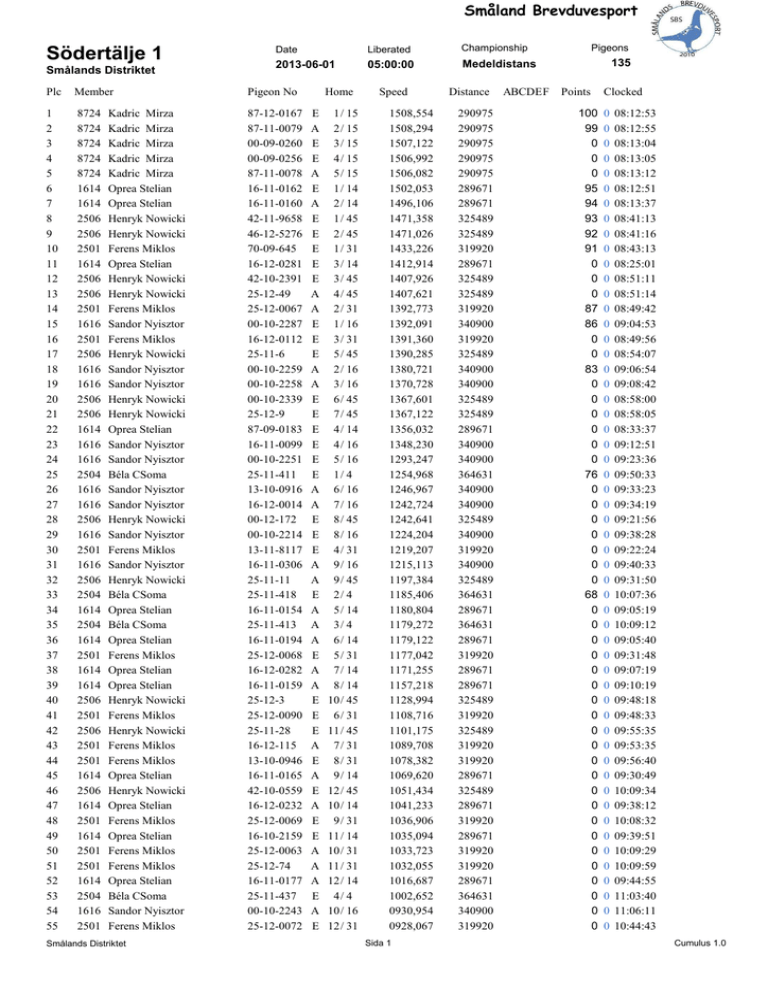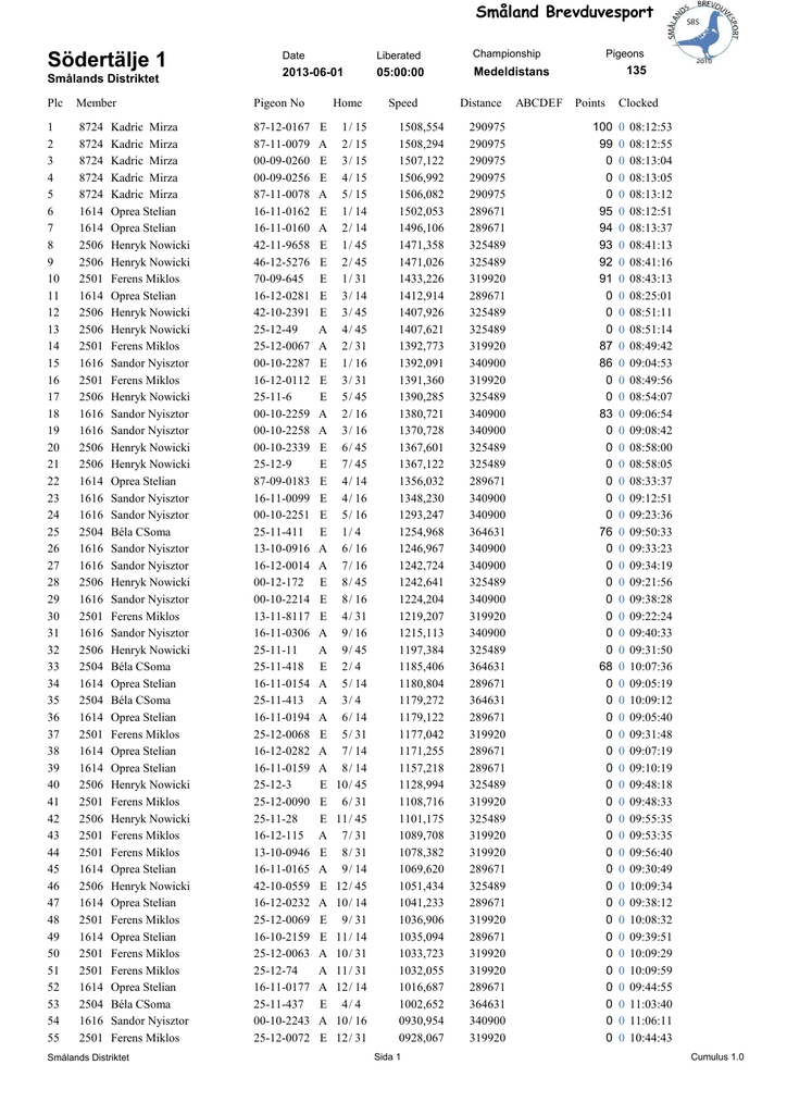 Småland Brevduvesport Södertälje 1 Smålands Distriktet Date Liberated Championship 2013-06-01 05:00:00 Medeldistans Plc Member Pigeon No 1 2 3 4 5 6 7 8 9 10 11 12 13 14 15 16 17 18 19 20 21 22 23 24 25 26 27 28 29 30 31 32 33 34 35 36 37 38 39 40 41 42 43 44 45 46 47 48 49 50 51 52 53 54 55 8724 8724 8724 8724 8724 1614 1614 2506 2506 2501 1614 2506 2506 2501 1616 2501 2506 1616 1616 2506 2506 1614 1616 1616 2504 1616 1616 2506 1616 2501 1616 2506 2504 1614 2504 1614 2501 1614 1614 2506 2501 2506 2501 2501 1614 2506 1614 2501 1614 2501 2501 1614 2504 1616 2501 87-12-0167 87-11-0079 00-09-0260 00-09-0256 87-11-0078 16-11-0162 16-11-0160 42-11-9658 46-12-5276 70-09-645 16-12-0281 42-10-2391 25-12-49 25-12-0067 00-10-2287 16-12-0112 25-11-6 00-10-2259 00-10-2258 00-10-2339 25-12-9 87-09-0183 16-11-0099 00-10-2251 25-11-411 13-10-0916 16-12-0014 00-12-172 00-10-2214 13-11-8117 16-11-0306 25-11-11 25-11-418 16-11-0154 25-11-413 16-11-0194 25-12-0068 16-12-0282 16-11-0159 25-12-3 25-12-0090 25-11-28 16-12-115 13-10-0946 16-11-0165 42-10-0559 16-12-0232 25-12-0069 16-10-2159 25-12-0063 25-12-74 16-11-0177 25-11-437 00-10-2243 25-12-0072 Kadric Mirza Kadric Mirza Kadric Mirza Kadric Mirza Kadric Mirza Oprea Stelian Oprea Stelian Henryk Nowicki Henryk Nowicki Ferens Miklos Oprea Stelian Henryk Nowicki Henryk Nowicki Ferens Miklos Sandor Nyisztor Ferens Miklos Henryk Nowicki Sandor Nyisztor Sandor Nyisztor Henryk Nowicki Henryk Nowicki Oprea Stelian Sandor Nyisztor Sandor Nyisztor Béla CSoma Sandor Nyisztor Sandor Nyisztor Henryk Nowicki Sandor Nyisztor Ferens Miklos Sandor Nyisztor Henryk Nowicki Béla CSoma Oprea Stelian Béla CSoma Oprea Stelian Ferens Miklos Oprea Stelian Oprea Stelian Henryk Nowicki Ferens Miklos Henryk Nowicki Ferens Miklos Ferens Miklos Oprea Stelian Henryk Nowicki Oprea Stelian Ferens Miklos Oprea Stelian Ferens Miklos Ferens Miklos Oprea Stelian Béla CSoma Sandor Nyisztor Ferens Miklos Smålands Distriktet Home E A E E A E A E E E E E A A E E E A A E E E E E E A A E E E A A E A A A E A A E E E A E A E A E E A A A E A E 1 / 15 2 / 15 3 / 15 4 / 15 5 / 15 1 / 14 2 / 14 1 / 45 2 / 45 1 / 31 3 / 14 3 / 45 4 / 45 2 / 31 1 / 16 3 / 31 5 / 45 2 / 16 3 / 16 6 / 45 7 / 45 4 / 14 4 / 16 5 / 16 1/ 4 6 / 16 7 / 16 8 / 45 8 / 16 4 / 31 9 / 16 9 / 45 2/ 4 5 / 14 3/ 4 6 / 14 5 / 31 7 / 14 8 / 14 10 / 45 6 / 31 11 / 45 7 / 31 8 / 31 9 / 14 12 / 45 10 / 14 9 / 31 11 / 14 10 / 31 11 / 31 12 / 14 4/ 4 10 / 16 12 / 31 Speed 1508,554 1508,294 1507,122 1506,992 1506,082 1502,053 1496,106 1471,358 1471,026 1433,226 1412,914 1407,926 1407,621 1392,773 1392,091 1391,360 1390,285 1380,721 1370,728 1367,601 1367,122 1356,032 1348,230 1293,247 1254,968 1246,967 1242,724 1242,641 1224,204 1219,207 1215,113 1197,384 1185,406 1180,804 1179,272 1179,122 1177,042 1171,255 1157,218 1128,994 1108,716 1101,175 1089,708 1078,382 1069,620 1051,434 1041,233 1036,906 1035,094 1033,723 1032,055 1016,687 1002,652 0930,954 0928,067 Sida 1 Distance 290975 290975 290975 290975 290975 289671 289671 325489 325489 319920 289671 325489 325489 319920 340900 319920 325489 340900 340900 325489 325489 289671 340900 340900 364631 340900 340900 325489 340900 319920 340900 325489 364631 289671 364631 289671 319920 289671 289671 325489 319920 325489 319920 319920 289671 325489 289671 319920 289671 319920 319920 289671 364631 340900 319920 ABCDE F Pigeons 135 Points 100 99 0 0 0 95 94 93 92 91 0 0 0 87 86 0 0 83 0 0 0 0 0 0 76 0 0 0 0 0 0 0 68 0 0 0 0 0 0 0 0 0 0 0 0 0 0 0 0 0 0 0 0 0 0 Clocked 0 0 0 0 0 0 0 0 0 0 0 0 0 0 0 0 0 0 0 0 0 0 0 0 0 0 0 0 0 0 0 0 0 0 0 0 0 0 0 0 0 0 0 0 0 0 0 0 0 0 0 0 0 0 0 08:12:53 08:12:55 08:13:04 08:13:05 08:13:12 08:12:51 08:13:37 08:41:13 08:41:16 08:43:13 08:25:01 08:51:11 08:51:14 08:49:42 09:04:53 08:49:56 08:54:07 09:06:54 09:08:42 08:58:00 08:58:05 08:33:37 09:12:51 09:23:36 09:50:33 09:33:23 09:34:19 09:21:56 09:38:28 09:22:24 09:40:33 09:31:50 10:07:36 09:05:19 10:09:12 09:05:40 09:31:48 09:07:19 09:10:19 09:48:18 09:48:33 09:55:35 09:53:35 09:56:40 09:30:49 10:09:34 09:38:12 10:08:32 09:39:51 10:09:29 10:09:59 09:44:55 11:03:40 11:06:11 10:44:43 Cumulus 1.0 Småland Brevduvesport Plc Member Pigeon No 56 57 58 59 60 61 62 63 64 65 66 67 68 69 70 71 72 73 74 75 76 77 78 79 80 81 82 1616 2506 2506 2506 1616 2501 2506 2506 2506 2506 2506 2506 2506 2506 2506 2506 2506 2501 2506 2501 2506 2501 2506 2506 2506 2501 2506 16-12-0004 00-10-2469 39-09-5725 25-12-8 16-12-0031 25-12-76 25-11-36 02-09-7307 25-12-5 00-10-2492 25-12-45 25-11-1 25-12-33 25-11-3 25-12-13 25-11-25 25-12-26 76-10-349 00-10-2463 25-11-113 25-12-44 25-09-39 42-11-9663 25-12-34 42-10-2390 13-10-0937 25-12-21 Sandor Nyisztor Henryk Nowicki Henryk Nowicki Henryk Nowicki Sandor Nyisztor Ferens Miklos Henryk Nowicki Henryk Nowicki Henryk Nowicki Henryk Nowicki Henryk Nowicki Henryk Nowicki Henryk Nowicki Henryk Nowicki Henryk Nowicki Henryk Nowicki Henryk Nowicki Ferens Miklos Henryk Nowicki Ferens Miklos Henryk Nowicki Ferens Miklos Henryk Nowicki Henryk Nowicki Henryk Nowicki Ferens Miklos Henryk Nowicki Smålands Distriktet Home A A A A E E E A A A A A E E A A A A A A E E E A E E A 11 / 16 13 / 45 14 / 45 15 / 45 12 / 16 13 / 31 16 / 45 17 / 45 18 / 45 19 / 45 20 / 45 21 / 45 22 / 45 23 / 45 24 / 45 25 / 45 26 / 45 14 / 31 27 / 45 15 / 31 28 / 45 16 / 31 29 / 45 30 / 45 31 / 45 17 / 31 32 / 45 Speed 0917,919 0840,912 0814,809 0772,277 0768,514 0737,596 0722,934 0659,218 0617,177 0612,301 0585,061 0556,185 0539,216 0537,244 0533,428 0530,112 0523,898 0517,015 0506,716 0457,737 0440,863 0421,409 0415,182 0402,750 0393,816 0381,031 0376,694 Sida 2 Distance 340900 325489 325489 325489 340900 319920 325489 325489 325489 325489 325489 325489 325489 325489 325489 325489 325489 319920 325489 319920 325489 319920 325489 325489 325489 319920 325489 ABCDE F Points Clocked 0 0 0 0 0 0 0 0 0 0 0 0 0 0 0 0 0 0 0 0 0 0 0 0 0 0 0 0 0 0 0 0 0 0 0 0 0 0 0 0 0 0 0 0 0 0 0 0 0 0 0 0 0 0 11:11:23 11:27:04 11:39:28 12:01:28 12:23:35 12:13:44 