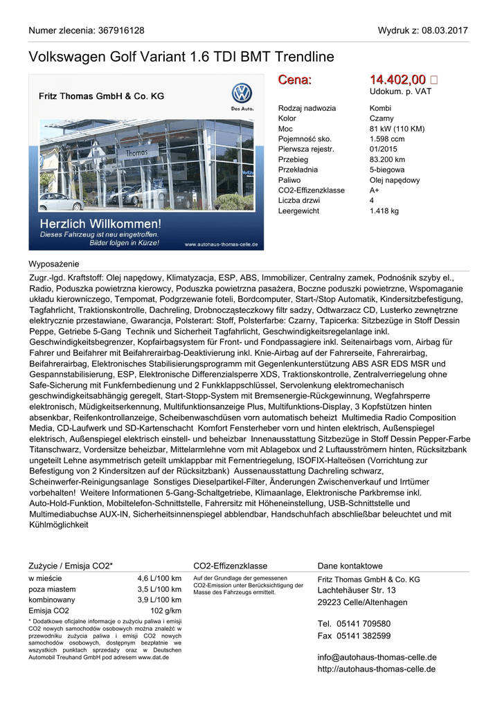 Numer zlecenia: 367916128 Wydruk z: 08.03.2017 Volkswagen Golf Variant 1.6 TDI BMT Trendline Cena: 14.402,00 Rodzaj nadwozia Kolor Moc Pojemność sko. Pierwsza rejestr. Przebieg Przekładnia Paliwo CO2-Effizenzklasse Liczba drzwi Leergewicht Kombi Czarny 81 kW (110 KM) 1.598 ccm 01/2015 83.200 km 5-biegowa Olej napędowy A+ 4 1.418 kg Udokum. p. VAT Wyposażenie Zugr.-lgd. Kraftstoff: Olej napędowy, Klimatyzacja, ESP, ABS, Immobilizer, Centralny zamek, Podnośnik szyby el., Radio, Poduszka powietrzna kierowcy, Poduszka powietrzna pasażera, Boczne poduszki powietrzne, Wspomaganie układu kierowniczego, Tempomat, Podgrzewanie foteli, Bordcomputer, Start-/Stop Automatik, Kindersitzbefestigung, Tagfahrlicht, Traktionskontrolle, Dachreling, Drobnocząsteczkowy filtr sadzy, Odtwarzacz CD, Lusterko zewnętrzne elektrycznie przestawiane, Gwarancja, Polsterart: Stoff, Polsterfarbe: Czarny, Tapicerka: Sitzbezüge in Stoff Dessin Peppe, Getriebe 5-Gang Technik und Sicherheit Tagfahrlicht, Geschwindigkeitsregelanlage inkl. Geschwindigkeitsbegrenzer, Kopfairbagsystem für Front- und Fondpassagiere inkl. Seitenairbags vorn, Airbag für Fahrer und Beifahrer mit Beifahrerairbag-Deaktivierung inkl. Knie-Airbag auf der Fahrerseite, Fahrerairbag, Beifahrerairbag, Elektronisches Stabilisierungsprogramm mit Gegenlenkunterstützung ABS ASR EDS MSR und Gespannstabilisierung, ESP, Elektronische Differenzialsperre XDS, Traktionskontrolle, Zentralverriegelung ohne Safe-Sicherung mit Funkfernbedienung und 2 Funkklappschlüssel, Servolenkung elektromechanisch geschwindigkeitsabhängig geregelt, Start-Stopp-System mit Bremsenergie-Rückgewinnung, Wegfahrsperre elektronisch, Müdigkeitserkennung, Multifunktionsanzeige Plus, Multifunktions-Display, 3 Kopfstützen hinten absenkbar, Reifenkontrollanzeige, Scheibenwaschdüsen vorn automatisch beheizt Multimedia Radio Composition Media, CD-Laufwerk und SD-Kartenschacht Komfort Fensterheber vorn und hinten elektrisch, Außenspiegel elektrisch, Außenspiegel elektrisch einstell- und beheizbar Innenausstattung Sitzbezüge in Stoff Dessin Pepper-Farbe Titanschwarz, Vordersitze beheizbar, Mittelarmlehne vorn mit Ablagebox und 2 Luftausströmern hinten, Rücksitzbank ungeteilt Lehne asymmetrisch geteilt umklappbar mit Fernentriegelung, ISOFIX-Halteösen (Vorrichtung zur Befestigung von 2 Kindersitzen auf der Rücksitzbank) Aussenausstattung Dachreling schwarz, Scheinwerfer-Reinigungsanlage Sonstiges Dieselpartikel-Filter, Änderungen Zwischenverkauf und Irrtümer vorbehalten! Weitere Informationen 5-Gang-Schaltgetriebe, Klimaanlage, Elektronische Parkbremse inkl. Auto-Hold-Funktion, Mobiltelefon-Schnittstelle, Fahrersitz mit Höheneinstellung, USB-Schnittstelle und Multimediabuchse AUX-IN, Sicherheitsinnenspiegel abblendbar, Handschuhfach abschließbar beleuchtet und mit Kühlmöglichkeit Zużycie / Emisja CO2* w mieście poza miastem kombinowany Emisja CO2 4,6 L/100 km 3,5 L/100 km 3,9 L/100 km 102 g/km * Dodatkowe oficjalne informacje o zużyciu paliwa i emisji CO2 nowych samochodów osobowych można znaleźć w przewodniku zużycia paliwa i emisji CO2 nowych samochodów osobowych, dostępnym bezpłatnie we wszystkich punktach sprzedaży oraz w Deutschen Automobil Treuhand GmbH pod adresem www.dat.de CO2-Effizenzklasse Dane kontaktowe Auf der Grundlage der gemessenen CO2-Emission unter Berücksichtigung der Masse des Fahrzeugs ermittelt. Fritz Thomas GmbH & Co. KG Lachtehäuser Str. 13 29223 Celle/Altenhagen Tel. 05141 709580 Fax 05141 382599 [email protected] http://autohaus-thomas-celle.de Numer zlecenia: 367916128 Volkswagen Golf Variant 1.6 TDI BMT Trendline Wydruk z: 08.03.2017