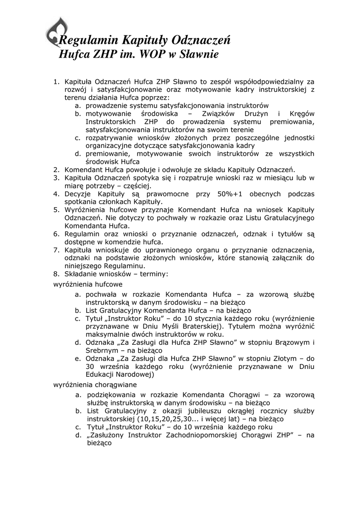 Regulamin Kapituły Odznaczeń Hufca ZHP im. WOP w Sławnie 1. Kapituła Odznaczeń Hufca ZHP Sławno to zespół współodpowiedzialny za rozwój i satysfakcjonowanie oraz motywowanie kadry instruktorskiej z terenu działania Hufca poprzez: a. prowadzenie systemu satysfakcjonowania instruktorów b. motywowanie środowiska – Związków DruŜyn i Kręgów Instruktorskich ZHP do prowadzenia systemu premiowania, satysfakcjonowania instruktorów na swoim terenie c. rozpatrywanie wniosków złoŜonych przez poszczególne jednostki organizacyjne dotyczące satysfakcjonowania kadry d. premiowanie, motywowanie swoich instruktorów ze wszystkich środowisk Hufca 2. Komendant Hufca powołuje i odwołuje ze składu Kapituły Odznaczeń. 3. Kapituła Odznaczeń spotyka się i rozpatruje wnioski raz w miesiącu lub w miarę potrzeby – częściej. 4. Decyzje Kapituły są prawomocne przy 50%+1 obecnych podczas spotkania członkach Kapituły. 5. WyróŜnienia hufcowe przyznaje Komendant Hufca na wniosek Kapituły Odznaczeń. Nie dotyczy to pochwały w rozkazie oraz Listu Gratulacyjnego Komendanta Hufca. 6. Regulamin oraz wnioski o przyznanie odznaczeń, odznak i tytułów są dostępne w komendzie hufca. 7. Kapituła wnioskuje do uprawnionego organu o przyznanie odznaczenia, odznaki na podstawie złoŜonych wniosków, które stanowią załącznik do niniejszego Regulaminu. 8. Składanie wniosków – terminy: wyróŜnienia hufcowe a. pochwała w rozkazie Komendanta Hufca – za wzorową słuŜbę instruktorską w danym środowisku – na bieŜąco b. List Gratulacyjny Komendanta Hufca – na bieŜąco c. Tytuł „Instruktor Roku” – do 10 stycznia kaŜdego roku (wyróŜnienie przyznawane w Dniu Myśli Braterskiej). Tytułem moŜna wyróŜnić maksymalnie dwóch instruktorów w roku. d. Odznaka „Za Zasługi dla Hufca ZHP Sławno” w stopniu Brązowym i Srebrnym – na bieŜąco e. Odznaka „Za Zasługi dla Hufca ZHP Sławno” w stopniu Złotym – do 30 września kaŜdego roku (wyróŜnienie przyznawane w Dniu Edukacji Narodowej) wyróŜnienia chorągwiane a. podziękowania w rozkazie Komendanta Chorągwi – za wzorową słuŜbę instruktorską w danym środowisku – na bieŜąco b. List Gratulacyjny z okazji jubileuszu okrągłej rocznicy słuŜby instruktorskiej (10,15,20,25,30... i więcej lat) – na bieŜąco c. Tytuł „Instruktor Roku” – do 10 września kaŜdego roku d. „ZasłuŜony Instruktor Zachodniopomorskiej Chorągwi ZHP” – na bieŜąco odznaczenia i odznaki Związkowe – na bieŜąco: a. Harcerskie Odznaczenie Honorowe KrzyŜ „Za zasługi dla ZHP” (srebrny, złoty) b. Honorowy tytuł „Senior ZHP” c. Honorowa Odznaka Ruchu Przyjaciół Harcerstwa ZHP (srebrna, złota) d. Honorowe WyróŜnienie „Niezawodnemu Przyjacielowi” wszystkie odznaczenia państwowe – do 30 stycznia roku kalendarzowego: a. b. c. d. e. KrzyŜ Zasługi – Złoty, Srebrny, Brązowy Medal Edukacji Narodowej Medal za Zasługi dla Obronności Kraju KrzyŜ Zasługi za Dzielność Medal za Ofiarność i Odwagę 9. Regulamin został zatwierdzony na posiedzeniu Komendy w dniu 28.10.2008 r.