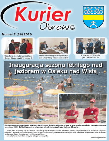 Numer 2 (34) 2016 Udzielono absolutorium Wójtowi Gminy Obrowo za 2015 rok str. 2 Przebudowa drogi w miejscowości Osiek nad Wisłą - Stajenczynki str. 9 Rubinowy HIT 2016 dla gm. Obrowo - str. 21 Inauguracja sezonu letniego nad jeziorem w Osieku nad Wisłą Bezpieczny urlop to podstawa udanego wypoczynku, dlatego też kąpiących się w osieckim jeziorze ludzi strzegą codziennie w godz. od 10:00 do 18:00 zawodowi ratownicy, zatrudnieni przez Urząd Gminy w Obrowie. Sezon letni rozpoczął się 25 czerwca, a zakończy się 28 sierpnia 2016 r. Na mieszkańców i turystów czeka też boisko do siatkówki plażowej i dmuchane zjeżdżalnie dla dzieci, a także duży parking dla samochodów wytyczony specjalnie przy lesie na przeciw Środowiskowego Domu Samopomocy w Osieku nad Wisłą. Mieszkańcom i turystom życzymy miłego wypoczynku. Joanna Myszkowska 2 KURIER OBROWA Udzielono absolutorium Wójtowi Gminy Obrowo za 2015 rok W dniu 2 czerwca 2016 roku Rada Gminy Obrowo podjęła jednogłośnie uchwałę w sprawie udzielenia absolutorium Wójtowi Gminy Obrowo za 2015 rok. Wykonanie budżetu za rok 2015 pozytywnie zaopiniowała Regionalna Izba Obrachunkowa oraz Komisje Rady Gminy w Obrowie. Łącznie na inwestycje wydano środki pieniężne w wysokości 7,5 mln zł, a wydatki gminy ogółem wyniosły 52,2 mln zł. W pozycjach budżetu gminy największe wartości dotyczą wydatków na oświatę, które kształtowały się na poziomie 21,6 mln zł i na pomoc społeczną 7,1 mln zł. W 2015 roku kontynuowano budowę kanalizacji Głogowo-Brzozówka, powstały nowe nitki wodociągu, wybudowano i zmodernizowano drogi gminne oraz przeprowadzono remont budynku urzędu gminy. Gmina dofinansowała również m.in. przedszkola niepubliczne działające na terenie gminy, budowę oczyszczalni przydomowych, kolektorów słonecznych i pomp ciepła, a także zadbała o dobry wizerunek lokalnych społeczności, poprzez bieżące usuwanie dzikich wysypisk śmieci, porządkowanie chodników, czy przydrożnych rowów. XXX Zgromadzenie Ogólne Związku Gmin Wiejskich Rzeczypospolitej Polskiej W dniach 18-19 kwietnia 2016 r. w Warszawie odbyło się XXX Zgromadzenie Ogólne Związku Gmin Wiejskich Rzeczypospolitej Polskiej, w którym uczestniczył m.in. wójt gminy Obrowo Andrzej Wieczyński i wiceprzewodniczący Rady Gminy Roman Skórski, a także kierownik referatu organizacyjno-oświatowego Urzędu Gminy Obrowo Marzena Słupczewska i podinspektor ds. koordynacji pracy komórki ds. świadczeń rodzinnych w oddziale zamiejscowym GOPS w Dobrzejewicach Beata Modrzyk – Dobrzyńska. Debata merytoryczna dotyczyła problemów gmin wiejskich i miejsko - wiejskich w zakresie zadań oświatowych (zmiany systemu edukacji pn. "Uczeń-rodzic-nauczyciel"), pomocy społecznej (Program 500+), a także finansowania obszarów wiejskich i paktów dla obszarów wiejskich - szansą dla rozwoju wsi. Przedstawiciele z Ministerstwa Edukacji Narodowej, Ministerstwa Rodziny, Pracy i Polityki Społecznej, a także Ministerstwa Środowiska i Ministerstwa Rozwoju, w ciągu dwóch dni próbowali odpowiedzieć na nurtujące samorządowców problemy. Jak większość zebranych zgromadzenia stwierdziła, debata merytoryczna była ciekawa, ale nurtujące problemy pozostały i na ich rozwiązanie zapewne przyjdzie jeszcze trochę poczekać, podkreślił na zakończenie obrad przewodniczący XXX ZOZGWRP pan Marek Olszewski. KURIER OBROWA 3 Gminne obchody Dnia Strażaka 14 maja 2016 r. w Zespole Szkół w Dobrzejewicach obchodziliśmy Gminny Dzień Strażaka, który był sposobnością do podziękowań dla wszystkich ludzi dobrego serca biorących udział w akcji usuwania skutków nawałnicy, jaka przeszła przez gminę Obrowo 19 lipca 2015 r. Po uroczystej mszy świętej w kościele pw. św. Wawrzyńca w Dobrzejewicach oraz przemarszu korowodu na cmentarz parafialny i pod pomnik poległych strażaków podczas II wojny światowej, zgromadzeni spotkali się na sali gimnastycznej ZS w Dobrzejewicach, gdzie zostały wręczone podziękowania. Wójt gminy Obrowo Andrzej Wieczyński podziękował za trud i ofiarność jaką wykazali się: strażacy z Państwowej Straży Pożarnej, strażacy z Ochotniczych Straży Pożarnych z terenu gminy Obrowo, powiatu i województwa, strażnikom leśnym, policjantom, strażnikom straży gminnej w Obrowie, przedstawicielom jednostek samorządowych, sponsorom oraz wszystkim ludziom zaangażowanym w akcję szybkiej i sumiennej pomocy bliźniemu. Podziękowania otrzymali: 1. Pani Teresa Piotrowska – Poseł na Sejm Rzeczypospolitej Polskiej; 2. Pan Józef Ramlau zastępca wojewody, który odebrał podziękowania dla Wojewody Kujawsko-Pomorskiego Pana Mikołaja Bogdanowicza; 3. Pan Tadeusz Wierzba Dyrektor Wydziału Ochrony Ludności Urzędu Miasta, który odebrał podziękowania dla Prezydenta Miasta Torunia Pana Michała Zalewskiego; 4. Pan Piotr Całbecki– Marszałek Województwa Kujawsko-Pomorskiego; 5. Pan Mirosław Graczyk – Starosta Toruński; 6. Pan Tomasz Zakrzewski – Przewodniczący Rady Powiatu; 7. Pan Grzegorz Karpiński; 8. Pan Kazimierz Stafiej – Komendant Miejski Państwowej Straży Pożarnej w Toruniu; 9. Pan Dariusz Fabisiak – Naczelnik wydziału operacyjno-szkoleniowego; 10. Pan Adam RobaczewskiDowódca Jednostki Gaśniczo – Pożarniczej nr 3; 11. Pan Maciej Lewandowski– Komendant Miejski Policji w Toruniu; 12. Pan Janusza Halak - Komendant Wojewódzki Państwowej Straży Pożarnej w Toruniu; 13. Pan Piotr Rozwadowski – Prezes MPO Toruń; 14. Pan Dariusz Strzelecki, Bronisław Malanowski, Piotr Lisiński właściciele Firmy Betpol; 15. Pani Alicja Tarkowska – Radna Rady gminy Obrowo i sołtys wsi Zawały; 16. Pan Ireneusz Lewandowski – Komendant Policji w Lubiczu; 17. Pan Sławomir Kamiński – Zastępca Komendanta Pań- stwowej Straży w Toruniu; 18. Pan Sławomir Paluszyński - Zastępca Komendanta Państwowej Straży w Toruniu; 19. OSP Czernikowo, OSP z Firlusa, OSP z Gręboci