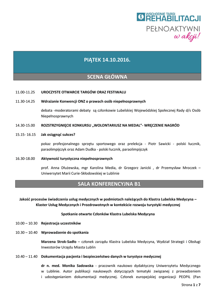 PIĄTEK 14.10.2016. SCENA GŁÓWNA 11.00-11.25 UROCZYSTE OTWARCIE TARGÓW ORAZ FESTIWALU 11.30-14.25 Wdrażanie Konwencji ONZ o prawach osób niepełnosprawnych debata -moderatorami debaty są członkowie Lubelskiej Wojewódzkiej Społecznej Rady d/s Osób Niepełnosprawnych 14.30-15.00 ROZSTRZYGNIĘCIE KONKURSU „WOLONTARIUSZ NA MEDAL”- WRĘCZENIE NAGRÓD 15.15- 16.15 Jak osiągnąć sukces? pokaz profesjonalnego sprzętu sportowego oraz prelekcja - Piotr Sawicki - polski łucznik, paraolimpijczyk oraz Adam Dudka - polski łucznik, paraolimpijczyk 16.30-18.00 Aktywność turystyczna niepełnosprawnych prof. Anna Dłużewska, mgr Karolina Media, dr Grzegorz Janicki , dr Przemysław Mroczek – Uniwersytet Marii Curie-Skłodowskiej w Lublinie SALA KONFERENCYJNA B1 Jakość procesów świadczenia usług medycznych w podmiotach należących do Klastra Lubelska Medycyna – Klaster Usług Medycznych i Prozdrowotnych w kontekście rozwoju turystyki medycznej Spotkanie otwarte Członków Klastra Lubelska Medycyna 10.00 – 10.30 Rejestracja uczestników 10.30 – 10.40 Wprowadzenie do spotkania Marzena Strok-Sadło – członek zarządu Klastra Lubelska Medycyna, Wydział Strategii i Obsługi Inwestorów Urzędu Miasta Lublin 10.40 – 11.40 Dokumentacja pacjenta i bezpieczeństwo danych w turystyce medycznej dr n. med. Monika Sadowska - pracownik naukowo dydaktyczny Uniwersytetu Medycznego w Lublinie. Autor publikacji naukowych dotyczących tematyki związanej z prowadzeniem i udostępnianiem dokumentacji medycznej. Członek europejskiej organizacji PEOPIL (Pan Strona 1 z 7 European Organisation of Personal Injury Lawyers) zrzeszającej prawników specjalizujących się w sprawach dotyczących uszkodzeń ciała lub rozstroju zdrowia. Praktykę z zakresu prawa zdobywa w Kancelarii Adwokackiej pod patronatem mec. Wiktora Pieleckiego. 11.40 – 12.00 Dyskusja 12.00 – 12.20 Obserwatorium Turystyki Medycznej Klastra Lubelska Medycyna. Podsumowanie wyników badań rynkowych w zakresie oceny jakości usług medycznych w Lublinie w opinii obcokrajowców Iwona Urban – Biuro Klastra Lubelska Medycyna, Wydział Strategii i Obsługi Inwestorów Urzędu Miasta Lublin 12.20 –12.40 Organizacja procesów świadczenia usług w podmiotach Klastra w kontekście rozwoju turystyki medycznej przyjazdowej. Dotychczasowe doświadczenia, projektowane działania Marzena Strok-Sadło – Biuro Klastra Lubelska Medycyna. 12.40 – 14.00 Prezentacja członków Klastra 14.00 –14.10 Podsumowanie spotkania Marzena Strok- Sadło SALA KONFERENCYJNA B2 10.00 – 11.55 PFRON – komu i jak pomaga? - konferencja otwarta 25 lat PFRON, pomoc dla Osób Niepełnosprawnych, wsparcie Pracodawców, współpraca z organizacjami pozarządowymi, dyżur ekspercki – możliwość zadawania pytań. 12.00- 14.00 Reaktywacja marki „Ortopedia by Meyra” - szkolenie zamknięte Nowa linia produktów Premium w marce ViteaCare - szkolenie zamknięte 15.00- 16.30 Zastosowanie innowacyjnego sprzętu ortopedycznego w chorobie zwyrodnieniowej stawu biodrowego i kolanowego - szkolenie zamknięte 16.30 -18.00 Nowelizacja ustawy refundacyjnej- mec. Wojciech Schefke - szkolenie zamknięte SOBOTA 15.10.2016. SCENA GŁÓWNA Strona 2 z 7 10.15-10.55 Innowacyjne rozwiązania dla osób niewidomych Rafał Stępień 11.00-11.55 Zagraniczne wyprawy słabowidzącego podróżnika Dominik Łysiak - fizjoterapeuta i podróżnik 12.00- 14.00 Różnorodne formy rehabilitacji ruchowej i społecznej osób niepełnosprawnych, w tym: 12.00-12.10 Rozpoczęcie, przywitanie gości i przedstawienie programu 12.10-12.20 Wsparcie osób niepełnosprawnych – dofinansowanie zakupu sprzętu rehabilitacyjnego Aneta Łońska - dyr. Powiatowego Centrum Pomocy Rodzinie w Lublinie 12.20-12.30 Refundacja środków zaopatrzenia medycznego wystąpienie przedstawiciela NFZ 12.30 -12.40 Rehabilitacja w Domach Pomocy Społecznej Ewa Wawruch 12.40- 13.00 Animaloterapia Mariusz Korczyński 13.00-13.15 Rehabilitacja - przygoda, nadzieja- wyjątkowość hipoterapii Paulina Amain 13.15 - 13.25 Rola zwierząt w mojej drodze do sprawności Julia Grela 13.25 –13.40 Słyszę, ale nie słucham- Metoda Tomatisa w praktyce Katarzyna Sienkiewicz 13.40 – 14.00 Dobór sprzętu rehabilitacyjnego u osób przewlekle i stale niepełnosprawnych 15.00 -16:00 Wręczenie nagród - Festiwal Pełnoaktywni w Akcji, podsumowanie festiwalu SALA KONFERENCYJNA B1 Rehabilitacja we współczesnej medycynie - propozycje środowiska medycznego w województwie lubelskim 9.30 - 10.00 Rejestracja 10.00 - 10.20 Otwarcie konferencji Strona 3 z 7 prof. dr hab. n. med. Mirosław Jabłoński – Prorektor ds. Klinicznych Uniwersytetu Medycznego w Lublinie, Kierownik Katedry i Kliniki Rehabilitacji i Ortopedii UM w Lublinie. prof. nadzw. dr hab. n. med. Piotr Majcher - Kierownik Zakładu Rehabilitacji i Fizjoterapii Katedry Rehabilitacji, Fizjoterapii i Balneoterapii Uniwersytetu Medycznego w Lublinie. Kierownik Ośrodka Rehabilitacji Centrum Onkologii Ziemi Lubelskiej im. Św. Jana z Dukli w Lublinie. Konsultant wojewódzki w dziedzinie rehabilitacji medycznej w województwie lubelskim. dr n. med. Anna Krawczyńska - konsultant wojewódzki w dziedzinie fizjoterapii w województwie lubelskim, Zakład Fizjoterapii Samodzielnego Publicznego Szpitala Klinicznego nr 4 w Lublinie Marzena Strok-Sadło - członek zarządu Klastra Lubelska Medycyna, Wydział Strategii i Obsługi Inwestorów Urzędu Miasta Lublin. 10.20 - 11.20 Rehabilitacja dziecięca Moderator - dr n. med. Jolanta Niewiedzioł - Z-ca Dyrektora ds. Lecznictwa Uniwersyteckiego Szpitala Dziecięcego w Lublinie Prezentacje : 1. Wyzwania jakie niesie Międzynarodowa Klasyfikacja Funkcjonowania, Niepełnosprawności i Zdrowia (ICF ) oraz Konwencja ONZ o Prawach Osób Niepełnosprawnych Maria Król - przewodnicząca Stowarzyszenia Pomocy Dzieciom Niepełnosprawnym „Krok za krokiem”. 2. Rehabilitacja dzieci ryzyka dr n. med. Jolanta Taczała – lekarz kieruj