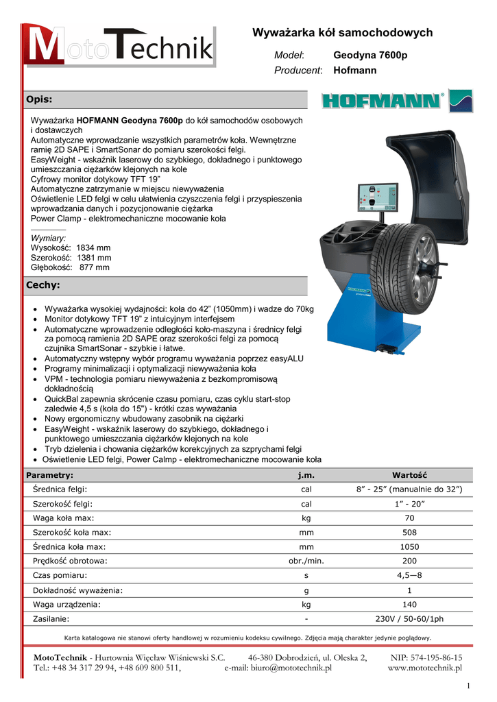 Wyważarka kół samochodowych Model: Geodyna 7600p Producent: Hofmann Opis: Wyważarka HOFMANN Geodyna 7600p do kół samochodów osobowych i dostawczych Automatyczne wprowadzanie wszystkich parametrów koła. Wewnętrzne ramię 2D SAPE i SmartSonar do pomiaru szerokości felgi. EasyWeight - wskaźnik laserowy do szybkiego, dokładnego i punktowego umieszczania ciężarków klejonych na kole Cyfrowy monitor dotykowy TFT 19” Automatyczne zatrzymanie w miejscu niewyważenia Oświetlenie LED felgi w celu ułatwienia czyszczenia felgi i przyspieszenia wprowadzania danych i pozycjonowanie ciężarka Power Clamp - elektromechaniczne mocowanie koła Wymiary: Wysokość: 1834 mm Szerokość: 1381 mm Głębokość: 877 mm Cechy: Wyważarka wysokiej wydajności: koła do 42” (1050mm) i wadze do 70kg Monitor dotykowy TFT 19” z intuicyjnym interfejsem Automatyczne wprowadzenie odległości koło-maszyna i średnicy felgi za pomocą ramienia 2D SAPE oraz szerokości felgi za pomocą czujnika SmartSonar - szybkie i łatwe. Automatyczny wstępny wybór programu wyważania poprzez easyALU Programy minimalizacji i optymalizacji niewyważenia koła VPM - technologia pomiaru niewyważenia z bezkompromisową dokładnością QuickBal zapewnia skrócenie czasu pomiaru, czas cyklu start-stop zaledwie 4,5 s (koła do 15") - krótki czas wyważania Nowy ergonomiczny wbudowany zasobnik na ciężarki EasyWeight - wskaźnik laserowy do szybkiego, dokładnego i punktowego umieszczania ciężarków klejonych na kole Tryb dzielenia i chowania ciężarków korekcyjnych za szprychami felgi Oświetlenie LED felgi, Power Calmp - elektromechaniczne mocowanie koła Parametry: j.m. Wartość Średnica felgi: cal 8” - 25” (manualnie do 32”) Szerokość felgi: cal 1” - 20” Waga koła max: kg 70 Szerokość koła max: mm 508 Średnica koła max: mm 1050 Prędkość obrotowa: obr./min. 200 Czas pomiaru: s 4,5—8 Dokładność wyważenia: g 1 kg 140 - 230V / 50-60/1ph Waga urządzenia: Zasilanie: Karta katalogowa nie stanowi oferty handlowej w rozumieniu kodeksu cywilnego. Zdjęcia mają charakter jedynie poglądowy. MotoTechnik - Hurtownia Więcław Wiśniewski S.C. 46-380 Dobrodzień, ul. Oleska 2, Tel.: +48 34 317 29 94, +48 609 800 511, e-mail: [email protected] NIP: 574-195-86-15 www.mototechnik.pl 1 Wyważarka kół samochodowych Model: Geodyna 7600p Producent: Hofmann Wymiary: Karta katalogowa nie stanowi oferty handlowej w rozumieniu kodeksu cywilnego. Zdjęcia mają charakter jedynie poglądowy. MotoTechnik - Hurtownia Więcław Wiśniewski S.C. 46-380 Dobrodzień, ul. Oleska 2, Tel.: +48 34 317 29 94, +48 609 800 511, e-mail: [email protected] NIP: 574-195-86-15 www.mototechnik.pl 2