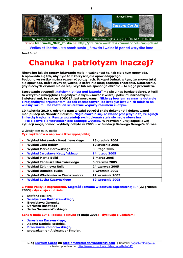 1 Strona Mancinelli_NMP_Polska na: http://jozefbizon.wordpress.com/mancinelli-nmp-polska/ Veritas et libertas ultra omnis sunto _ Prawda i wolność ponad wszystko inne Józef Bizoń Chanuka i patriotyzm inaczej? Nieważne jak się rzeczy faktycznie mają – ważne jest to, jak się o tym opowiada. A opowiada się tak, aby było to z korzyścią dla opowiadającego. Podobno wszystko można rozeznać po czynach. Szkopuł jednak w tym, że znowu tutaj się opowiada, które czyny są ważne, a które nie mają żadnego znaczenia. Ostatecznie, gdy niecnych czynów nie da się ukryć lub nie sposób je obronić – to się je przemilcza. Stosowanie strategii „najciemniej jest pod latarnią” ma się u nas bardzo dobrze. A jeśli to wszystko umiejętnie i sugestywnie wymiksować z wiarą i polskimi narodowymi świętościami, to sukces SOROSA jest murowany. Nikłe są bowiem szanse na dotarcie z racjonalnymi argumentami do tak zaczadzonych, bo brak już jest u nich miejsca na własny rozum – bo został on skutecznie wyparty rozumem cudzym. 10 kwietnia 2010 r. odsłania nam w całej ostrości skalę dokonanej i dokonywanej manipulacji na Narodzie Polskim. Nagle okazało się, że ważne jest jedynie to, że zginęli śmiercią tragiczną. Reszta wcześniejszych dokonań stała się nagle nieważna – i to o dziwo dla wszystkich bez żadnego wyjątku. W rozwikłaniu tej zagadkowej sytuacji mogą pomóc wykłady odbyte w 2005 r. w Fundacji Batorego George’a Sorosa. Wykłady tam m.in. mieli: Cykl wykładów o naprawie Rzeczypospolitej. Wykład Aleksandra Kwaśniewskiego 13 grudnia 2004 Wykład Jana Rokity 10 stycznia 2005 Wykład Marka Borowskiego 3 lutego 2005 Wykład Jarosława Kaczyńskiego 14 lutego 2005 Wykład Marka Belki 3 marca 2005 Wykład Tadeusza Mazowieckiego 6 czerwca 2005 Wykład Zbigniewa Religi 24 czerwca 2005 Wykład Donalda Tuska 6 września 2005 Wykład Włodzimierza Cimoszewicza 12 września 2005 Wykład Lecha Kaczyńskiego 19 września 2005 Z cyklu Polityka zagraniczna. Ciągłość i zmiana w polityce zagranicznej RP (22 grudnia 2005) - dyskusja z udziałem: Stefana Mellera, Władysława Bartoszewskiego, Bronisława Geremka, Dariusza Rosatiego Jacka Saryusz-Wolskiego. Sens 9 maja 1945 i polska polityka (4 maja 2005) - dyskusja z udziałem: Jarosława Kaczyńskiego, Adama Daniela Rotfelda, Bronisława Komorowskiego, prowadzenie - Aleksander Smolar. Blog Sursum Corda na http://jozefbizon.wordpress.com | Kontakt: [email protected] z także uprzednio na: http://www.propolonia.pl/blog.php?bid=142 2 14 lutego 2005 r. Jarosław Kaczyński w swym wykładzie m.in. powiedział: http://www.batory.org.pl/doc/jkaczynski.pdf [str. 22 - 23, ostatni akapit.] „W 2002 roku radykałowie otrzymali w wyborach przeszło 30 procent. W tej chwili ich notowania są nieco mniejsze. Ale jeżeli w Polsce dojdzie do sytuacji, w której połączą swoje siły, nie w jakiejś rewolucji, nie w wystąpieniach ulicznych, w wielkich strajkach, tylko przy urnie wyborczej, całkowicie wykluczeni z częściowo wykluczonymi, dwie wielkie grupy społeczeństwa, to będziemy mieli rządy Samoobrony, być może LPR-u (to też formacja radykalna) rozwścieczonych swoim losem postkomunistów.” „Ci ostatni znajdują się dzisiaj w znanej sytuacji, ale nawet jeżeli uda nam się ich zdelegalizować - liczę na Trybunał Konstytucyjny – to ze sceny politycznej nie zejdą. Przecież delegalizacja to nic innego jak wyrejestrowanie. Potem będą mogli założyć kolejną partię. Delegalizacja byłby jedynie mocnym aktem potępienia moralnego. Podkreślam raz jeszcze: istnieje niebezpieczeństwo zdobycia władzy w Polsce przez radykałów. Wszystkim, którzy zalecają heroiczną drogę walki o przemiany gospodarcze w Polsce, radziłbym wziąć to pod uwagę.” Czytaj też: „PiS w Fundacji Batorego George’a Sorosa – uaktualnienie” Wszystko jest jasne. Jedynie fragment o „rozwścieczonych swoim losem postkomunistów” nijak się ma do rzeczywistości, bo oni mają się akurat bardzo dobrze – zamienili książeczki partyjne na czekowe. To taki rodzaj populistycznego straszaka, jeśli zważyć na grono zacnych towarzyszy obradujących wspólnie z Kaczyńskimi u Sorosa. Zwróćmy uwagę, że to wszystko ma związek z Układem Europejskim z 16.12.1991 r., o którym Jan Olszewski twierdzi, że nic w tamtym czasie [gdy był premierem] o nim nie wiedział – czytaj: „Jan Olszewski i Układ Europejski z 16.12.1991 r.” Nawet, gdyby to przyjąć, to po co komu taki premier, który o takich brzemiennych w swych skutkach aktach prawnych nic nie wie? To po co kreować takiego na niedoszłego zbawcę Narodu Polskiego. Potem Uchwała Sejmu RP z dnia 18.02.2000 r. w sprawie przygotowań do członkostwa Rzeczypospolitej Polskiej w Unii Europejskiej czytaj: „Kandydaci na Prezydenta RP a Układ Europejski – lekcja 3” – opublikowana: w Monitor Polski Nr 6, poz. 124 z dnia 25 lutego 2000 r. http://isap.sejm.gov.pl/Download?id=WMP20000060124&type=2 Jesienne wybory parlamentarne 2005 r. były realizacją tej strategii ujawnionej przez Jarosława Kaczyńskiego w Fundacji Sorosa. Mają być dwie duże partie [wywodzące się KOR i kanciastego stołu] i postkomuniści. Resztę z czasem się wykończy – co się też i stało. Z ubolewaniem trzeba stwierdzić, że w realizacji tej strategii ma swój znaczący udział Radio Maryja i Nasz Dziennik wspomagane przez TV TRWAM – DLACZEGO??? Obecnie po 10 kwietnia 2010 r. nic się w tej mierze nie zmieniło. Wszelkimi sposobami eksploatowana jest ta katastrofa pod potrzeby nadchodzących wyborów samorządowych i parlamentarnych [a wcześniej pod potrzeby wyborów prezydenckich] – a wiec pod potrzeby polityczne wyrażone u Sorosa. Nie liczą się fakty wyrażone m.in. w: „Tabu – o tym nie wolno mówić, pisać! Zdrada – po trzykroć zdrada???” „Zadymy sejmowe a sprawa odszkodowań dla Żydów - kontekst wyborczy” „Sprzedali Polskę i Polaków Unii 