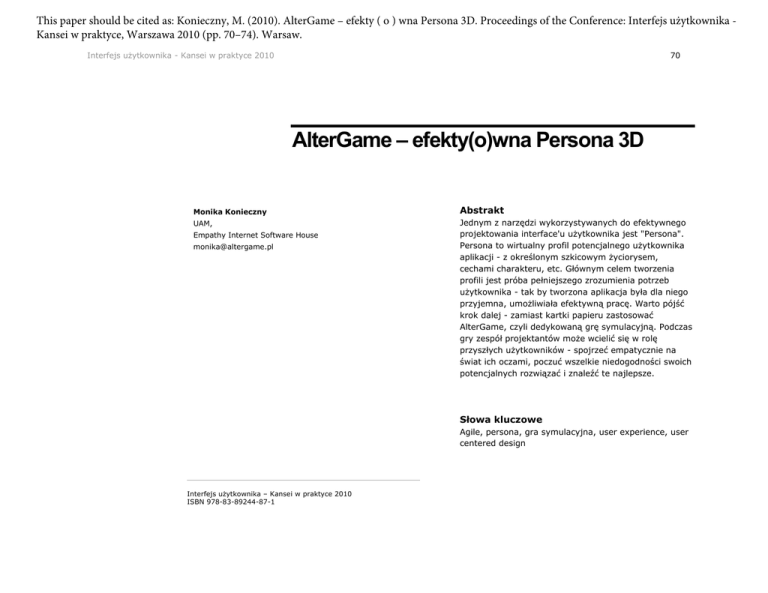 This paper should be cited as: Konieczny, M. (2010). AlterGame – efekty ( o ) wna Persona 3D. Proceedings of the Conference: Interfejs użytkownika Kansei w praktyce, Warszawa 2010 (pp. 70–74). Warsaw. Interfejs użytkownika - Kansei w praktyce 2010 70 AlterGame – efekty(o)wna Persona 3D Monika Konieczny Abstrakt UAM, Jednym z narzędzi wykorzystywanych do efektywnego projektowania interface'u użytkownika jest "Persona". Persona to wirtualny profil potencjalnego użytkownika aplikacji - z określonym szkicowym życiorysem, cechami charakteru, etc. Głównym celem tworzenia profili jest próba pełniejszego zrozumienia potrzeb użytkownika - tak by tworzona aplikacja była dla niego przyjemna, umożliwiała efektywną pracę. Warto pójść krok dalej - zamiast kartki papieru zastosować AlterGame, czyli dedykowaną grę symulacyjną. Podczas gry zespół projektantów może wcielić się w rolę przyszłych użytkowników - spojrzeć empatycznie na świat ich oczami, poczuć wszelkie niedogodności swoich potencjalnych rozwiązać i znaleźć te najlepsze. Empathy Internet Software House [email protected] Słowa kluczowe Agile, persona, gra symulacyjna, user experience, user centered design Interfejs użytkownika – Kansei w praktyce 2010 ISBN 978-83-89244-87-1 Interfejs użytkownika - Kansei w praktyce 2010 Wstęp Żyjemy w czasach świadomych aczkolwiek wybrednych konsumentów, którzy bardzo wiele oczekują od używanych narzędzi. Z racji ogromnych możliwości technicznych i łatwego dostępu do bardzo szerokiej gamy urządzeń/narzędzi, w przypadku niespełnienia pokładanych w narzędziu nadziei, użytkownik porzuca wybrane rozwiązanie i zaczyna poszukiwać nowego, lepszego. Większość ludzi to wzrokowcy, dlatego tak istotną rolę w sukcesie każdego produktu odgrywa dobrze zaprojektowany interface. To właśnie interface decyduje o pierwszym wrażeniu jakie dane narzędzie/aplikacja zrobi na użytkowniku. 71 komputerowych. Zarówno twórcy jak i zlecający stworzenie nowego rozwiązania zdają sobie sprawę, że o powodzeniu ich projektu w dużej mierze zadecyduje wygląd oraz subiektywne odczucie przyjemność używania. Mimo to korzystając z dobrodziejstw internetu możemy trafić na wiele mało ergonomicznych czy nieprzyjaznych rozwiązań. Poniżej lista ciekawych przykładów nietrafionych rozwiązań: 1. Ale co należy rozumieć przez „dobrze zaprojektowany interface”? Odpowiedź na to pytanie nie jest łatwa. Ba, można się pokusić o stwierdzenie, że nie istnieje na nie jednoznaczna odpowiedź. Formularz umożliwiający wprowadzenie kodu pocztowego Proces projektowania Typowy proces projektowania interface'u zgodnie z podejściem UCD (User Centered Design) składa się z: analizy, projektowania, implementacji, wdrażania [1]. Najwięcej błędów jest popełnianych w trakcie analizy... Jest to związane z brakiem wiedzy na temat specyficznych potrzeb użytkowników, ich doświadczeń z używaniem podobnych narzędzi, najczęściej napotykanych problemów (i ich źródeł). Projektantom zdarza się czasami patrzeć na problemy ze swojej perspektywy a nie z punktu widzenia klienta... Co prowadzi do nieporozumień i powstawania interface'ów niespełniających oczekiwań użytkownika końcowego... Problemy w projektowaniu Temat usability, user experience jest coraz częściej brany pod uwagę w trakcie tworzenia aplikacji Źródło: Flickr.com → u sa b ility w eb Interfejs użytkownika - Kansei w praktyce 2010 2. Programator pralki – opcją Normal+, Normal-... Źródło: Flickr.com → u sa b ility w eb • Tablica przylotów – przylot z nieznanego kierunku Źródło: Flickr.com → u sa b ility w eb 72 Jak minimalizować problemy? Czy możliwe jest uniknięcie powyższych błędów? Z pewnością w dużej mierze tak. Jednym ze sposobów jest empatyczne spojrzenie na problemy jakie ma rozwiązywać dana aplikacja w kontekście środowiska użytkownika oraz jego doświadczenia. Nie jest to z pewnością łatwe. Projektanci każdego dnia stykają się z problemami z różnorodnych dziedzin, projektują narzędzia które będą używane przez osoby o profilu psychologicznym znacząco innym niż ich własny. Z tego powodu powstają zbiory dobrych praktyk zawierające uogólnione sposoby, wielokrotnie przetestowane na różnych grupach docelowych, rozwiązywania najczęściej spotykanych problemów. Jednak to co jest dobrym rozwiązaniem dla większości niekoniecznie będzie dobrym rozwiązaniem dla specyficznego segmentu odbiorców aplikacji. W metodyce agile aby ułatwić i spersonalizować proces projektowania wykorzystywana jest tak zwana Persona. Koncepcja Persony Wyraz „persona” pochodzi od łacińskiego per-sonar oznaczającego maskę umożliwiającą zwiększenie głośności głosu aktora (w dosłownym tłumaczeniu wpadać w rezonans). W późniejszych latach, w czasach rzymskich znaczenie uległo modyfikacji, zaczęło oznaczać postać w znaczeniu teatralnym. Pojęcie persony wykorzystywane jest z powodzeniem w wielu dziedzinach nauki, w psychologii, w marketingu, w literaturze [2]. W 1998 roku Alan Cooper w „The inmates are running the asylum” zaproponował wykorzystywanie person jako praktycznego narzędzia do projektowania interakcji. Propozycja Coopera szybko zyskała dużą Interfejs użytkownika - Kansei w praktyce 2010 popularność w środowisku twórców oprogramowania dzięki swojej efektywności i potencjałowi [3]. Persona definiuje archetypicznego użytkownika systemu. Użytkownik ten ma zdefiniowane cechy podstawowe takie jak imię, wiek, płeć. Posiada on również cechy osobowości, ma konkretne cele do osiągnięcia oraz problemy które napotyka. Dzięki personie zarówno projektanci jak i późniejszy twórcy mogą sobie łatwo zwizualizować potencjalnego użytkownika i dzięki temu dobierać trafniejsze rozwiązania. Persona jest tworem czysto wirtualnym (papierowym). Podczas konferencji UPA (Usability Proffesiona