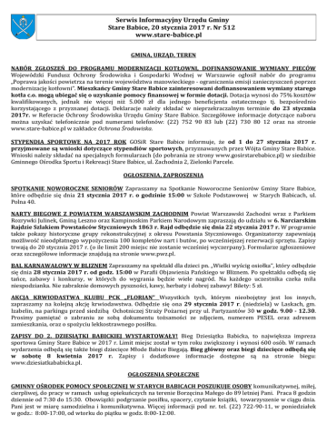 Serwis Informacyjny Urzędu Gminy Stare Babice, 20 stycznia 2017 r. Nr 512 www.stare-babice.pl GMINA, URZĄD, TEREN NABÓR ZGŁOSZEŃ DO PROGRAMU MODERNIZACJI KOTŁOWNI, DOFINANSOWANIE WYMIANY PIECÓW Wojewódzki Fundusz Ochrony Środowiska i Gospodarki Wodnej w Warszawie ogłosił nabór do programu „Poprawa jakości powietrza na terenie województwa mazowieckiego - ograniczenia emisji zanieczyszczeń poprzez modernizację kotłowni”. Mieszkańcy Gminy Stare Babice zainteresowani dofinansowaniem wymiany starego kotła c.o. mogą ubiegać się o uzyskanie pomocy finansowej w formie dotacji. Dotacja wynosi do 75% kosztów kwalifikowanych, jednak nie więcej niż 5.000 zł dla jednego beneficjenta ostatecznego tj. bezpośrednio korzystającego z przyznanej dotacji. Deklaracje należy składać w nieprzekraczalnym terminie do 23 stycznia 2017r. w Referacie Ochrony Środowiska Urzędu Gminy Stare Babice. Szczegółowe informacje dotyczące naboru można uzyskać telefonicznie pod numerami telefonów: (22) 752 90 83 lub (22) 730 80 12 oraz na stronie www.stare-babice.pl w zakładce Ochrona Środowiska. STYPENDIA SPORTOWE NA 2017 ROK GOSiR Stare Babice informuje, że od 1 do 27 stycznia 2017 r. przyjmowane są wnioski dotyczące stypendiów sportowych, przyznawanych przez Wójta Gminy Stare Babice. Wnioski należy składać na specjalnych formularzach (do pobrania ze strony www.gosirstarebabice.pl) w siedzibie Gminnego Ośrodka Sportu i Rekreacji Stare Babice, ul. Zachodnia 2, Zielonki Parcele. OGŁOSZENIA, ZAPROSZENIA SPOTKANIE NOWOROCZNE SENIORÓW Zapraszamy na Spotkanie Noworoczne Seniorów Gminy Stare Babice, które odbędzie się dnia 21 stycznia 2017 r. o godzinie 15:00 w Szkole Podstawowej w Starych Babicach, ul. Polna 40. NARTY BIEGOWE Z POWIATEM WARSZAWSKIM ZACHODNIM Powiat Warszawski Zachodni wraz z Parkiem Rozrywki Julinek, Gminą Leszno oraz Kampinoskim Parkiem Narodowym zapraszają do udziału w 6. Narciarskim Rajdzie Szlakiem Powstańców Styczniowych 1863 r. Rajd odbędzie się dnia 22 stycznia 2017 r. W programie także pokazy historyczne grupy rekonstrukcyjnej z okresu Powstania Styczniowego. Organizatorzy zapewniają możliwość nieodpłatnego wypożyczenia 100 kompletów nart i butów, po wcześniejszej rezerwacji sprzętu. Zapisy trwają do 20 stycznia 2017 r. (o ile limit 200 miejsc nie zostanie wcześniej wyczerpany). Formularze zgłoszeniowe oraz szczegółowe informacje znajdują na stronie www.pwz.pl. BAL KARNAWAŁOWY W BLIZNEM Zapraszamy na spektakl dla dzieci pn. „Wielki wyścig osiołka”, który odbędzie się dnia 28 stycznia 2017 r. od godz. 15:00 w Parafii Objawienia Pańskiego w Bliznem. Po spektaklu odbędą się tańce, zabawy i konkursy, w których do wygrania będzie wiele nagród. Na każdego uczestnika czeka miła niespodzianka. Nie zabraknie domowych pyszności, kawy, herbaty i dobrej zabawy! Bilety: 5 zł. AKCJA KRWIODASTWA KLUBU PCK „FLORIAN” Wszystkich tych, którym nieobojętny jest los innych, zapraszamy na kolejną akcję krwiodawstwa. Odbędzie się ona 29 stycznia 2017 r. (niedziela) w Laskach, gm. Izabelin, na parkingu przed siedzibą Ochotniczej Straży Pożarnej przy ul. Partyzantów 30 w godz. 9.00 - 12.30. Prosimy pamiętać o zabraniu ze sobą dokumentu tożsamości ze zdjęciem, numerem PESEL oraz adresem zamieszkania, oraz o spożyciu lekkostrawnego posiłku. ZAPISY DO 2. DZIESIĄTKI BABICKIEJ WYSTARTOWAŁY! Bieg Dziesiątka Babicka, to największa impreza sportowa Gminy Stare Babice w 2017 r. Limit miejsc został w tym roku zwiększony i wynosi 600 osób. W ramach wydarzenia odbędą się także biegi dziecięce Młode Babice Biegają. Bieg główny oraz biegi dziecięce odbędą się w sobotę 8 kwietnia 2017 r. Zapisy i dodatkowe informacje dostępne są na stronie biegu: www.dziesiatkababicka.pl. OGŁOSZENIA SPOŁECZNE GMINNY OŚRODEK POMOCY SPOŁECZNEJ W STARYCH BABICACH POSZUKUJE OSOBY komunikatywnej, miłej, cierpliwej, do pracy w ramach usług opiekuńczych na terenie Borzęcina Małego do 89 letniej Pani. Praca 8 godzin dziennie od 7:30 do 15:30. Obowiązki: podgrzanie posiłku, spacery, czytanie książki, towarzyszenie w ciągu dnia. Pani jest w miarę samodzielna i komunikatywna. Więcej informacji pod nr. tel. (22) 722-90-11, w poniedziałek w godz.: 8:00-17:00, od wtorku do piątku w godz. 8:00-12:00.