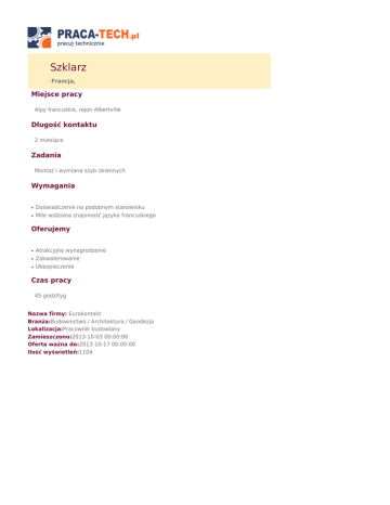 Szklarz Francja, Miejsce pracy Alpy francuskie, rejon Albertville Długość kontaktu 2 miesiące Zadania Montaż i wymiana szyb okiennych Wymagania ● ● Doświadczenie na podobnym stanowisku Mile widziana znajomość języka francuskiego Oferujemy ● ● ● Atrakcyjne wynagrodzenie Zakwaterowanie Ubezpieczenie Czas pracy 45 godz/tyg Nazwa firmy: Eurokontakt Branża:Budownictwo / Architektura / Geodezja Lokalizacja:Pracownik budowlany Zamieszczono:2013-10-03 00:00:00 Oferta ważna do:2013-10-17 00:00:00 Ilość wyświetleń:1104