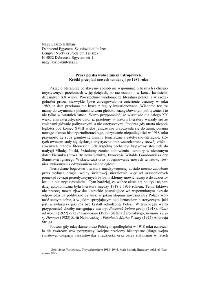 Nagy László Kálmán Debreceni Egyetem, Szlavisztikai Intézet Lengyel Nyelv és Irodalom Tanszék H-4032 Debrecen, Egyetem tér 1. [email protected] Proza polska wobec zmian ustrojowych. Krótki przegląd nowych tendencji po 1989 roku Pisząc o literaturze polskiej nie sposób nie wspominać o licznych i charakterystycznych przełomach w jej dziejach, po raz ostatni – w końcu lat osiemdziesiątych XX wieku. Powszechnie wiadomo, że literatura polska, a w szczególności proza, niezwykle żywo zareagowała na zniesienie cenzury w roku 1989, ta data przełomu nie bywa z reguły kwestionowana. Wiadomo też, że mamy do czynienia z piśmiennictwem głęboko zaangażowanym politycznie, i to nie tylko w ostatnich latach. Warto przypomnieć, że właściwie dla całego XX wieku charakterystyczne było, iż przełomy w historii literatury wiązały się ze zmianami głównie politycznymi, a nie estetycznymi. Podczas gdy utrata niepodległości pod koniec XVIII wieku jeszcze nie przyczyniła się do zainicjowania nowego okresu historycznoliterackiego, odzyskanie niepodległości w 1918 roku przyniosło ze sobą gruntowne zmiany tematyczne i estetyczno-literackie, których owocem stały się dyskusje artystyczne oraz wszechstronny rozwój zróżnicowanych prądów literackich. Ich wspólną cechą był krytyczny stosunek do tradycji Młodej Polski, świadomy zamiar odnowienia literatury w nieznanym dotąd kierunku (proza Brunona Schulza, twórczość Witolda Gombrowicza czy Stanisława Ignacego Witkiewicza) oraz podejmowanie nowych tematów, również związanych z odzyskaniem niepodległości. Niesłychane bogactwo literatury międzywojennej zostało mocno zubożone przez wybuch drugiej wojny światowej, niezależnie więc od uzasadnionych poniekąd rewizji periodyzacyjnych byłbym skłonny mówić raczej o dwudziestoleciu, a nie trzydziestoleciu.1 Tym bardziej, że wobec aktualnej polityki najbardziej autonomiczna była literatura między 1918 a 1939 rokiem. Temu faktowi nie przeczą nawet zjawiska literackie poszukujące we wspomnianym okresie odpowiedzi na polityczne pytania: w jakim stopniu zawdzięczają Polacy wolność samym sobie, a w jakim sprzyjającym okolicznościom historycznym, jaki jest, a zwłaszcza jaki ma być kształt odrodzonej Polski. W tym kręgu warto przypomnieć choćby następujące utwory: Początek świata pracy (1918), Wiatr od morza (1922) oraz Przedwiośnie (1925) Stefana Żeromskiego, Romans Teresy Hennert (1923) Zofii Nałkowskiej i Pokolenie Marka Świdry (1925) Andrzeja Struga. Podczas gdy odzyskanie przez Polskę niepodległości w 1918 roku oznaczało dla twórców szok pozytywny, kolejne przełomy historyczne (druga wojna światowa, okupacja faszystowska i radziecka oraz okres stalinizmu w latach 1 Zob. Anna Nasiłowska, Trzydziestolecie 1918–1944. Mała historia literatury polskiej. Warszawa 1995. 1949–1956) niewątpliwie mocno ograniczyły swobodę twórczą i jednoznacznie zapisały się w historii literatury jako szok negatywny. Zmiany ustrojowe, których znaczenie trudno przecenić, przyczyniły się do kolejnej cezury w literaturze, zwłaszcza w prozie. Był to ostatni dotąd nowy szok, który tylko z pozoru i na początku był jednoznacznie pozytywny. W kręgach czytelników i wydawców na przełomie lat osiemdziesiątych i dziewięćdziesiątych dominowała euforia, ponieważ po zniesieniu cenzury wreszcie można było pisać o „wszystkim”. Błyskawicznie ujrzały więc światło dzienne zakazane wcześniej utwory pisarzy emigracyjnych, dzieła przemycane do kraju nielegalnie oraz wydawane przed 1989 rokiem w drugim obiegu. Wśród nich ogromne znaczenie miały utwory dokumentujące los Polaków w więzieniach i łagrach stalinowskich, mówiące wreszcie „całą prawdę” o „białych krematoriach” bądź zamordowaniu przez NKWD polskich oficerów w Katyniu. Owocem takiego pierwszego odreagowania wolności było wejście do kanonu literatury utworów między innymi Józefa Czapskiego, Mariana Czuchnowskiego, Wacława Grubińskiego, Gustawa Herlinga-Grudzińskiego, Beaty Obertyńskiej czy Aleksandra Wata. Nastąpiło więc przewartościowanie przeszłości także w literaturze, nie tylko w historii i polityce. Z tego powodu na początku lat dziewięćdziesiątych karierę zrobiły także niektóre słabsze pod względem artystycznym utwory dzięki właśnie temu, że poświadczyły prawdę o czerwonym totalitaryzmie. Wkrótce okazało się jednak, że po roku 1989 autorzy polscy byli dużo bardziej bezradni wobec nowej rzeczywistości, niż po 1918 roku. Raptem „zabrakło” tematów i nawet najwybitniejsi przeżywali kryzys twórczy. Ten kryzys wynikał z faktu, iż nowa rzeczywistość nie nadawała się do natychmiastowej oceny, tym bardziej że się ona dopiero kształtowała. Zmiany ustrojowe – mimo swej doniosłości – mniej dobitny ślad zostawiły na codziennym życiu, niż na przykład koniec drugiej wojny światowej. Wówczas z perspektywy odzyskanego pokoju i zwycięstwa sił antyfaszystowskich można było dać dosyć jednoznaczną ocenę minionego czasu, przedstawić w utworach skomplikowany i tragiczny los Polaków podczas okupacji niemieckiej. Nie bez powodu rozwijał się po 1945 roku nurt martyrologiczno-mitotwórczy, gdyż klarowny podział na katów i ofiary w utworach podejmujących tematykę wojny i okupacji odpowiadał nie tylko potrzebom czytelniczym, lecz był chętnie akceptowany także przez oficjalną politykę kulturalną, czyli między innymi przez cenzurę. Najbardziej istotnym zjawiskiem wydaje się fakt, że upolitycznienie literatury polskiej od czasów rozbiorów do 1989 roku związane było najczęściej z konkretnymi wydarzeniami historycznymi i politycznymi, które można sprowadzić do schematu zbrojnego konfliktu między zaborcą (okupantem) a narodem polskim względnie jawnego konfliktu wykrystalizowanych poglądów politycznych. Wydarzenia polityczne, które w końcu doprowadziły do zm