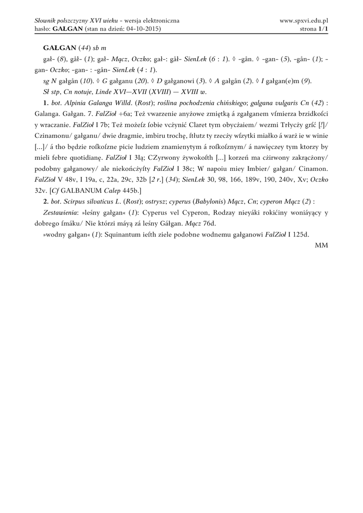 Słownik polszczyzny XVI wieku - wersja elektroniczna hasło: GAŁGAN (stan na dzień: 04-10-2015) www.spxvi.edu.pl strona 1/1 GAŁGAN (44) sb m gał- (8), gåł- (1); gał- Mącz, Oczko; gał-: gåł- SienLek (6 : 1). ◊ -gån. ◊ -gan- (5), -gån- (1); gan- Oczko; -gan- : -gån- SienLek (4 : 1). sg N gałgån (10). ◊ G gałganu (20). ◊ D gałganowi (3). ◊ A gałgån (2). ◊ I gałgan(e)m (9). Sł stp, Cn notuje, Linde XVI—XVII (XVIII) — XVIII w. 1. bot. Alpinia Galanga Willd. (Rost); roślina pochodzenia chińskiego; galgana vulgaris Cn (42) : Galanga. Gałgan. 7. FalZioł +6a; Też vwarzenie anyżowe zmiętką á zgałganem vſmierza brzidkoſci y wraczanie. FalZioł I 7b; Też możeſz ſobie vcżynić Claret tym obycżaiem/ wezmi Trłycży grſć [!]/ Czinamonu/ gałganu/ dwie dragmie, imbiru trochę, ſtłutz ty rzecży wſzytki miałko á warż ie w winie [...]/ á tho będzie roſkoſzne picie ludziem znamienytym á roſkoſznym/ á nawięczey tym ktorzy by mieli febre quotidianę. FalZioł I 3Ią; CZyrwony żywokoſth [...] korzeń ma cżirwony zakrącżony/ podobny gałganowy/ ale niekońcżyſty FalZioł I 38c; W napoiu miey Imbier/ gałgan/ Cinamon. FalZioł V 48v, I 19a, c, 22a, 29c, 32b [2 r.] (34); SienLek 30, 98, 166, 189v, 190, 240v, Xv; Oczko 32v. [Cf GALBANUM Calep 445b.] 2. bot. Scirpus silvaticus L. (Rost); ostrysz; cyperus (Babylonis) Mącz, Cn; cyperon Mącz (2) : Zestawienia: »leśny gałgan« (1): Cyperus vel Cyperon, Rodzay nieyáki rokićiny woniáyący y dobrego ſmáku/ Nie którzi máyą zá leśny Gáłgan. Mącz 76d. »wodny gałgan« (1): Squinantum ieſth ziele podobne wodnemu gałganowi FalZioł I 125d. MM