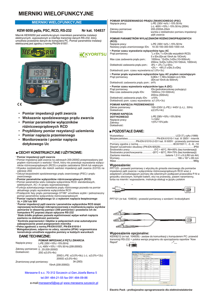 MIERNIKI WIELOFUNKCYJNE MIERNIKI WIELOFUNKCYJNE KEW 6050 pętla, PSC, RCD, RS-232 Nr kat. 104837 Miernik KEW6050 jest wielofunkcyjnym miernikiem parametrów instalacji elektrycznych, wyposażonym w interfejs transmisji danych RS-232, który umożliwia przestanie danych do komputera PC. Pomiar parametrów instalacji elektrycznej jest zgodny z normą PN-EN 61557. POMIAR SPODZIEWANEGO PRĄDU ZWARCIOWEGO (PSC) Napięcie pracy: L-PE: 230V +io% / -15% 50 Hz L-L: 400V +10% / -15% 50 Hz (200A) Zakresy pomiarowe: 200-2000A-20kA Dokładność: wynika z dokładności pomiaru impedancji pętli zwarcia POMIAR PARAMETRÓW WYŁĄCZNIKÓW RÓŻNICOWOPRĄDOWYCH (RCD) Napięcie pracy: L-PE: 230V +io% / -15% 50 Hz Nastawy prądu znamionowego IDN: 10-30-100-300-500-1000 mA • Pomiar czasu wyzwalania wyłączników typu AC 1 Prąd pomiarowy: /2 x IDN, 1 x IDN (dla wszystkich RCD) 5 x IDN (IDN od 10mA do 10OmA) 1 Max czas zadawania prądu pom.: 1000ms: /2XIDN,1XIDN (10+500mA) 200ms: 5XIDN,1XIDN (10+100mA, 1000mA) Dokładność zadawania prądu pom.: -8% ÷ -2% (1/2x IDN); +2% ÷ +8% (1 x IDN, 5 x IDN); Dokładność pom. czasu wyzwalania:±(1,0%+3c) • Pomiar prądu wyzwalania wyłączników typu AC prądem narastającym Prąd pomiarowy 0,2IDN ÷ 1,1IDN Z krokiem co 0,1IDN (IDN od 10mA do 500mA) Dokładność zadawania prądu pom.: ±4% • Pomiar czasu wyzwalania wyłączników typu A (DC) Prąd pomiarowy: IDN (jednokierunkowy pulsujący) Max czas zadawania prądu IDN: 1000ms (10+300mA) 200ms (500mA) Dokładność zadawania prądu IDN: ±10% Dokładność pom. czasu wyzwalania: ±(1,0%+3c) • Pomiar impedancji pętli zwarcia • Wskazanie spodziewanego prądu zwarcia • Pomiar parametrów wyłączników różnicowoprądowych RCD • Przybliżony pomiar rezystancji uziemienia • Pomiar napięcia przemiennego • Monitorowanie i pomiar napięcia dotykowego Uc ■ CECHY KONSTRUKCYJNE I UŻYTKOWE: ' Pomiar impedancji pętli zwarcia • Pomiar impedancji pętli zwarcia na zakresach 200-2000Ω przeprowadzony jest prądem różnicowym o wartości 15mA, który nie powoduje wyzwalania wyłączników różnicowoprądowych (RCD) o prądzie zadziałania 30mA lub większym • Wysoka rozdzielczość dla niskich wartości impedancji pętli zwarcia (0,01Ω) na zakresie 20Ω • Odczyt bezpośredni spodziewanego prądu zwarciowego (PSC) i prądu zwarciowego • Pomiar parametrów wyłączników różnicowoprądowych (RCD) • Pomiar parametrów wielu rodzajów wyłączników RCD: standardowych, selektywnych, AC i A (prądu wyprostowanego) • Funkcja automatycznego narastania prądu różnicowego pozwala na pomiar aktualnego prądu wyzwalania wyłączników RCD • Przełącznik fazy prądu pomiarowego 07180° umożliwia szybki i jednoznaczny pomiar parametrów wyłączników różnicowoprądowych ' Pomiar napięcia dotykowego Uc z wyborem napięcia bezpiecznego UL = 25V lub 50V ' Pomiar impedancji pętli zwarcia i parametrów wyłączników RCD dzięki najnowszej technologii mikroprocesorowej z możliwością zapisu wyników pomiarów w obszernej pamięci (300 pomiarów) i przesłania ich do komputera PC poprzez złącze optyczne RS-232 ' Stałe źródło prądowe pozwala wyeliminować wpływ wahań napięcia zasilania na dokładność pomiarów ' Kontrola poprawności i błędów w połączeniach oraz automatyczne zabezpieczenie przed przegrzaniem miernika • Pełna zgodność z normą PN-EN 61557, PN-EN 61010-1 ' Małogabarytowa, odporna na udary, szczelna (IP54) i ergonomiczna konstrukcja umożliwia wygodne pomiary w każdych warunkach DANE TECHNICZNE: POMIAR IMPEDANCJI PĘTLI ZWARCIA Napięcie pracy: L-PE: 230V +10% / -15% 50 HZ L-L: 400V +10% / -15% 50 Hz (200-2000Ω) Zakresy pomiarowe: 0...20-200-2000Ω Dokładność: 20Ω ±(3,0%+8c) 200Ω L-PE: ±(3,0%+8c); L-L: ±(3,0%+12c) 2000Ω ±(3,0%+8c) 3A (20Ω) Znamionowy prąd pomiarowy: 15mA (200-2000Ω) POMIAR NAPIĘCIA PRZEMIENNEGO Zakres pomiarowy: 100+230V (L-PE) / 440V (L-L) , 50Hz Dokładność: ±(2,0%+4c) POMIAR NAPIĘCIA DOTYKOWEGO Napięcie pracy: Zakresy: Dokładność: L-PE: 230V +10% / -15% 50 HZ 1+100V +(5%+15%)±8c ■ POZOSTAŁE DANE: Wyświetlacz .......................................................................... LCD 31/2 cyfry (1999) Bezpieczeństwo ......................................... PN-EN 61010-1 kat. III 300V - miernik .................................. PN-EN 61010-2-031 kat. III 600V - przewody pomiarowe Pomiary zgodne z normą .................................................. IEC61557-1, -3, -6, -10 Stopień szczelności obudowy (PN-EN 60529) ................................................IP54 Środowisko pracy ...................................0°C ÷ 40°C, RH<85% (bez kondensacji) Środowisko przechowywania ............. -20°C ÷ 60°C, RH<75% (bez kondensacji) Zasilanie miernika ................................................... baterie 1,5 V x 8 (LR6 lub AA) Wymiary ................................................................................... 186 x 167 x 89 mm Masa ............................................................................................................... 980g Wyposażenie: PP7125 - przewód pomiarowy z wtyczką do gniazda sieciowego dla pomiarów impedancji pętli zwarcia i wyłączników różnicowoprądowych RCD wraz z adapterem umożliwiającym pomiary dla odwrotnych podłączeń przewodów P-N w gniazdku sieciowym, komplet baterii, etui na przewody, pasem naramienny, torba na miernik i wyposażenie, instrukcja obsługi w języku polskim PP7121 (nr kat. 104834) - przewód pomiarowy z sondami i krokodylkami Wyposażenie opcjonalne: KEW8212 (nr kat. 104839) - zestaw do komunikacji z komputerem PC: przewód transmisji RS-232 + polska wersja programu do sporządzania raportów “Kew Report” ,-.— „ ,-^__ Meraserw-5 s.c. 70-312 Szczecin ul.Gen.Józefa Bema 5 tel.091 484-21-55 fax 091 484-09-86 e-mail:[email protected] www.meraserw.szczecin.pl Electric Pack - profesjonalne oprogramowanie dl
