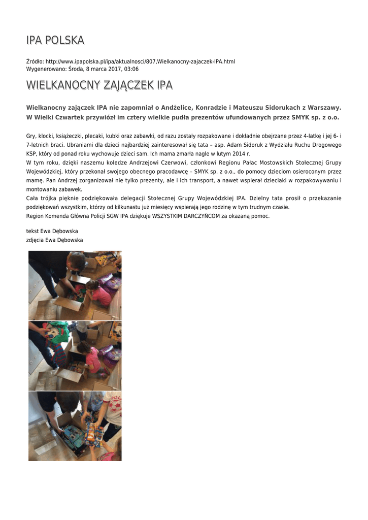 IPA POLSKA Źródło: http://www.ipapolska.pl/ipa/aktualnosci/807,Wielkanocny-zajaczek-IPA.html Wygenerowano: Środa, 8 marca 2017, 03:06 WIELKANOCNY ZAJĄCZEK IPA Wielkanocny zajączek IPA nie zapomniał o Andżelice, Konradzie i Mateuszu Sidorukach z Warszawy. W Wielki Czwartek przywiózł im cztery wielkie pudła prezentów ufundowanych przez SMYK sp. z o.o. Gry, klocki, książeczki, plecaki, kubki oraz zabawki, od razu zostały rozpakowane i dokładnie obejrzane przez 4-latkę i jej 6- i 7-letnich braci. Ubraniami dla dzieci najbardziej zainteresował się tata – asp. Adam Sidoruk z Wydziału Ruchu Drogowego KSP, który od ponad roku wychowuje dzieci sam. Ich mama zmarła nagle w lutym 2014 r. W tym roku, dzięki naszemu koledze Andrzejowi Czerwowi, członkowi Regionu Pałac Mostowskich Stołecznej Grupy Wojewódzkiej, który przekonał swojego obecnego pracodawcę – SMYK sp. z o.o., do pomocy dzieciom osieroconym przez mamę. Pan Andrzej zorganizował nie tylko prezenty, ale i ich transport, a nawet wspierał dzieciaki w rozpakowywaniu i montowaniu zabawek. Cała trójka pięknie podziękowała delegacji Stołecznej Grupy Wojewódzkiej IPA. Dzielny tata prosił o przekazanie podziękowań wszystkim, którzy od kilkunastu już miesięcy wspierają jego rodzinę w tym trudnym czasie. Region Komenda Główna Policji SGW IPA dziękuje WSZYSTKIM DARCZYŃCOM za okazaną pomoc. tekst Ewa Dębowska zdjęcia Ewa Dębowska Ocena: 0/5 (0) Tweetnij