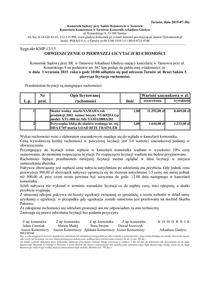 Sygn.akt KMP 13/15 OBWIESZCZENIE O PIERWSZEJ LICYTACJI