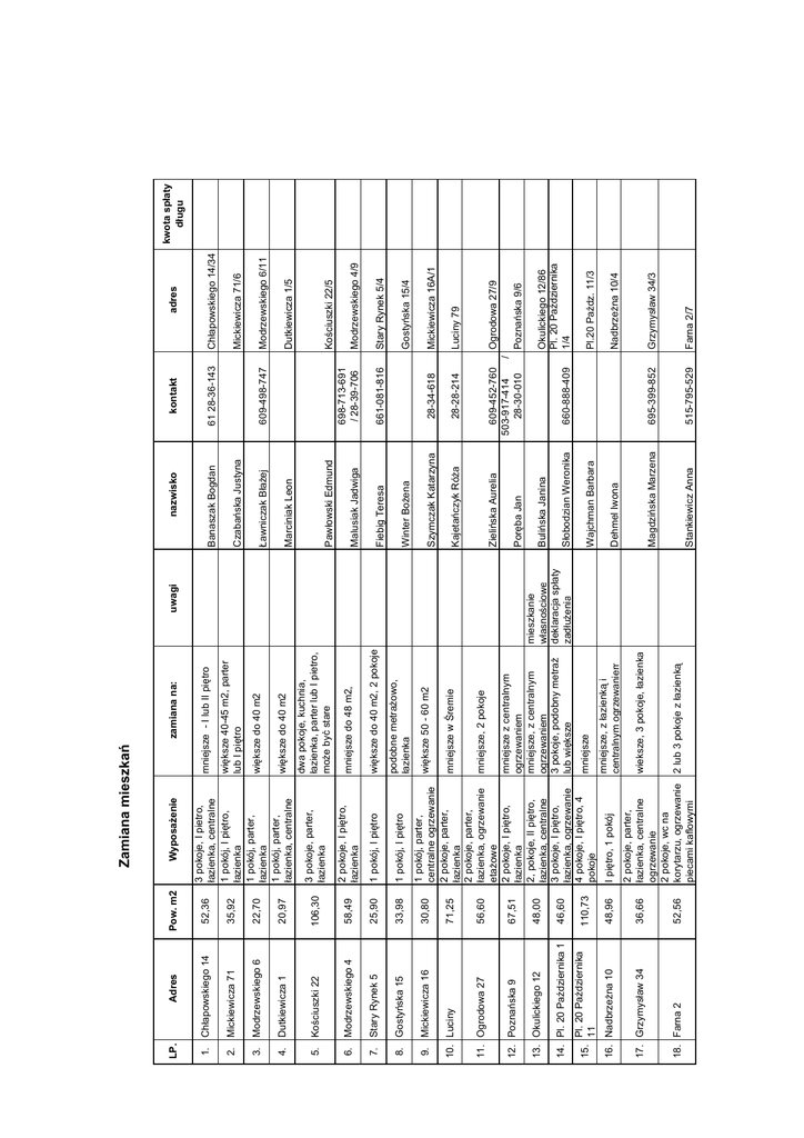 35,92 22,70 20,97 106,30 58,49 25,90 33,98 30,80 71,25 56,60 67,51 48,00 46,60 110,73 48,96 36,66 52,56 2. Mickiewicza 71 3. Modrzewskiego 6 4. Dutkiewicza 1 5. Kościuszki 22 6. Modrzewskiego 4 7. Stary Rynek 5 8. Gostyńska 15 9. Mickiewicza 16 10. Luciny 11. Ogrodowa 27 12. Poznańska 9 13. Okulickiego 12 14. Pl. 20 Października 1 Pl. 20 Października 15. 11 16. NadbrzeŜna 10 17. Grzymysław 34 18. Farna 2 Pow. m2 52,36 Adres 1. Chłapowskiego 14 LP. 2 pokoje, parter, łazienka, centralne ogrzewanie 2 pokoje, wc na korytarzu, ogrzewanie piecami kaflowymi I piętro, 1 pokój 1 pokój, parter, centralne ogrzewanie 2 pokoje, parter, łazienka 2 pokoje, parter, łazienka, ogrzewanie etaŜowe 2 pokoje, I piętro, łazienka 2, pokoje, II piętro, łazienka, centralne 3 pokoje, I piętro, łazienka, ogrzewanie 4 pokoje, I piętro, 4 pokoje 1 pokój, I piętro 1 pokój, I piętro 2 pokoje, I piętro, łazienka 3 pokoje, parter, łazienka 3 pokoje, I pietro, łazienka, centralne 1 pokój, I piętro, łazienka 1 pokój, parter, łazienka 1 pokój, parter, łazienka, centralne WyposaŜenie zamiana na: 2 lub 3 pokoje z łazienką wieksze, 3 pokoje, łazienka mniejsze, z łazienką i centralnym ogrzewaniem mniejsze mniejsze z centralnym ogrzewaniem mniejsze, z centralnym ogrzewaniem 3 pokoje, podobny metraŜ lub większe mniejsze, 2 pokoje mniejsze w Śremie większe 50 - 60 m2 podobne metraŜowo, łazienka większe do 40 m2, 2 pokoje dwa pokoje, kuchnia, łazienka, parter lub I pietro, moŜe być stare budownictwo mniejsze do 48 m2, większe do 40 m2 większe do 40 m2 większe 40-45 m2, parter lub I piętro mniejsze - I lub II piętro Zamiana mieszkań mieszkanie własnościowe deklaracja spłaty zadłuŜenia uwagi Stankiewicz Anna Magdzińska Marzena Dehmel Iwona Wajchman Barbara Słobodzian Weronika Bulińska Janina Poręba Jan Zielińska Aurelia Kajetańczyk RóŜa Szymczak Katarzyna Winter BoŜena Fiebig Teresa Malusiak Jadwiga Pawłowski Edmund Marciniak Leon Ławniczak BłaŜej Czabańska Justyna Banaszak Bogdan nazwisko Luciny 79 Mickiewicza 16A/1 Gostyńska 15/4 Stary Rynek 5/4 Modrzewskiego 4/9 Kościuszki 22/5 Dutkiewicza 1/5 Modrzewskiego 6/11 Mickiewicza 71/6 Chłapowskiego 14/34 adres 515-795-529 695-399-852 660-888-409 Farna 2/7 Grzymysław 34/3 NadbrzeŜna 10/4 Pl.20 Paźdz. 11/3 Okulickiego 12/86 Pl. 20 Października 1/4 609-452-760 Ogrodowa 27/9 503-917-414 / 28-30-010 Poznańska 9/6 28-28-214 28-34-618 661-081-816 698-713-691 / 28-39-706 609-498-747 61 28-36-143 kontakt kwota spłaty długu 28,40 22,84 26,84 54,17 48,84 67,04 50,57 34,50 46,99 36,90 52,05 56,60 47,10 20. Roweckiego 4 21. Poznańska 14 22. Kochanowskiego 1 23. Wawrzyniaka 7 24. Powstańców Wlkp. 1 25. Poznańska 14 26. Modrzewskiego 10 27. Stary Rynek 6 28. Dutkiewicza 1 29. Kochanowskiego 1 30. Pl. 20 Października 3 31. Ogrodowa 31 32. Powstańców Wlkp. 8 79,84 19. Mickieiwcza 13 55-60 m2, 2-3 pokoje, łazienka, centralne ogrzewanie 1 pokój, II piętro, większe, 2 pokoje, centralne centralne ogrzewanie, ogrzewanie ok. 45-50 m2, 2 pokoje, deklaracja spłaty 1 pokój, III pietro, piece łazienka, mogą być piece kaflowe, zadłuŜenia kaflowe, ok. 50 m2, parter lub I 2 pokoje, III piętro, piętro, 2 pokoje, łazienka, łazienka, piece ogrzewanie etaŜowe, kaflowe, junkers, junkers 3 pokoje, parter, ok. 30-40 m2, I lub II piętro, łazienka, piece 3 pokoje, łazienka, piece kaflowe, kaflowe, mniejsze 40-72 m2, 3 pokoje 56-65 m2, 2-3 pokoje, parter lub I piętro, ogrzewanie gazowe 3 pokoje, 60 m2, łazienka 3 pkoje, do 90 m2 ok. 37-45 m2, tylko w blokach, do III pietra, 2 pokoje, łazienka, ogrzewanie centralne lub gazowe, ok. 40 m2, 2 pokoje, I-III 2 pokoje, I piętro, piętro, ogrzewanie gazowe, ogrzewanie etaŜowe na na miał lub miejskie, miał podgrzanie wody gazowe lub miejskie 2 pokoje, łazienka, parter, ogrzewanie ok.60-100 m2, 3 pokoje, centralne weglowe, łazienka, ogrzewanie - piece ciepław woda - bojler kaflowe 2 pokoje 2 pokoje, I piętro, 2 pokoje, parter, wspólny przedpokój, 1 pokój, łazienka, piece kaflowe I piętro, 1 pokój, wspólny przedpokój, ogrzewanie gazowe 3 pokoje, I piętro, łazienka, wspólny korytarz, ogrzewanie węglowe, bojler, deklaracja spłaty zadłuŜenia deklaracja spłaty zadłuŜenia 2 pokoje, parter, łazienka, wspólny przedpokój, ogrzewanie do 60 m2, parter lub I piętro, deklaracja spłaty kominkowe, bojler 3 pokoje, łazienka, zadłuŜenia elektryczny ogrzewanie dowolne, mieszkanie po remoncie 2 pokoje, parter, łazienka Ścisłowska Edyta (lok.socjalny) Urbańska Małgorzata Jaworski Jarosław Hamulski Patryk Burdajewcz Artur śak Agnieszka (lok.socj.) Andrzejewska Ilona Dąbkiewicz Alina Stelmaszyk Artur Kufel Irena Wawrzyniak Leon Nowak Angelika Barcz Andrzej Poznańska Ewa / Powst.Wlkp.1/3 Wawrzyniaka 7/2 Kochanowskiego 1/21 Poznańska 14/6 Roweckiego 4/46 Mickiewicza 13/3 3 tys. 3 tys. 609-159-638 506-495-345 531-990-294 695-307-825, 607-472-746 535-296-861 Powstańców Wlkp. 8/1 Ogrodowa 31/27 Pl. 20 Października 3/3 Kochanowskiego 1/27 Dutkiewicza1/3 Stary Rynek 6/4 3 tys. 691-284-657 Poznańska 14/3 781-051-325, 61 20 tys. 28-38-303 Modrzewskiego 10/2 608-571-825 608-241-987 511-054-616 28-33-692 723-425-104 517-844-743 783-272-572 44. 43. 42. 41. 40. 39. 38. 37. 36. 35. 34. 33. 31-07-2014 Kochanowskiego 1 Mickiewicza 18 Okulickiego 12 Farna 2 Gostyńska 15 Wawrzyniaka 5 Sikorskiego 21 Młyńska 3 Modrzewskiego 4 Wielka Rzeźnicka 2 Ogrodowa 33 Farna 29 36,90 34,34 48,00 39,84 25,77 23,25 41,59 38,66 54,5 58,76 34,5 41,52 deklaracja spłaty zadłuŜenia do 25 m2, parter, 1 pokój, łazienka, Wc, ogrzewanie węglowe 35-45 m2, 2 pokoje, łazienka, Wc, ogrzewanie węglowe lub gazowe ok. 30m2, parter lub I piętro, 1 pokój, łazienka, ogrzewanie gazowe ok. 30m2, parter, 2 pokoje, łazienka, Wc, ogrzewanie miejskie, ok. 56 m2, 2 pokoje, parter deklaracja spłaty lub I piętro, łazienka, zadłuŜenia ogrzewanie gazowe, deklaracja spłaty 3 pokoje zadł