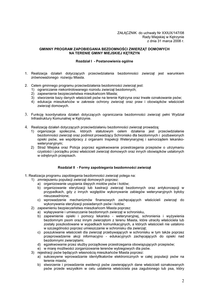 ZAŁĄCZNIK do uchwały Nr XXIUX/147/08 Rady Miejskiej w Kętrzynie z dnia 31 marca 2008 r. GMINNY PROGRAM ZAPOBIEGANIA BEZDOMNOŚCI ZWIERZĄT DOMOWYCH NA TERENIE GMINY MIEJSKIEJ KĘTRZYN Rozdział I - Postanowienia ogólne 1. Realizacja działań dotyczących przeciwdziałania zrównowaŜonego rozwoju Miasta. bezdomności zwierząt jest warunkiem 2. Celem gminnego programu przeciwdziałania bezdomności zwierząt jest: 1) ograniczanie niekontrolowanego rozrodu zwierząt bezdomnych; 2) zapewnienie bezpieczeństwa mieszkańcom Miasta; 3) stworzenie bazy danych właścicieli psów na terenie Kętrzyna oraz trwałe oznakowanie psów; 4) edukacja mieszkańców w zakresie ochrony zwierząt oraz praw i obowiązków właścicieli zwierząt domowych. 3. Funkcję koordynatora działań dotyczących ograniczania bezdomności zwierząt pełni Wydział Infrastruktury Komunalnej w Kętrzynie. 4. Realizację działań dotyczących przeciwdziałaniu bezdomności zwierząt prowadzą: 1) organizacje społeczne, których statutowym celem działania jest przeciwdziałanie bezdomności zwierząt oraz podmiot prowadzący Schronisko dla bezdomnych i pozbawionych opieki psów, we współpracy z organami Inspekcji Weterynaryjnej i samorządem lekarskoweterynaryjnym; 2) StraŜ Miejska oraz Policja poprzez egzekwowanie przestrzegania przepisów o utrzymaniu czystości i porządku przez właścicieli zwierząt domowych oraz innych obowiązków ustalonych w odrębnych przepisach. Rozdział II - Formy zapobiegania bezdomności zwierząt 1. Realizacja programu zapobiegania bezdomności zwierząt polega na: 1) zmniejszeniu populacji zwierząt domowych poprzez: a) organizowanie usypiania ślepych miotów psów i kotów; b) organizowanie sterylizacji lub kastracji zwierząt bezdomnych oraz antykoncepcji w przypadkach, gdy z innych względów wykonywanie zabiegów weterynaryjnych byłoby nieuzasadnione; c) wprowadzenie mechanizmów finansowych zachęcających właścicieli zwierząt do wykonywania sterylizacji posiadanych psów i kotów; 2) zapewnieniu bezpieczeństwa mieszkańcom Miasta poprzez: a) wyłapywanie i umieszczanie bezdomnych zwierząt w schronisku, b) zapewnienie opieki i pomocy lekarsko - weterynaryjnej, schronienia i wyŜywienia bezdomnym psom oraz innym zwierzętom z terenu Miasta, które utraciły właściciela lub zostały poszkodowane w wypadkach komunikacyjnych, a których właścicieli nie ustalono w szczególności poprzez umieszczanie w schronisku dla zwierząt; c) poszukiwanie właścicieli dla zwierząt przebywających w schronisku w tym takŜe poprzez przeprowadzenie akcji informacyjno - edukacyjnych zachęcających do opieki nad bezdomnymi zwierzętami. d) egzekwowanie przez słuŜby porządkowe przestrzegania obowiązujących przepisów; e) w miarę moŜliwości zorganizowanie terenów wybiegowych dla psów. 3) rejestracji psów będących własnością mieszkańców Miasta poprzez: a) sukcesywne wprowadzanie identyfikatorów elektronicznych w całej populacji psów na terenie miasta; b) stworzenie i prowadzenie ewidencji psów zawierających dane właścicieli oznakowanych psów przede wszystkim w celu ustalenia właściciela psa zagubionego lub psa, który 2 pogryzł człowieka oraz ustalenia, czy pies został poddany obowiązkowemu szczepieniu przeciwko wściekliźnie. 4) edukacji mieszkańców na temat zasad humanitarnego traktowania zwierząt oraz obowiązków właścicieli wobec nich. 2. W celu realizacji działań wymienionych w pkt.1 prowadzący schronisko wypełnia zadania dotyczące ograniczania bezdomności psów poprzez: 1) przyjmowanie i utrzymywanie psów bezdomnych oraz psów zagraŜających bezpieczeństwu ludzi, rannych w wypadkach drogowych, a takŜe tych, które pokąsały człowieka - zabranych z miejsc publicznych (zgodnie z zawartą umową); 2) przekazywanie psów nowym właścicielom; 3) trwałe znakowanie (czipowanie) wszystkich zwierząt po okresie kwarantanny, a przed wydaniem ich nowym właścicielom; 4) poszukiwanie właścicieli psów przyjętych do schroniska. 3. Dla realizacji działań dotyczących przeciwdziałania bezdomności zwierząt domowych Gmina Miejska Kętrzyn moŜe udzielać organizacjom społecznym, których statutowym celem działania jest ochrona zwierząt, pomocy w róŜnych formach, a w szczególności: 1) wsparcia finansowego – na zasadach określonych w odrębnych przepisach, 2) promocji podejmowanych działań, a zwłaszcza w mediach, 3) pomocy w nawiązywaniu kontaktów i współpracy w skali lokalnej i ogólnopolskiej. Rozdział III - Edukacja 1. Podniesienie poziomu wiedzy mieszkańców Miasta o obowiązkach ciąŜących na osobach utrzymujących lub hodujących psy albo koty i zasadach humanitarnego traktowania zwierząt, Miasto realizować będzie poprzez działania popularyzatorskie i edukacyjne. 2. Do podstawowych działań, o których mowa w ust. 1, naleŜą w szczególności: 1) wydawanie ulotek i plakatów propagujących odpowiednie warunki utrzymania psów i kotów; 2) zamieszczanie w lokalnej prasie artykułów poświęconych prawom zwierząt, obowiązkom ich właścicieli oraz propagujących odpowiedzialne posiadanie zwierząt; 3) współpraca z istniejącymi organizacjami pozarządowymi, których statutowym celem jest ochrona zwierząt oraz zachęcanie do uczestnictwa mieszkańców Miasta w adopcji zwierząt bezdomnych. 3. Działaniem edukacyjnym obejmuje się w szczególności dzieci i młodzieŜ uczęszczającą do placówek oświatowych na terenie Miasta. 4. Podstawowymi formami działań edukacyjnych wśród dzieci i młodzieŜy powinny być w szczególności: 1) włączanie do treści programowych w dziedzinie ochrony środowiska zagadnień związanych z humanitarnym traktowaniem zwierząt domowych i hodowlanych oraz popularyzacja standardów opieki nad zwierzętami; 2) organizowanie konkursów, akcji i prelekcji dla dzieci i młodzieŜy na temat humanitarnego traktowania zwierząt i zapobiegania ich bezdomności, we wspó