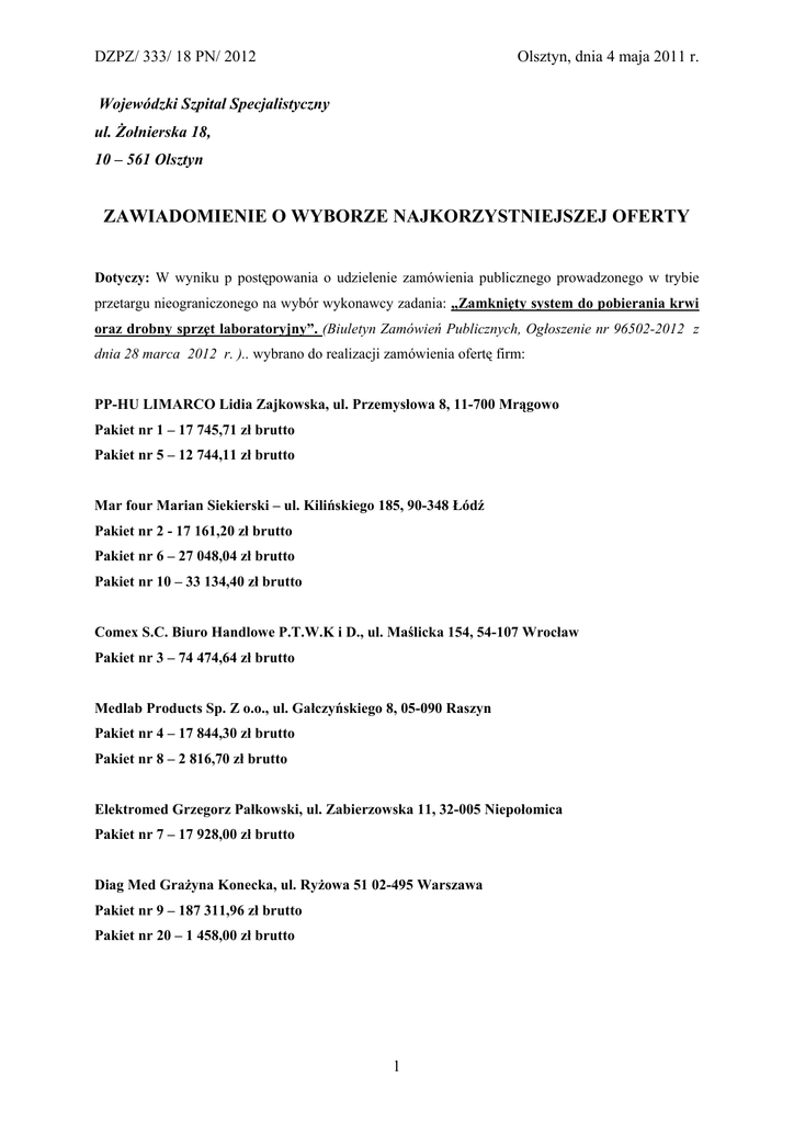 DZPZ/ 333/ 18 PN/ 2012 Olsztyn, dnia 4 maja 2011 r. Wojewódzki Szpital Specjalistyczny ul. Żołnierska 18, 10 – 561 Olsztyn ZAWIADOMIENIE O WYBORZE NAJKORZYSTNIEJSZEJ OFERTY Dotyczy: W wyniku p postępowania o udzielenie zamówienia publicznego prowadzonego w trybie przetargu nieograniczonego na wybór wykonawcy zadania: „Zamknięty system do pobierania krwi oraz drobny sprzęt laboratoryjny”. (Biuletyn Zamówień Publicznych, Ogłoszenie nr 96502-2012 z dnia 28 marca 2012 r. ).. wybrano do realizacji zamówienia ofertę firm: PP-HU LIMARCO Lidia Zajkowska, ul. Przemysłowa 8, 11-700 Mrągowo Pakiet nr 1 – 17 745,71 zł brutto Pakiet nr 5 – 12 744,11 zł brutto Mar four Marian Siekierski – ul. Kilińskiego 185, 90-348 Łódź Pakiet nr 2 - 17 161,20 zł brutto Pakiet nr 6 – 27 048,04 zł brutto Pakiet nr 10 – 33 134,40 zł brutto Comex S.C. Biuro Handlowe P.T.W.K i D., ul. Maślicka 154, 54-107 Wrocław Pakiet nr 3 – 74 474,64 zł brutto Medlab Products Sp. Z o.o., ul. Gałczyńskiego 8, 05-090 Raszyn Pakiet nr 4 – 17 844,30 zł brutto Pakiet nr 8 – 2 816,70 zł brutto Elektromed Grzegorz Pałkowski, ul. Zabierzowska 11, 32-005 Niepołomica Pakiet nr 7 – 17 928,00 zł brutto Diag Med Grażyna Konecka, ul. Ryżowa 51 02-495 Warszawa Pakiet nr 9 – 187 311,96 zł brutto Pakiet nr 20 – 1 458,00 zł brutto 1 DZPZ/ 333/ 18 PN/ 2012 Olsztyn, dnia 4 maja 2011 r. Uzasadnienie wyboru: Wybrane oferty w najwyższym stopniu wypełniły wymagania określone w przyjętych kryteriach wyboru jakimi były: cena – pakiety 1, 4, 5, 6, 7, 8, 9 i 11-20 oraz cena i jakość – pakiety nr 2, 3 i 10. W postępowaniu udział wzięli: Numer oferty Nazwa (firma) i adres wykonawcy Cena brutto PLN Pakiet nr 1 – 17 745,71 Pakiet nr 4 – 19 168,92 Pakiet nr 5 – 12 744,11 Pakiet nr 2 – 7 713,36 Pakiet nr 4 – 17 844,30 Pakiet nr 8 – 2 816,70 Warunki płatności 01 PP-HU LIMARCO Lidia Zajkowska, ul. Przemysłowa 8, 11700 Mrągowo 02 Medlab Products Sp. Z o.o., ul. Gałczyńskiego 8, 05-090 Raszyn 03 Comex S.C. Biuro Handlowe P.T.W.K i D., ul. Maślicka 154, 54-107 Wrocław Pakiet nr 2 – 37 553,76 Pakiet nr 3 – 74 474,64 30 dni 04 FutureMed Christom Petrou, ul. Chłapowskiego 12, 02-787 Warszawa Pakiet nr 4 – 25 488,00 30 dni 05 Profilab s.c. Włodzimierz Stachura, Jerzy Holli, Anna Wiącek – Żychlińśka, Al. Bohaterów Września 9, 02-389 Warszawa Pakiet nr 1 – 22 539,66 Pakiet nr 2 – 8 395,49 Pakiet nr 3 – 53 876,88 Pakiet nr 4 – 20 212,20 Pakiet nr 5 – 16 666,83 30 dni 06 Medan Andrzej Hędrzak, ul. A Korczoka 32, 44-103 Gliwice Pakiet nr 4 – 21 289,93 Pakiet nr 5 – 14 415,84 30 dni 07 PP-H Anga, Gabriela Anioła, ul. Kosowska 13, 60-464 Poznań Pakiet nr 7 – 20 016,00 30 dni 08 Hygeco Polska sp. Z o.o., ul Partyzantów 34, 05-092 Łomianki Pakiet nr 2 – 11 754, 72 Pakiet nr 3 – 33 542, 10 30 dni 09 Olympus Polska Sp. Z o.o., ul. Suwak 3, 02-676 Warszawa Pakiet nr 10 – 32 702, 40 30 dni Pakiet nr 2 – 17 161,20 Pakiet nr 3 – 61 736,04 Pakiet nr 4 – 25 412,40 Pakiet nr 5 – 16 918,20 Pakiet nr 6 – 27 048,04 Pakiet nr 10 – 33 134, 40 Pakiet nr 2 – 10 324,80 Pakiet nr 3 – 37 851,84 Pakiet nr 7 – 17 928,00 Pakiet nr 10 – 27 373, 68 30 dni 30 dni 10 Mar four Marian Siekierski – ul. Kilińskiego 185, 90-348 Łódź 11 Elektromed Grzegorz Pałkowski, ul. Zabierzowska 11, 32005 Niepołomica 12 Diag Med Grażyna Konecka, ul. Ryżowa 51 02-495 Warszawa Pakiet nr 9 – 187 311,96 Pakiet nr 20 – 1 458,00 30 dni 13 Emapol Sp. Z o.o., ul. Budowlanych 68, 80-298 Gdańsk Pakiet nr 4 – 25 480,28 30 dni 2 30 dni 30 dni DZPZ/ 333/ 18 PN/ 2012 Olsztyn, dnia 4 maja 2011 r. Streszczenie i porównanie złożonych ofert Pakiet nr 1 Numer oferty, nazwa wykonawcy punkty Lokata 01 - PP-HU LIMARCO Lidia Zajkowska, ul. Przemysłowa 8, 11-700 Mrągowo 1,0 I 05 - Profilab s.c. Włodzimierz Stachura, Jerzy Holli, Anna Wiącek – Żychlińśka, Al. Bohaterów Września 9, 02-389 Warszawa 0,787 II Pakiet nr 2 Pkt w kryterium cena Pkt w kryterium jakość Punkty – Lokata 10 - Mar four Marian Siekierski – ul. Kilińskiego 185, 90-348 Łódź 0,7 0,3 1,0 I 03 - Comex S.C. Biuro Handlowe P.T.W.K i D., ul. Maślicka 154, 54-107 Wrocław 0,320 0,3 0,620 II Numer oferty, nazwa wykonawcy Pkt w kryterium cena Pkt w kryterium jakość Punkty – Lokata 03 - Comex S.C. Biuro Handlowe P.T.W.K i D., ul. Maślicka 154, 54-107 Wrocław 0,7 0,3 1,0 I Pakiet nr 3 Pakiet nr 4 Numer oferty, nazwa wykonawcy punkty Lokata 01 - PP-HU LIMARCO Lidia Zajkowska, ul. Przemysłowa 8, 11-700 Mrągowo 0,930 II 02 - Medlab Products Sp. Z o.o., ul. Gałczyńskiego 8, 05-090 Raszyn 1,0 I 04 - FutureMed Christom Petrou, ul. Chłapowskiego 12, 02-787 Warszawa 0,700 VI 05 - Profilab s.c. Włodzimierz Stachura, Jerzy Holli, Anna Wiącek – Żychlińśka, Al. Bohaterów Września 9, 02-389 Warszawa 0,882 III 06 - Medan Andrzej Hędrzak, ul. A Korczoka 32, 44-103 Gliwice 0,838 IV 3 DZPZ/ 333/ 18 PN/ 2012 Olsztyn, dnia 4 maja 2011 r. 10 - Mar four Marian Siekierski – ul. Kilińskiego 185, 90-348 Łódź 0,702 V 13 - Emapol Sp. Z o.o., ul. Budowlanych 68, 80-298 Gdańsk 0,700 VI Numer oferty, nazwa wykonawcy punkty Lokata 01 - PP-HU LIMARCO Lidia Zajkowska, ul. Przemysłowa 8, 11-700 Mrągowo 1,0 I 05 - Profilab s.c. Włodzimierz Stachura, Jerzy Holli, Anna Wiącek – Żychlińśka, Al. Bohaterów Września 9, 02-389 Warszawa 0,764 II 06 - Medan Andrzej Hędrzak, ul. A Korczoka 32, 44-103 Gliwice 0,884 III 10 - Mar four Marian Siekierski – ul. Kilińskiego 185, 90-348 Łódź 0,753 IV Numer oferty, nazwa wykonawcy punkty Lokata 10 - Mar four Marian Siekierski – ul. Kilińskiego 185, 90-348 Łódź 1,0 I Numer oferty, nazwa wykonawcy punkty Lokata 07 - PP-H Anga, Gabriela Anioła, ul. Kosowska 13, 60-464 Poznań 0,895 II 11 - Elektromed Grzegorz Pałkowski, ul. Zabierzowska 11, 32-005 Niepołomica 1,0 I Numer oferty, nazwa wykonawcy punkty Lokata 02 - Medlab Products Sp. Z o.o., ul. 