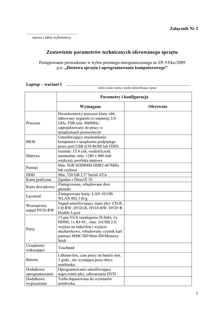 Załącznik r 2 ......................................................... nazwa i adres wykonawcy Zestawienie parametrów technicznych oferowanego sprzętu Postępowanie prowadzone w trybie przetargu nieograniczonego nr ZP-5/Eko/2009 p.n. „Dostawa sprzętu i oprogramowania komputerowego” Laptop – wariant I ................................................................................................................. należy podać markę i model identyfikujące sprzęt Parametry i konfiguracja Wymagane Oferowane Dwurdzeniowy procesor klasy x86, taktowany zegarem co najmniej 2,0 Procesor GHz, FSB min. 800MHz, zaprojektowany do pracy w urządzeniach przenośnych Umożliwiający uruchomienie BIOS komputera z urządzenia podpiętego przez port USB (CD-ROM lub FDD) rozmiar: 15,4 cali, rozdzielczość Matryca nominalna: min. 1280 x 800 (lub większa), powłoka matowa Min. 3GB SODIMM DDR2 667MHz Pamięć lub szybsza HDD Min. 320 GB 2.5" Serial ATA Karta graficzna Zgodna z DirectX 10 Zintegrowana, wbudowane dwa Karta dźwiękowa głośniki Zintegrowane karty: LAN 10/100, Łączność WLAN 802.11b/g Napęd umożliwiający zapis płyt: CD-R, Wewnętrzny CD-RW, DVD±R, DVD±RW, DVD+R napęd DVD±RW Double Layer 15-pin VGA (analogowe D-Sub), 1x HDMI, 1x RJ-45, , min. 3xUSB 2.0, wejście na mikrofon i wyjście Porty słuchawkowe, wbudowany czytnik kart pamięci MMC/SD/Mini-SD/Memory Stick Urządzenie Touchpad wskazujące Lithium-Ion, czas pracy na baterii min. Bateria 3 godz., nie wystająca poza obrys notebooka Dodatkowe Oprogramowanie umożliwiające oprogramowanie nagrywanie płyt, odtwarzanie DVD Dodatkowe Torba dopasowana do wymiarów wyposażenie notebooka 1 Inne System operacyjny Gwarancja Mysz bezprzewodowa w komplecie MS Windows Vista Business OEM – wymagany nośnik instalacyjny 24 miesiące typu „door to door” Laptop – wariant II ............................................................................................................ należy podać markę i model identyfikujące sprzęt Parametry i konfiguracja Wymagane Oferowane Dwurdzeniowy procesor klasy x86, taktowany zegarem co najmniej 2.0 Procesor GHz, zaprojektowany do pracy w urządzeniach przenośnych Umożliwiający uruchomienie BIOS komputera z urządzenia podpiętego przez port USB (CD-ROM lub FDD) WXGA, rozmiar: 13,3 cali, Matryca rozdzielczość nominalna: 1280x800 (16:10) 3 GB SODIMM DDR2 667MHz lub Pamięć szybsza HDD Min. 250 GB Karta graficzna Zgodna z DirectX 10 Zintegrowana, wbudowane dwa Karta dźwiękowa głośniki Zintegrowane karty: LAN 10/100, Łączność WLAN 802.11a/g/n(draft-n) Napęd umożliwiający zapis płyt: CDWewnętrzny R, CD-RW, DVD±R, DVD±RW, napęd DVD±RW DVD+R Double Layer 15-pin VGA (analogowe D-Sub), 1xHDMI, 1x RJ-45, min. 3xUSB 2.0, Porty wejście na mikrofon i wyjście słuchawkowe Urządzenie Touchpad wskazujące Lithium-Ion, czas pracy na baterii min. Bateria 3 godz. Waga poniżej 2 kg Dodatkowe Oprogramowanie umożliwiające oprogramowanie nagrywanie płyt, odtwarzanie DVD Dodatkowe Torba dopasowana do wymiarów wyposażenie notebooka Inne Mysz bezprzewodowa w komplecie System MS Windows Vista Business PL OEM operacyjny – wymagany nośnik instalacyjny Gwarancja 24 miesiące typu „door to door” 2 Laptop – wariant III ………................................................................................................ należy podać markę i model identyfikujące sprzęt Parametry i konfiguracja Wymagane Oferowane Dwurdzeniowy procesor klasy x86, taktowany zegarem co najmniej 2.0 Procesor GHz, zaprojektowany do pracy w urządzeniach przenośnych Umożliwiający uruchomienie BIOS komputera z urządzenia podpiętego przez port USB (CD-ROM lub FDD) WXGA, rozmiar: 13,3 cali, Matryca rozdzielczość nominalna: 1280x800 (16:10) 3 GB SODIMM DDR2 667MHz lub Pamięć szybsza HDD Min. 250 GB Karta graficzna Zgodna z DirectX 10 Zintegrowana, wbudowane dwa Karta dźwiękowa głośniki Zintegrowane karty: LAN 10/100, Łączność WLAN 802.11a/g/n(draft-n) Napęd umożliwiający zapis płyt: CDWewnętrzny R, CD-RW, DVD±R, DVD±RW, napęd DVD±RW DVD+R Double Layer 15-pin VGA (analogowe D-Sub), 1x Porty RJ-45, min. 3xUSB 2.0, wejście na mikrofon i wyjście słuchawkowe Urządzenie Touchpad wskazujące Lithium-Ion, czas pracy na baterii min. Bateria 4 godz. Waga poniżej 2 kg Dodatkowe Oprogramowanie umożliwiające oprogramowanie nagrywanie płyt, odtwarzanie DVD Dodatkowe Torba dopasowana do wymiarów wyposażenie notebooka Inne Mysz bezprzewodowa w komplecie System MS Windows Vista Business PL OEM operacyjny – wymagany nośnik instalacyjny Gwarancja 24 miesiące typu „door to door” 3 Komputer stacjonarny – wariant I ........................................................................................................................................... należy podać markę i model identyfikujące sprzęt Parametry i konfiguracja Wymagane Oferowane Procesor klasy x86, dwurdzeniowy o częstotliwości taktowania min. 2,5 GHz, o Procesor wskaźniku poboru prądu TDP (Thermal Design Power) mniejszym lub równym 70W Pamięć RAM Min. 3GB DDR2 - 800 MHz lub szybsza Obsługa magistrali systemowej FSB min. Płyta główna 1066MHz. Obsługa procesorów czterordzeniowych. Napęd optyczny DVD +/- RW DL min. 16x min. pojemność 400GB, pracujący w Dysk twardy standardzie SATA II lub lepszy Zintegrowana z płytą główną, zgodna z Karta grafiki DirectX 10, port DVI Karta dźwiękowa Zintegrowana z płytą główną Przynajmniej 2 sloty PCI, przynajmniej 1 slot Porty PCIe, minimum 6 portów USB wyprowadzonych na zewnątrz obudowy komunikacyjne komputera System MS Windows Vista Business OEM PL – wymagany nośnik instalacyjny operacyjny Zasilacz min. 200W spełniający normę „80 PLUS” lub równoważny (o udokumentowanej Obudowa / sprawności min. 80%). Przynajmniej 2 porty USB wyprowadzone z przodu obudowy. Zasilacz Gniazdo do podłączenia słuchawek i mikrofonu wypro
