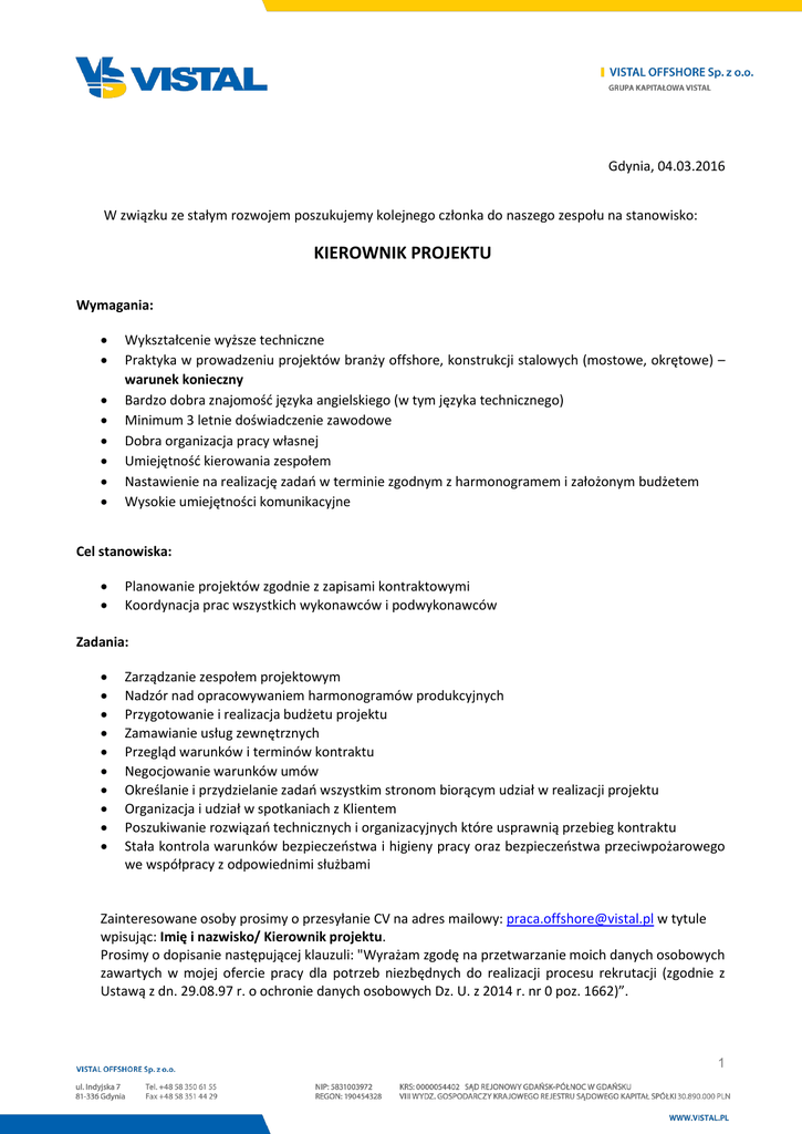 Gdynia, 04.03.2016 W związku ze stałym rozwojem poszukujemy kolejnego członka do naszego zespołu na stanowisko: KIEROWNIK PROJEKTU Wymagania: Wykształcenie wyższe techniczne Praktyka w prowadzeniu projektów branży offshore, konstrukcji stalowych (mostowe, okrętowe) – warunek konieczny Bardzo dobra znajomość języka angielskiego (w tym języka technicznego) Minimum 3 letnie doświadczenie zawodowe Dobra organizacja pracy własnej Umiejętność kierowania zespołem Nastawienie na realizację zadań w terminie zgodnym z harmonogramem i założonym budżetem Wysokie umiejętności komunikacyjne Cel stanowiska: Planowanie projektów zgodnie z zapisami kontraktowymi Koordynacja prac wszystkich wykonawców i podwykonawców Zadania: Zarządzanie zespołem projektowym Nadzór nad opracowywaniem harmonogramów produkcyjnych Przygotowanie i realizacja budżetu projektu Zamawianie usług zewnętrznych Przegląd warunków i terminów kontraktu Negocjowanie warunków umów Określanie i przydzielanie zadań wszystkim stronom biorącym udział w realizacji projektu Organizacja i udział w spotkaniach z Klientem Poszukiwanie rozwiązań technicznych i organizacyjnych które usprawnią przebieg kontraktu Stała kontrola warunków bezpieczeństwa i higieny pracy oraz bezpieczeństwa przeciwpożarowego we współpracy z odpowiednimi służbami Zainteresowane osoby prosimy o przesyłanie CV na adres mailowy: [email protected] w tytule wpisując: Imię i nazwisko/ Kierownik projektu. Prosimy o dopisanie następującej klauzuli: "Wyrażam zgodę na przetwarzanie moich danych osobowych zawartych w mojej ofercie pracy dla potrzeb niezbędnych do realizacji procesu rekrutacji (zgodnie z Ustawą z dn. 29.08.97 r. o ochronie danych osobowych Dz. U. z 2014 r. nr 0 poz. 1662)”. 1