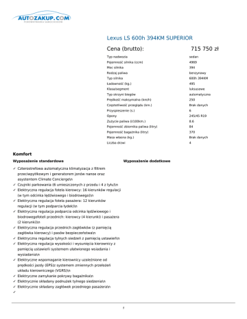 Lexus LS 600h 394KM SUPERIOR Cena (brutto): 715 750 zł Typ nadwozia sedan Pojemność silnika (ccm) 4969 Moc silnika 394 Rodzaj paliwa benzynowy Typ silnika 600h 394KM Ładowność (kg.) 495 Klasa/segment luksusowe Typ skrzyni biegów automatyczna Prędkość maksymalna (km/h) 250 Częstotliwość przeglądu (km.) Brak danych Przyspieszenie (s.) 6 Opony 245/45 R19 Zużycie paliwa (l/100km.) 8.6 Pojemność zbiornika paliwa (litry) 84 Pojemność bagażnika (litry) 370 Masa własna (kg.) Brak danych Liczba drzwi 4 Komfort Wyposażenie standardowe Wyposażenie dodatkowe ✓ Czterostrefowa automatyczna klimatyzacja z filtrem przeciwpytłkowym i generatorem jonów nanoe oraz asystentem Climate Concierge\n ✓ Czujniki parkowania (6 umieszczonych z przodu i 4 z tyłu)\n ✓ Elektryczna regulacja fotela kierowcy: 16 kierunków regulacji (w tym odcinka lędźwiowego i biodrowego)\n ✓ Elektryczna regulacja fotela pasażera: 12 kierunków regulacji (w tym podparcia łydek)\n ✓ Elektryczna regulacja podparcia odcinka lędźwiowego i biodrowegofoteli przednich: kierowcy (4 kierunki) i pasażera (2 kierunki)\n ✓ Elektryczna regulacja przednich zagłówków (z pamięcią zagłówka kierowcy) i pasów bezpieczeństwa\n ✓ Elektryczna regulacja tylnych siedzeń z pamięcią ustawień\n ✓ Elektryczna regulacja wysokości i wysunięcia kierownicy z pamięcią ustawieńi systemem ułatwionego wsiadania i wysiadania\n ✓ Elektryczne wspomaganie kierownicy uzależnione od prędkości jazdy (EPS)z systemem zmiennych przełożeń układu kierowniczego (VGRS)\n ✓ Elektryczne zamykanie pokrywy bagażnika\n ✓ Elektrycznie składany podnużek tylnego siedzenia\n ✓ Elektrycznie składany zagłówek przedniego pasażera\n ✓ 1 Elektryczny szyberdach\n 2 ✓ Fotele tylne z funkcją regulacji podparcia i masażu odcinka lędźwiowego\n ✓ Inteligentna karta (Inteligentny kluczyk w postaci płaskiej karty)\n ✓ Komfortowe zagłówki tylne z elektryczną regulacją i pamięcią ustawień\n ✓ Konfiguracja z trzema miejscami dla pasażerów z tyłu\n ✓ Lusterko wewnętrzne wsteczne elektrochromatyczne\n ✓ Nawiewy klimatyzacji w podsufitce\n ✓ Ogrzewanie kierownicy\n ✓ Pamięci ustawienia fotela kierowcy, kierownicy, lusterek i wysokości przednich pasów bezpieczeństwa\n ✓ Pamięci ustawienia fotela pasażera i wysokości mocowania pasa bezpieczeństwa\n ✓ Pilot sterujący ustawieniami masażu\n ✓ Podgrzewane i wentylowane przednie fotele\n ✓ Podgrzewanie tylnych siedzeń\n ✓ Rolety przeciwsłoneczne szyb drzwi tylnych regulowane elektrycznie\n ✓ System głosowego sterowania systemami audio i nawigacji\n ✓ System Inteligentny kluczyk: otwieranie i uruchamianie pojazdu bez użycia klucza\n ✓ Tapicerka skórzana foteli i podłokietnika o podwyższonym standardzie - skóra półanilinowa\n ✓ Tempomat (Cruise Control)\n ✓ Wentylacja tylnych foteli\n ✓ Wycieraczki szyby przedniej z czujnikiem deszczu i regulacją prędkości pracy\n ✓ Zwiększony zakres odsuwania fotela przedniego pasażera (260+40mm)\n Bezpieczeństwo Wyposażenie standardowe Wyposażenie dodatkowe ✓ 3-punktowe pasy bezpieczeństwa dla każdego miejsca siedzącego\n ✓ Aktywne zagłówki przednich foteli\n ✓ Aktywny tempomat działający przy wszystkich prędkościach (all-speed ACC)\n ✓ Asystent utrzymania pasa ruchu (LKA)\n ✓ Boczne kurtyny powietrzne na całej długości wnętrza pojazdu\n ✓ Centralny zamek z podwójną blokadą i automatycznym zamykaniem pojazdu po rozpoczęciu jazdy\n ✓ Dwustopniowe poduszki powietrzne kierowcy i pasażera (przednie)\n ✓ Elektronicznie sterowany hamulec postojowy (EPB)\n ✓ Poduszka powietrzna chroniąca kolana kierowcy i pasażera\n 3 ✓ Poduszka powietrzna pasażera przedniego fotela z możliwością deaktywacji\n ✓ Poduszka powietrzna w siedzisku tylnego fotela\n ✓ Przednie boczne poduszki powietrzne\n ✓ Przednie zagłówki typu WIL\n ✓ Światła awaryjnego hamowania (EBS)\n ✓ Sygnalizacja niezapiętych pasów bezpieczeństwa\n ✓ System antykradzieżowy z syreną, czujnikiem wtargnięcia i czujnikiem przechyłu\n ✓ System antypoślizgowy (ABS)\n ✓ System elektronicznej kontroli hamulców (ECB)z systemem elektronicznego rozdziału siły hamowania (EBD)\n ✓ System kontroli trakcji (TRC) z odłączanym system stabilizacji toru jazdy (VSC)\n ✓ System monitorowania "martwego pola" (BSM)\n ✓ System wspomagania jazdy w nocy Night View\n ✓ Zaawansowany system ochrony przedzderzeniowej (APCS)\n ✓ Zaczepy do mocowania fotelika dziecięcego w systemie ISOFIX\n ✓ Zintegrowany system zarządzania dynamiką pojazdu (VDIM)\n Dodatki Wyposażenie standardowe Wyposażenie dodatkowe ✓ 19-calowe, 15-ramienne obręcze kół z lekkiego stopu ✕ 19-calowe obręcze z komorą tłumiącą hałas 2000 PLN (245/45 R19) ✓ 3-ramienna, skórzano-drewniana kierownica z panelem ✕ Elementy ozdobne Shimamoku 2400 PLN sterującymoraz częścią środkową wykończoną skórą ✓ Adaptacyjny system świateł drogowych (AHS) ✕ Lakier metalik, mika, perła lub biały F 7200 PLN ✓ Boczne poduszki powietrzne foteli tylnych\n ✓ Dodatkowe drewniane elementy wykończeniowe tylnej części konsoli centralnej\n ✓ Dodatkowe wejście USB i AUX do obsługi zewnętrznych urządzeń audio\n ✓ Dwie popielniczki w tylnej części kabiny pojazdu\n ✓ Dywaniki\n ✓ E-CVT przekładnia planetarna z sekwencyjnym trybem pracy\n ✓ Ekran komputera pokładowego 5,8" na tablicy przyrządów\n ✓ Ekran multimedialny o przekątnej 12,3" z interfejsem Remote Touch\n ✓ Elementy ozdobne drewniane\n ✓ Immobilizer\n ✓ Kino samochodowe: DVD, BlueRay, monitor LCD dla pasażerów siedzącychna tylnych fotelach umieszczony w konsoli centralnej\n ✓ Lakier odporny na drobne zarysowania\n 4 ✓ Lusterka boczne fotochromatyczne, elektrycznie składane i podgrzewane,zespolone z lampami kierunkowskazów\n ✓ Pełnowymiarowe koło zapasowe\n ✓ Pionowe światła pr