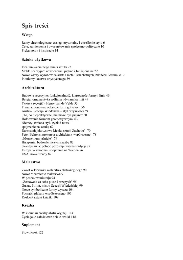 Spis treści Wstęp Ramy chronologiczne, zasięg terytorialny i określenie stylu 6 Cele, zamierzenia i uwarunkowania społeczno-polityczne 10 Prekursorzy i inspiracje 14 Sztuka uŜytkowa Ideał uniwersalnego dzieła sztuki 22 Meble secesyjne: nowoczesne, piękne i funkcjonalne 22 Nowe wzory wyrobów ze szkła i metali szlachetnych, biŜuterii i ceramiki 33 Pionierzy tkactwa artystycznego 39 Architektura Budowle secesyjne: funkcjonalność, klarowność formy i linia 46 Belgia: ornamentyka roślinna i dynamika linii 49 Twórca secesji? - Henry van de Velde 53 Francja: ponowne odkrycie form gotyckich 56 Austria: Secesja Wiedeńska – styl przyszłości 59 „To, co niepraktyczne, nie moŜe być piękne" 60 Hołdowanie formom geometrycznym 63 Niemcy: zmiana stylu Ŝycia i nowe spojrzenie na sztukę 69 Darmstadt jako „nowa Mekka sztuki Zachodu" 70 Peter Behrens, prekursor architektury współczesnej 78 „Monachium jaśnieje" 79 Hiszpania: budowle niczym rzeźby 82 Skandynawia: północ pozostaje wierna tradycji 85 Europa Wschodnia: spojrzenie na Wiedeń 86 USA: nowe trendy 87 Malarstwo Zwrot w kierunku malarstwa abstrakcyjnego 90 Nowe rozumienie malarstwa 91 W poszukiwaniu raju 94 „Zostawcie za sobą plusz i przepych" 95 Gustav Klimt, mistrz Secesji Wiedeńskiej 99 Nowe symboliczne formy wyrazu 104 Początki plakatu współczesnego 106 Rozkwit sztuki ksiąŜki 109 Rzeźba W kierunku rzeźby abstrakcyjnej 114 śycie jako całościowe dzieło sztuki 118 Suplement Słowniczek 122 Propozycje podróŜy 124 Literatura 126 Wykaz okienek informacyjnych 127 Źródła ilustracji 127 Indeks 128