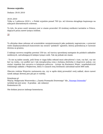 Drewno wyjeżdża Dodano: 29.01.2010 29.01.2010 Tylko w I półroczu 2010 r. z Polski wyjedzie ponad 700 tys. m3 drewna okrągłego kupionego na aukcjach internetowych e-drewno. To tyle, ile przez sześć miesięcy jest w stanie przerobić 20 średniej wielkości tartaków w Polsce, dających pracę nawet tysiącu osobom. To oficjalne dane zebrane od uczestników zarejestrowanych jako podmioty zagraniczne, a przecież wiele międzynarodowych koncernów ma swoich "polskich" agentów, którzy pośredniczą w wywozie drewna za granicę. Z takiego surowca mogłoby powstać 350 tys. m3 tarcicy sprzedanej następnie do polskich zakładów meblowych, zatrudniających kolejne tysiące osób. Tak się jednak nie stanie. - To nie są żadne zasady, jeśli firma w ciągu kilku sekund musi zdecydować o tym, czy być, czy nie być na rynku, czy podbić już i tak nieopłacalną cenę o kolejną złotówkę w dogrywce aukcji, czy zostać zupełnie bez surowca w kolejnym półroczu - irytuje się Kazimierz Wejer, współwłaściciel rodzinnego zakładu z Wejherowa, który w czasach swej świetności zatrudniał nawet 800 osób. Obecnie rodzina Wejerów zastanawia się, czy w ogóle dalej prowadzić swój zakład, skoro nawet rynek zakupu drewna jest jak gra w ruletkę. firmylesne.pl Więcej: Małgorzata Wnorowska z „Gazety Przemysłu Drzewnego” dla „Naszego Dziennika” (artykuł nie jest nowy - 8 grudnia - ale ciekawy) Komentarze (0) Nie dodano jeszcze żadnego komentarza.