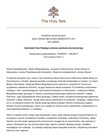 The Holy See PODRÓŻ APOSTOLSKA JEGO ŚWIĄTOBLIWOŚCI BENEDYKTA XVI DO LIBANU Odpowiedź Ojca Świętego podczas spotkania ekumenicznego Patriarchat syryjskokatolicki, CHARFET – BEJRUT (16 września 2012 r.) Wasza Świątobliwość, Wielce Błogosławiony, czcigodni Patriarchowie, drodzy Bracia w biskupstwie, drodzy Przedstawiciele Kościołów i Wspólnot protestanckich, drodzy Bracia! Z radością spotykam się z wami w tym klasztorze Notre Dame de la Délivrance (Matki Bożej od Wyzwolenia) w Charfet, głównej siedzibie syryjskiego Kościoła katolickiego w Libanie i na całym Bliskim Wschodzie. Dziękuję Wielce Błogosławionemu Ignacemu Józefowi III Younanowi, syryjskiemu patriarsze Antiochii, za jego serdeczne słowa powitania. Po bratersku pozdrawiam każdego z was, reprezentujących różnorodność Kościoła na Wschodzie, a zwłaszcza Wielce Błogosławionego Ignacego IV Hazima, greckoprawosławnego patriarchę Antiochii i całego Wschodu, Jego Świątobliwość Mara Ignacego I Zakkę Iwasa, syryjskoortodoksyjnego patriarchę Antiochii i całego Wschodu. Swoją obecnością uświetniacie to spotkanie. Dziękuję z całego serca za to, że jesteście wśród nas. Myślą obejmuję także koptyjski Kościół ortodoksyjny Egiptu i etiopski Kościół ortodoksyjny, które są w żałobie po stracie swych patriarchów. Zapewniam je o mej braterskiej bliskości i o modlitwie. Niech mi będzie wolno oddać hołd świadectwu wiary, które składał syryjski Kościół Antiochii na przestrzeni swoich chwalebnych dziejów, świadectwu żarliwego umiłowania Chrystusa, dzięki któremu po dziś dzień zapisuje karty heroicznych zmagań aż po męczeństwo, aby wytrwać w wierze. Zachęcam go, aby był dla ludów tego regionu znakiem Bożego pokoju i światłem ożywiającym ich nadzieję. Tą zachętą obejmuję także wszystkie Kościoły i Wspólnoty kościelne obecne w tym regionie. 2 Drodzy bracia, dzisiejsze wieczorne spotkanie jest wymownym znakiem naszego głębokiego pragnienia, by odpowiedzieć na wezwanie Pana Jezusa: «Aby wszyscy stanowili jedno» (J 17, 21). W tych zmiennych i podatnych na przemoc czasach, w których żyje wasz region, coraz bardziej konieczne jest, by uczniowie Chrystusa dawali autentyczne świadectwo swej jedności, aby świat uwierzył w Jego orędzie miłości, pokoju i pojednania. Misją, którą otrzymali wszyscy chrześcijanie, a my w szczególności, jest przekazywanie światu tego orędzia, które ma nieocenioną wartość w obecnym kontekście Bliskiego Wschodu. Pracujmy niestrudzenie, aby nasza miłość do Chrystusa prowadziła nas stopniowo ku pełnej jedności. Dlatego musimy przez modlitwę i wspólne zaangażowanie nieustannie zwracać się do naszego jedynego Pana i Zbawiciela. Jak bowiem napisałem w adhortacji apostolskiej Ecclesia in Medio Oriente, którą z radością wam wręczyłem, «Jezus jednoczy tych, którzy w Niego wierzą i którzy Go kochają, dając im Ducha swego Ojca oraz swoją Matkę Maryję» (n. 15). Zawierzam Maryi Pannie każdego z was oraz członków waszych Kościołów i Wspólnot. Niech nam Ona wyprasza u swego Boskiego Syna, abyśmy zostali uwolnieni od wszelkiego zła i wszelkiej przemocy oraz by w tym regionie Bliskiego Wschodu nastał wreszcie czas pojednania i pokoju. Niech słowa Jezusa, które często cytuję podczas tej wizyty: «[ مُكيطعُأ يمالَسPokój mój daję wam»] (J 14, 27), będą dla nas wszystkich wspólnym znakiem, jaki damy w imię Chrystusa ludom tego umiłowanego regionu, który gorąco pragnie spełnienia tej zapowiedzi! Dziękuję! © Copyright 2012 - Libreria Editrice Vaticana © Copyright - Libreria Editrice Vaticana