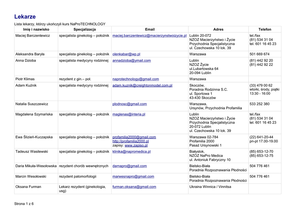 Lekarze Lista lekarzy, którzy ukończyli kurs NaProTECHNOLOGY Imię i nazwisko Specjalizacja Email Adres Telefon Maciej Barczentewicz specjalista ginekolog – położnik [email protected] Lublin 20-072 NZOZ Macierzyństwo i Życie Przychodnia Specjalistyczna ul. Czechowska 10 lok. 39 tel./fax (81) 534 31 04 tel. 601 16 45 23 Aleksandra Baryła specjalista ginekolog – położnik [email protected] Warszawa 501 669 674 Anna Dzioba specjalista medycyny rodzinnej [email protected] Lublin NZOZ Życie ul.Lubartowska 64 20-094 Lublin (81) 442 92 20 (81) 442 92 22 Piotr Klimas rezydent z gin.– poł. [email protected] Warszawa Adam Kuźnik specjalista medycyny rodzinnej [email protected] Skoczów, Poradnia Rodzinna S.C. ul. Sportowa 1 43-430 Skoczòw (33) 479 00 62 wtorki, środy, piątki 13:30 - 16:00 [email protected] Warszawa, Ursynów, Przychodnia Profamilia 533 252 380 Natalia Suszczewicz Magdalena Szymańska specjalista ginekolog – położnik [email protected] Lublin NZOZ Macierzyństwo i Życie Przychodnia Specjalistyczna 20-072 Lublin ul. Czechowska 10 lok. 39 tel./fax (81) 534 31 04 tel. 601 16 45 23 Ewa Ślizień-Kuczapska specjalista ginekolog – położnik [email protected] http://profamilia2000.pl zapisy: www.zapiso.pl Warszawa 02-784 Profamilia 2000 Pasaż Ursynowski 1 (22) 641-20-44 pn-pt 17.00-19.00 Tadeusz Wasilewski specjalista ginekolog – położnik [email protected] Białystok, NZOZ NaPro Medica ul. Antoniuk Fabryczny 10 (85) 653-12-70 (85) 653-12-75 Daria Mikuła-Wesołowska rezydent chorób wewnętrznych [email protected] Bielsko-Biała 504 776 461 Poradnia Rozpoznawania Płodności Marcin Wesołowski rezydent patomorfologii [email protected] Bielsko-Biała 504 776 461 Poradnia Rozpoznawania Płodności Oksana Furman Lekarz rezydent (ginekologia, usg) [email protected] Ukraina Winnica / Vinnitsa Strona 1 z 6 Instruktorzy Modelu Creighton Imię i nazwisko Status Email Adres Telefon woj. kujawsko-pomorskie Marzena Lewandowska instruktor [email protected] Inowrocław 783-369-378 w trakcie szkolenia [email protected] Lublin NZOZ Życie ul.Lubartowska 64 20-094 Lublin (81) 442 92 20 (81) 442 92 22 Agnieszka Japola-Jankowska w trakcie szkolenia [email protected] Lublin 784-398-003 Małgorzata Pezda w trakcie szkolenia [email protected] Lublin Monika Szczepanik w trakcie szkolenia [email protected] Lublin 605-991-266 lekarz Magdalena Szymańska w trakcie szkolenia [email protected] Lublin (81) 534 31 04 tel. 601 16 45 23 Anna Wojtyła w trakcie szkolenia [email protected] Lublin Olimpia Janz w trakcie szkolenia [email protected] Łódź 603-925-145 Anna Dziuba-Marzec w trakcie szkolenia [email protected] Wieluń 607-822-291 Beata Helizanowicz instruktor [email protected] Kraków, NZOZ "Judym" ul. Heleny 2 www.naprolife.pl 607 33 19 33 Iwona Koprowska w trakcie szkolenia [email protected] Kraków 600 701 799 Piotr Michalski w trakcie szkolenia [email protected] Kraków 889 015 556 Anna Orkisz instruktor [email protected] Kraków 601 053 629 Izabela Salata instruktor [email protected] Kraków www.naproplus.pl 503 53 66 04 Marta Wierzbicka-Kuczaj instruktor [email protected] Kraków 664 24 38 29 woj. lubelskie lekarz Anna Dzioba woj. łódzkie woj. małopolskie Strona 2 z 6 Imię i nazwisko Agnieszka Juszczyk Status Email Adres Telefon instruktor [email protected] Tarnów ul. Kolejowa 43 33-101 Tarnów www.naprocare.pl 693 110 006 Hanna Kamińska w trakcie szkolenia [email protected] Warszawa 607-180-325 Katarzyna Kaszo-Stanik instruktor [email protected] Radom 510-052-049, (48) 360-70-17 [email protected] Warszawa woj. mazowieckie lekarz Piotr Klimas dr Edyta Kopera (dr biochemii) w trakcie szkolenia [email protected] Warszawa Elżbieta Marchlewska w trakcie szkolenia [email protected] Warszawa 609 358 846 www.naprotechnology.waw.pl Małgorzata Mąsiorska w trakcie szkolenia [email protected] Warszawa 602 715 329 Agnieszka Pietrusińska instruktor [email protected] Warszawa 796 740 115 lek. Natalia Suszczewicz w trakcie szkolenia [email protected] Warszawa Ursynów, Przychodnia Profamilia 533252380 Agnieszka Ostrowska w trakcie szkolenia [email protected] Białystok (85) 653-12-70, (85) 653-12-75 Agata Szadkowska w trakcie szkolenia [email protected] Białystok (85) 653-12-70, (85) 653-12-75 w trakcie szkolenia [email protected] [email protected] Gdańsk www.darplodnosci.pl 504 686 992 lekarz Daria MikułaWesołowska w trakcie szkolenia [email protected] Bielsko-Biała 504 776 461 Poradnia Rozpoznawania Płodności lekarz Marcin Wesołowski w trakcie szkolenia [email protected] Bielsko-Biała 504 776 461 Poradnia Rozpoznawania Płodności woj. podlaskie woj. pomorskie Aleksandra Gucka woj. śląskie Strona 3 z 6 Imię i nazwisko Status Email Adres Telefon Joanna Golonka w trakcie szkolenia [email protected] Katowice 519 512 947 Ewa Jurczyk certyfikowany instruktor [email protected] [email protected] Mysłowice "NaProFamilia"-w trosce o pełną rodzinę Mysłowice ul. Zapolskiej 21 www.naprofamilia.pl 882 795 099 lekarz Adam Kuźnik w trakcie szkolenia [email protected] Skoczów, Poradnia Rodzinna S.C. ul. Sportowa 1 43-430 Skoczòw (33) 479 00 62 wtorki, środy, piątki 13:30 16:00 Teresa Tabor w trakcie szkolenia [email protected] Sosnowiec 32 269 51 70 Centrum Służby Rodzinie i Życiu ul. Skautów 1 41-200 Sosnowiec Tomasz Rychły w trakcie szkolenia [email protected] Zabrze Katarzyna Morzy w trakcie szkolenia [email protected] Żywiec / Milówka 505 682 499 [email protected] Olsztyn 0609925755 / +353870667056 woj. warmińsko – mazurskie Lena Szturomska-Józwik w trakcie szkolenia woj. wielkopolskie Paulina Michalska w trakcie szkolenia [email protected] Poznań 661 145 459 Mirosława Szymaniak instruktor [email protected] [email protected] Poznań www.pronapro.pl 667 296 723, (061)8193 442 Marta Czaplewska w trakcie szkolenia [email protected] (w tytule: naprotechnologia) Licheń Stary (63) 270 81 32 NAProTECHNOLOGIA Poradnia Wsparcia Płodności, ul.Klasztorna 4 Urs