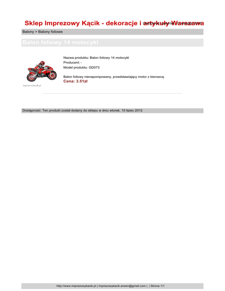 czwartek, 11 sierpień 2016 Sklep Imprezowy Kącik - dekoracje i Utworzono: artykuły Warszawa Balony > Balony foliowe Balon foliowy 14 motocykl Nazwa produktu: Balon foliowy 14 motocykl Producent: Model produktu: GD073 Balon foliowy nienapompowany, przedstawiający motor z kierowcą. Cena: 3.51zł Dostępność: Ten produkt został dodany do sklepu w dniu wtorek, 10 lipiec 2012 http://www.imprezowykacik.pl | [email protected] | | Strona 1/1