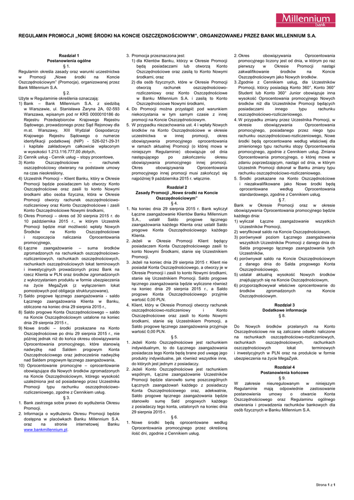 REGULAMIN PROMOCJI „NOWE ŚRODKI NA KONCIE OSZCZĘDNOŚCIOWYM”, ORGANIZOWANEJ PRZEZ BANK MILLENNIUM S.A. Rozdział 1 Postanowienia ogólne § 1. Regulamin określa zasady oraz warunki uczestnictwa w Promocji „Nowe środki na Koncie Oszczędnościowym” (Promocja), organizowanej przez Bank Millennium S.A. § 2. Użyte w Regulaminie określenia oznaczają: 1) Bank – Bank Millennium S.A. z siedzibą w Warszawie, ul. Stanisława Żaryna 2A, 02-593 Warszawa, wpisanym pod nr KRS 0000010186 do Rejestru Przedsiębiorców Krajowego Rejestru Sądowego, prowadzonego przez Sąd Rejonowy dla m.st. Warszawy, XIII Wydział Gospodarczy Krajowego Rejestru Sądowego o numerze identyfikacji podatkowej (NIP) - 526-021-29-31 i kapitale zakładowym całkowicie wpłaconym w wysokości 1.213.116.777,00 złotych, 2) Cennik usług - Cennik usług – stopy procentowe, 3) Konto Oszczędnościowe – rachunek oszczędnościowy otwierany na podstawie umowy na czas nieokreślony, 4) Uczestnik Promocji – Klient Banku, który w Okresie Promocji będzie posiadaczem lub otworzy Konto Oszczędnościowe oraz zasili to konto Nowymi środkami albo osoba fizyczna, która w Okresie Promocji otworzy rachunek oszczędnościoworozliczeniowy oraz Konto Oszczędnościowe i zasili Konto Oszczędnościowe Nowymi środkami, 5) Okres Promocji – okres od 30 sierpnia 2015 r. do 10 października 2015 r., w którym Uczestnik Promocji będzie miał możliwość wpłaty Nowych Środków na Konto Oszczędnościowe i rozpoczęcia naliczania Oprocentowania promocyjnego, 6) Łączne zaangażowanie – suma środków zgromadzonych na rachunkach oszczędnościoworozliczeniowych, rachunkach oszczędnościowych, rachunkach oszczędnościowych lokat terminowych i inwestycyjnych prowadzonych przez Bank na rzecz Klienta w PLN oraz środków zgromadzonych z wykorzystaniem produktu w formie ubezpieczenia na życie MegaZysk (z wyłączeniem lokat pomostowych pod obligacje strukturyzowane), 7) Saldo progowe łącznego zaangażowania - saldo Łącznego zaangażowania Klienta w Banku, obliczone na koniec dnia 29 sierpnia 2015 r., 8) Saldo progowe Konta Oszczędnościowego – saldo na Koncie Oszczędnościowym ustalone na koniec dnia 29 sierpnia 2015 r., 9) Nowe środki – środki przekazane na Konto Oszczędnościowe po dniu 29 sierpnia 2015 r., nie później jednak niż do końca okresu obowiązywania Oprocentowania promocyjnego, które stanowią nadwyżkę nad Saldem progowym Konta Oszczędnościowego oraz jednocześnie nadwyżkę nad Saldem progowym łącznego zaangażowania, 10) Oprocentowanie promocyjne – oprocentowanie obowiązujące dla Nowych środków zgromadzonych na Koncie Oszczędnościowym, którego wysokość uzależniona jest od posiadanego przez Uczestnika Promocji typu rachunku oszczędnościoworozliczeniowego, zgodne z Cennikiem usług. § 3. 1. Bank zastrzega sobie prawo do wydłużenia Okresu Promocji. 2. Informacja o wydłużeniu Okresu Promocji będzie dostępna w placówkach Banku Millennium S.A. oraz na stronie internetowej Banku www.bankmillennium.pl. 3. Promocja przeznaczona jest: 1) dla Klientów Banku, którzy w Okresie Promocji będą posiadaczami lub otworzą Konto Oszczędnościowe oraz zasilą to Konto Nowymi środkami, oraz 2) dla osób fizycznych, które w Okresie Promocji otworzą rachunek oszczędnościoworozliczeniowy oraz Konto Oszczędnościowe w Banku Millennium S.A. i zasilą to Konto Oszczędnościowe Nowymi środkami, 4. Do Promocji można przystąpić pod warunkiem niekorzystania w tym samym czasie z innej promocji na Koncie Oszczędnościowym. 5. W przypadku niezachowania ust. 4 i wpłaty Nowych środków na Konto Oszczędnościowe w okresie uczestnictwa w innej promocji, okres obowiązywania promocyjnego oprocentowania w ramach aktualnej Promocji (o której mowa w niniejszym Regulaminie) obowiązuje od dnia następującego po zakończeniu okresu obowiązywania promocyjnego innej promocji. Okres obowiązywania Oprocentowania promocyjnego innej promocji musi zakończyć się najpóźniej 9 października 2015 r. włącznie. 1. 2. 3. 4. 1. 2. 1. Rozdział 2 Zasady Promocji „Nowe środki na Koncie Oszczędnościowym” § 4. Na koniec dnia 29 sierpnia 2015 r. Bank wyliczył Łączne zaangażowanie Klientów Banku Millennium S.A., ustalił Saldo progowe łącznego zaangażowania każdego Klienta oraz ustalił Saldo progowe Konta Oszczędnościowego każdego Klienta. Jeżeli w Okresie Promocji Klient będący posiadaczem Konta Oszczędnościowego zasili to konto Nowymi Środkami, stanie się Uczestnikiem Promocji. Jeżeli na koniec dnia 29 sierpnia 2015 r. Klient nie posiadał Konta Oszczędnościowego, a otworzy je w Okresie Promocji i zasili to konto Nowymi środkami, stanie się Uczestnikiem Promocji. Saldo progowe łącznego zaangażowania będzie wyliczone również na koniec dnia 29 sierpnia 2015 r., a Saldo progowe Konta Oszczędnościowego przyjmie wartość 0,00 PLN. Klient, który w Okresie Promocji otworzy rachunek oszczędnościowo-rozliczeniowy i Konto Oszczędnościowe oraz zasili to Konto Nowymi środkami, stanie się Uczestnikiem Promocji, a Saldo progowe łącznego zaangażowania przyjmuje wartość 0,00 PLN. § 5. Jeżeli Konto Oszczędnościowe jest rachunkiem indywidualnym, to do Łącznego zaangażowania posiadacza tego Konta będą brane pod uwagę jego produkty indywidualne, jak również wszystkie inne, do których jest jednym z posiadaczy. Jeżeli Konto Oszczędnościowe jest rachunkiem wspólnym, Łączne zaangażowanie Uczestników Promocji będzie stanowiło sumę poszczególnych Łącznych zaangażowań każdego z posiadaczy Konta Oszczędnościowego oraz, adekwatnie, Saldo progowe łącznego zaangażowania będzie stanowiło sumę Sald progowych każdego z posiadaczy tego konta, ustalonych na koniec dnia 29 sierpnia 2015 r. § 6. Nowe środki będą oprocentowane według Oprocentowania promocyjnego przez określoną ilość dni, zgodnie z Cennikiem usług. 2. Okres obowi