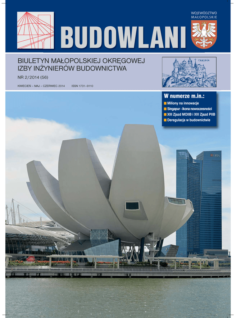 BUDOWLANI BIULETYN MAŁOPOLSKIEJ OKRĘGOWEJ IZBY INŻYNIERÓW BUDOWNICTWA NR 2/2014 (56) KWIECIEŃ – MAJ – CZERWIEC 2014 ISSN 1731–9110 W numerze m.in.: ■ Miliony na innowacje ■ Singapur - ikona nowoczesnoÊci ■ XIII Zjazd MOIIB i XIII Zjazd PIIB ■ Deregulacja w budownictwie SIEDZIBA MAŁOPOLSKIEJ OKRĘGOWEJ IZBY INŻYNIERÓW BUDOWNICTWA PRZY UL. CZARNOWIEJSKIEJ W KRAKOWIE DY˚URY CZŁONKÓW PREZYDIUM RADY MOIIB Nazwisko Karczmarczyk Korniak-Figa Skawiƒski Strzałka Biliƒski Imi´ Stanisław Krystyna Jan Jan Wojciech Funkcja przewodniczàcy wiceprzew. wiceprzew. wiceprzew. sekretarz Dy˝ur wtorek,15 – 16 piàtek, 10-12 wtorek, 15-17 wtorek, 15-17 wtorek, 5 – 17, Êroda 9-11 MAŁOPOLSKA OKR¢GOWA IZBA IN˚YNIERÓW BUDOWNICTWA (MOIIB) w KRAKOWIE ul. CZARNOWIEJSKA 80 , 30–054 KRAKÓW tel.: (12) 630–90–60, 630–90–61, fax: (12) 632–35–59 e–mail: [email protected] www.map.piib.org.pl biuro czynne poniedziałek, Êroda, piàtek 9.00–14.00 wtorek, czwartek 12.00–18.00 Adres do korespondencji: Małopolska Okr´gowa Izba In˝ynierów Budownictwa w Krakowie ul. Czarnowiejska 80, 30–054 Kraków DY˚URY W PUNKTACH INFORMACYJNYCH MOIIB Punkt Informacyjny Małopolskiej OIIB w Tarnowie ul. Krakowska 11A (biurowiec Krakus III p.) tel. 14 626 47 18, e–mail: [email protected] wtorek, czwartek – 15.30 – 17.30 Punkt Informacyjny Małopolskiej OIIB w Nowym Sàczu ul. Dunajewskiego 1, I pi´tro tel. 18 547 10 87, e–mail: [email protected] wtorek 13.00 – 15.00 dy˝ur Małgorzata Borsukowska–Stefaniczek czwartek 17.00 – 19.00 dy˝ur członków Okr´gowej Komisji Kwalifikacyjnej I i III piàtek 16.00 – 18.00 dy˝ur Jan Skawiƒski II i IV czwartek 16.30-18.30 dy˝ur Okr´gowego Rzecznika OdpowiedzialnoÊci Zawodowej Punkt Informacyjny Małopolskiej OIIB w Zakopanem ul. Nowotarska 6 (II p.) tel. 18 201 35 74, e–mail: [email protected] Êroda 16.00 – 18.00 czwartek 13.00 – 15.00 Punkt Informacyjny Małopolskiej OIIB w OÊwi´cimiu ul. Ks. J. Skarbka 1 tel. 33 842 60 34, e–mail: [email protected] wtorek, czwartek – 15.00 – 17.00 Ubezpieczenia OC, NW, Na ˚ycie – Tel. (12) 630 90 60 lub 630 90 61 wewn. 313 DY˚URY PRZEWODNICZÑCYCH ORGANÓW MOIIB Okr´gowy Rzecznik OdpowiedzialnoÊci Zawodowej – co drugi (parzysty) czwartek miesiàca – 16.00 – 18.00 Przewodniczàcy Okr´gowego Sàdu Dyscyplinarnego – co drugi (parzysty) czwartek miesiàca – 16.00 – 18.00 Przewodniczàcy Okr´gowej Komisji Kwalifikacyjnej – w ka˝dy pierwszy czwartek miesiàca – 15.00 – 16.00 (w sprawach skarg i wniosków) Dy˝ur członka Okr´gowej Komisji Kwalifikacyjnej – w ka˝dy czwartek miesiàca – 15.00 – 18.00 (w biurze MOIIB w Krakowie) Dy˝ur radcy prawnego w zakresie uprawnieƒ budowlanych – w ka˝dy wtorek 16.00 – 18.00 (w biurze MOIIB) Dy˝ury radcy prawnego dla członków MOIIB - w ka˝dy czwartek 17.00 – 18.00 (w biurze MOIIB) Składy Orzekajàce - drugie i czwarte wtorki miesiàca (w sprawach członkowskich) Szanowne Kole˝anki, Szanowni Koledzy BUDOWLANI Przewodniczàcy Rady MOIIB Stanisław Karczmarczyk W poprzednim biuletynie - zdominowanym merytorycznie przez sprawozdania za ubiegły rok - starałem si´ zasygnalizowaç najwa˝niejsze wydarzenia, które okreÊlały stanowisko in˝ynierów budownictwa wobec ustawy deregulacyjnej, planowanych zmian w ustawie Prawo budowlane oraz zało˝eƒ do tzw. kodeksu budowlanego. Zdajàc sobie spraw´, jak wa˝ne sà zapisy ustaw i rozporzàdzeƒ dla jakoÊci usług Êwiadczonych przez in˝ynierów, władze krajowe Izby i zespoły małopolskiego okr´gu starały si´ na bie˝àco opiniowaç kolejne propozycje i pomysły, które budziły obawy, a czasami nawet oburzenie naszego samorzàdu. Opracowywane opinie i argumenty były przesyłane do resortu i do Komisji Sejmowej opracowujàcej ustaw´ deregulacyjnà, nazwanà póêniej propagandowo ustawà o ułatwianiu dost´pu do zawodu. Nawet najbardziej oczywiste i przekonujàce argumenty nie były uwzgl´dniane albo uwzgl´dniane cz´Êciowo, dlatego efektem tych procedur jest przyj´ta ustawa, której główne ustalenia zostały omówione w „In˝ynierze Budownictwa” i w bie˝àcym numerze naszego biuletynu „Budowlani”. Na obecnym etapie konsultowane sà rozporzàdzenia, które uwzgl´dniaç b´dà przepisy ustawy deregulacyjnej. W pierwszej kolejnoÊci dotyczy to rozporzàdzenia o samodzielnych funkcjach technicznych w budownictwie. Zach´camy do Êledzenia informacji na stronie internetowej PIIB i w przypadku krytycznej oceny prosimy o spontaniczne reagowanie e-mailami kierowanymi do Ministerstwa Infrastruktury i Rozwoju. Jako grupa zawodu zaufania publicznego nie mo˝emy walczyç o swoje racje agresywnymi manifestacjami. Ostatnie dwa miesiàce obfitowały w wiele emocji zwiàzanych z wyborami do władz Izby na szczeblu okr´gu i na szczeblu krajowym. Dane dotyczàce wybranego składu osobowego Rady i organów Izby prezentujemy w biuletynie. Na szczeblu krajowym naszà okr´gowà izb´ reprezentowaç b´dzie czterech członków Rady Krajowej, przewodniczàcy i członek Krajowej Komisji Kwalifikacyjnej oraz członkowie Krajowej Komisji Rewizyjnej i Krajowego Sàdu. Jest to reprezentacja adekwatna do wskaêników liczby członków Małopolskiej Izby w stosunku do ogólnej liczby członków PIIB. Zbli˝ajà si´ wakacje, wi´c ˝ycz´ wszystkim udanego urlopu oraz wielu interesujàcych wra˝eƒ. We wrzeÊniu (13 wrzeÊnia, sobota) zapraszam na obchody Êwi´ta budowlanych, które ju˝ niemal tradycyjnie sp´dzimy na spotkaniu w Operze Krakowskiej. SPIS TREÂCI: Co w Małopolskiej Izbie In˝ynierów Budownictwa? . . . . . . . . . . . . . . . . . . . . . . . . . . . . . . .4 Co w Krajowej Radzie?… . . . . . . . . . . . . . . . . . . . . . .5 MOIIB w liczbach . . . . . . . . . . . . . . . . . . . . . . . . . . . . .5 Kalendarium MOIIB . . . . . . . . . . . . . . . . . . . . . . . . .6–7 Unijne wsparcie dla innowacyjnej gospodarki . . . . . . 
