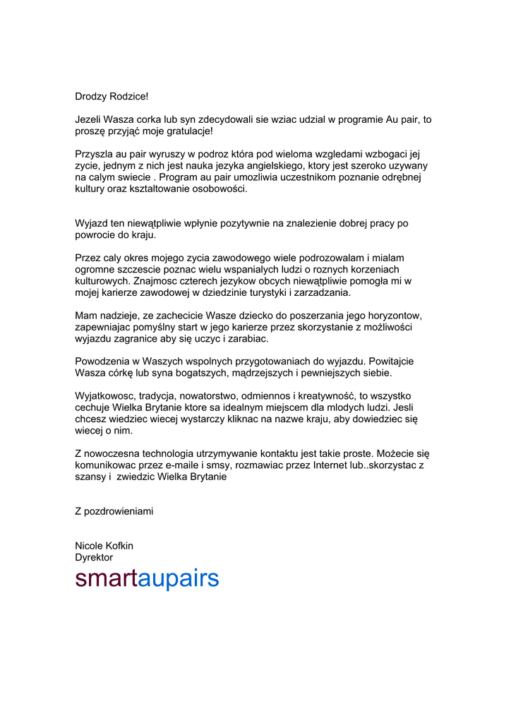 Drodzy Rodzice! Jezeli Wasza corka lub syn zdecydowali sie wziac udzial w programie Au pair, to proszę przyjąć moje gratulacje! Przyszla au pair wyruszy w podroz która pod wieloma wzgledami wzbogaci jej zycie, jednym z nich jest nauka jezyka angielskiego, ktory jest szeroko uzywany na calym swiecie . Program au pair umozliwia uczestnikom poznanie odrębnej kultury oraz ksztaltowanie osobowości. Wyjazd ten niewątpliwie wpłynie pozytywnie na znalezienie dobrej pracy po powrocie do kraju. Przez caly okres mojego zycia zawodowego wiele podrozowalam i mialam ogromne szczescie poznac wielu wspanialych ludzi o roznych korzeniach kulturowych. Znajmosc czterech jezykow obcych niewątpliwie pomogła mi w mojej karierze zawodowej w dziedzinie turystyki i zarzadzania. Mam nadzieje, ze zachecicie Wasze dziecko do poszerzania jego horyzontow, zapewniajac pomyślny start w jego karierze przez skorzystanie z możliwości wyjazdu zagranice aby się uczyc i zarabiac. Powodzenia w Waszych wspolnych przygotowaniach do wyjazdu. Powitajcie Wasza córkę lub syna bogatszych, mądrzejszych i pewniejszych siebie. Wyjatkowosc, tradycja, nowatorstwo, odmiennos i kreatywność, to wszystko cechuje Wielka Brytanie ktore sa idealnym miejscem dla mlodych ludzi. Jesli chcesz wiedziec wiecej wystarczy kliknac na nazwe kraju, aby dowiedziec się wiecej o nim. Z nowoczesna technologia utrzymywanie kontaktu jest takie proste. Możecie się komunikowac przez e-maile i smsy, rozmawiac przez Internet lub..skorzystac z szansy i zwiedzic Wielka Brytanie Z pozdrowieniami Nicole Kofkin Dyrektor smartaupairs