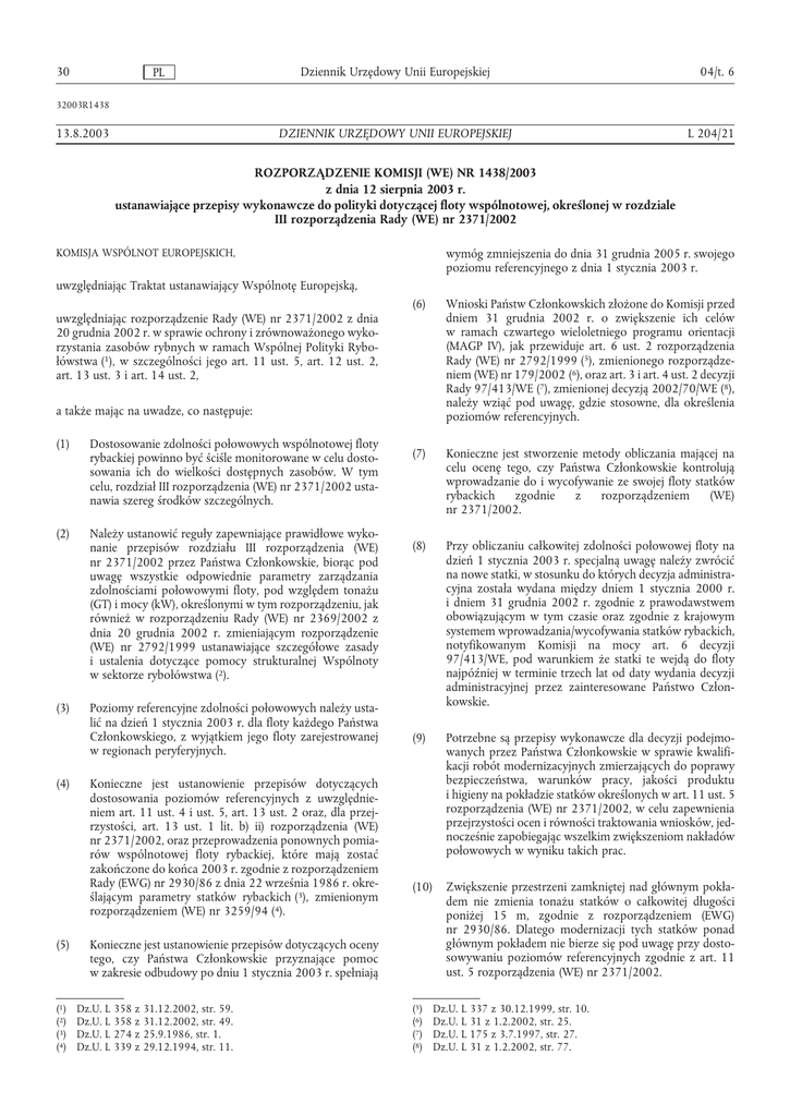 30 PL Dziennik Urzędowy Unii Europejskiej 04/t. 6 32003R1438 13.8.2003 DZIENNIK URZĘDOWY UNII EUROPEJSKIEJ L 204/21 ROZPORZĄDZENIE KOMISJI (WE) NR 1438/2003 z dnia 12 sierpnia 2003 r. ustanawiające przepisy wykonawcze do polityki dotyczącej floty wspólnotowej, określonej w rozdziale III rozporządzenia Rady (WE) nr 2371/2002 wymóg zmniejszenia do dnia 31 grudnia 2005 r. swojego poziomu referencyjnego z dnia 1 stycznia 2003 r. KOMISJA WSPÓLNOT EUROPEJSKICH, uwzględniając Traktat ustanawiający Wspólnotę Europejską, (6) Wnioski Państw Członkowskich złożone do Komisji przed dniem 31 grudnia 2002 r. o zwiększenie ich celów w ramach czwartego wieloletniego programu orientacji (MAGP IV), jak przewiduje art. 6 ust. 2 rozporządzenia Rady (WE) nr 2792/1999 (5), zmienionego rozporządzeniem (WE) nr 179/2002 (6), oraz art. 3 i art. 4 ust. 2 decyzji Rady 97/413/WE (7), zmienionej decyzją 2002/70/WE (8), należy wziąć pod uwagę, gdzie stosowne, dla określenia poziomów referencyjnych. (7) Konieczne jest stworzenie metody obliczania mającej na celu ocenę tego, czy Państwa Członkowskie kontrolują wprowadzanie do i wycofywanie ze swojej floty statków rybackich zgodnie z rozporządzeniem (WE) nr 2371/2002. (8) Przy obliczaniu całkowitej zdolności połowowej floty na dzień 1 stycznia 2003 r. specjalną uwagę należy zwrócić na nowe statki, w stosunku do których decyzja administracyjna została wydana między dniem 1 stycznia 2000 r. i dniem 31 grudnia 2002 r. zgodnie z prawodawstwem obowiązującym w tym czasie oraz zgodnie z krajowym systemem wprowadzania/wycofywania statków rybackich, notyfikowanym Komisji na mocy art. 6 decyzji 97/413/WE, pod warunkiem że statki te wejdą do floty najpóźniej w terminie trzech lat od daty wydania decyzji administracyjnej przez zainteresowane Państwo Członkowskie. (9) Potrzebne są przepisy wykonawcze dla decyzji podejmowanych przez Państwa Członkowskie w sprawie kwalifikacji robót modernizacyjnych zmierzających do poprawy bezpieczeństwa, warunków pracy, jakości produktu i higieny na pokładzie statków określonych w art. 11 ust. 5 rozporządzenia (WE) nr 2371/2002, w celu zapewnienia przejrzystości ocen i równości traktowania wniosków, jednocześnie zapobiegając wszelkim zwiększeniom nakładów połowowych w wyniku takich prac. (10) Zwiększenie przestrzeni zamkniętej nad głównym pokładem nie zmienia tonażu statków o całkowitej długości poniżej 15 m, zgodnie z rozporządzeniem (EWG) nr 2930/86. Dlatego modernizacji tych statków ponad głównym pokładem nie bierze się pod uwagę przy dostosowywaniu poziomów referencyjnych zgodnie z art. 11 ust. 5 rozporządzenia (WE) nr 2371/2002. uwzględniając rozporządzenie Rady (WE) nr 2371/2002 z dnia 20 grudnia 2002 r. w sprawie ochrony i zrównoważonego wykorzystania zasobów rybnych w ramach Wspólnej Polityki Rybołówstwa (1), w szczególności jego art. 11 ust. 5, art. 12 ust. 2, art. 13 ust. 3 i art. 14 ust. 2, a także mając na uwadze, co następuje: (1) Dostosowanie zdolności połowowych wspólnotowej floty rybackiej powinno być ściśle monitorowane w celu dostosowania ich do wielkości dostępnych zasobów. W tym celu, rozdział III rozporządzenia (WE) nr 2371/2002 ustanawia szereg środków szczególnych. (2) Należy ustanowić reguły zapewniające prawidłowe wykonanie przepisów rozdziału III rozporządzenia (WE) nr 2371/2002 przez Państwa Członkowskie, biorąc pod uwagę wszystkie odpowiednie parametry zarządzania zdolnościami połowowymi floty, pod względem tonażu (GT) i mocy (kW), określonymi w tym rozporządzeniu, jak również w rozporządzeniu Rady (WE) nr 2369/2002 z dnia 20 grudnia 2002 r. zmieniającym rozporządzenie (WE) nr 2792/1999 ustanawiające szczegółowe zasady i ustalenia dotyczące pomocy strukturalnej Wspólnoty w sektorze rybołówstwa (2). (3) Poziomy referencyjne zdolności połowowych należy ustalić na dzień 1 stycznia 2003 r. dla floty każdego Państwa Członkowskiego, z wyjątkiem jego floty zarejestrowanej w regionach peryferyjnych. (4) (5) (1) (2) (3) (4) Konieczne jest ustanowienie przepisów dotyczących dostosowania poziomów referencyjnych z uwzględnieniem art. 11 ust. 4 i ust. 5, art. 13 ust. 2 oraz, dla przejrzystości, art. 13 ust. 1 lit. b) ii) rozporządzenia (WE) nr 2371/2002, oraz przeprowadzenia ponownych pomiarów wspólnotowej floty rybackiej, które mają zostać zakończone do końca 2003 r. zgodnie z rozporządzeniem Rady (EWG) nr 2930/86 z dnia 22 września 1986 r. określającym parametry statków rybackich (3), zmienionym rozporządzeniem (WE) nr 3259/94 (4). Konieczne jest ustanowienie przepisów dotyczących oceny tego, czy Państwa Członkowskie przyznające pomoc w zakresie odbudowy po dniu 1 stycznia 2003 r. spełniają Dz.U. L 358 z 31.12.2002, str. 59. Dz.U. L 358 z 31.12.2002, str. 49. Dz.U. L 274 z 25.9.1986, str. 1. Dz.U. L 339 z 29.12.1994, str. 11. (5) (6) (7) (8) Dz.U. L 337 z 30.12.1999, str. 10. Dz.U. L 31 z 1.2.2002, str. 25. Dz.U. L 175 z 3.7.1997, str. 27. Dz.U. L 31 z 1.2.2002, str. 77. 04/t. 6 Dziennik Urzędowy Unii Europejskiej PL (11) Konieczne jest ustanowienie przepisów wykonawczych zapewniające, że Państwa Członkowskie będą przekazywać dane do rejestru wspólnotowej floty rybackiej według jasnych zasad i procedur, oraz potrzebne są nowe zasady weryfikacji gwarantujące jakość i wiarygodność tych danych. (12) Coroczne sprawozdania i ich podsumowanie dokonywane przez Komisję zgodnie z art. 14 rozporządzenia Rady (WE) nr 2371/2002 powinny dawać jasny obraz równowagi między zdolnościami połowowymi floty a wielkościami dopuszczalnymi połowów. (13) Komitet Zarządzający ds. Rybołówstwa i Akwakultury nie wydał opinii na temat środków przewidzianych w niniejszym rozporządzeniu w terminie ustanowionym przez jego przewodniczącego, 3. „ΔR (GT-GRT)” lub „dostosowanie ostatecznych, globalnych celów MAGP”: oznacza dostosowan