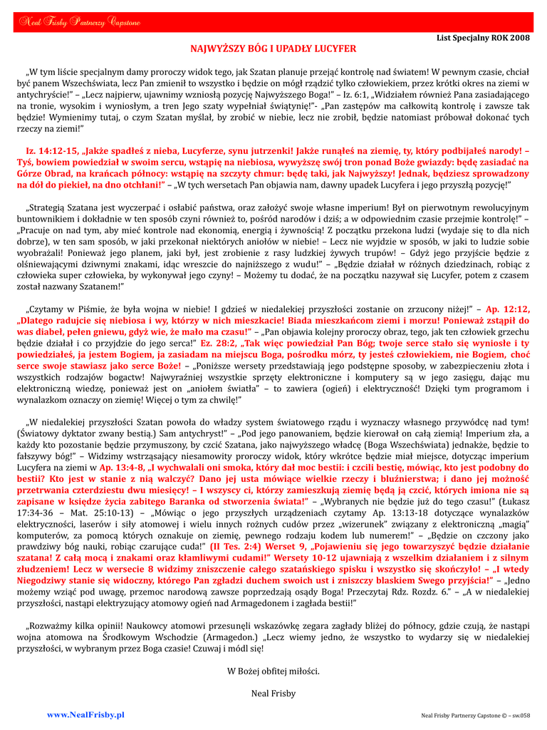 1. Neal Frisby Partnerzy Capstone NAJWYŻSZY BÓG I UPADŁY LUCYFER List Specjalny ROK 2008 „W tym liście specjalnym damy proroczy widok tego, jak Szatan planuje przejąć kontrolę nad światem! W pewnym czasie, chciał być panem Wszechświata, lecz Pan zmienił to wszystko i będzie on mógł rządzić tylko człowiekiem, przez krótki okres na ziemi w antychryście!” – „Lecz najpierw, ujawnimy wzniosłą pozycję Najwyższego Boga!” – Iz. 6:1, „Widziałem również Pana zasiadającego na tronie, wysokim i wyniosłym, a tren Jego szaty wypełniał świątynię!”- „Pan zastępów ma całkowitą kontrolę i zawsze tak będzie! Wymienimy tutaj, o czym Szatan myślał, by zrobić w niebie, lecz nie zrobił, będzie natomiast próbował dokonać tych rzeczy na ziemi!” Iz. 14:12-15, „Jakże spadłeś z nieba, Lucyferze, synu jutrzenki! Jakże runąłeś na ziemię, ty, który podbijałeś narody! – Tyś, bowiem powiedział w swoim sercu, wstąpię na niebiosa, wywyższę swój tron ponad Boże gwiazdy: będę zasiadać na Górze Obrad, na krańcach północy: wstąpię na szczyty chmur: będę taki, jak Najwyższy! Jednak, będziesz sprowadzony na dół do piekieł, na dno otchłani!” – „W tych wersetach Pan objawia nam, dawny upadek Lucyfera i jego przyszłą pozycję!” „Strategią Szatana jest wyczerpać i osłabić państwa, oraz założyć swoje własne imperium! Był on pierwotnym rewolucyjnym buntownikiem i dokładnie w ten sposób czyni również to, pośród narodów i dziś; a w odpowiednim czasie przejmie kontrolę!” – „Pracuje on nad tym, aby mieć kontrole nad ekonomią, energią i żywnością! Z początku przekona ludzi (wydaje się to dla nich dobrze), w ten sam sposób, w jaki przekonał niektórych aniołów w niebie! – Lecz nie wyjdzie w sposób, w jaki to ludzie sobie wyobrażali! Ponieważ jego planem, jaki był, jest zrobienie z rasy ludzkiej żywych trupów! – Gdyż jego przyjście będzie z olśniewającymi dziwnymi znakami, idąc wreszcie do najniższego z wudu!” – „Będzie działał w różnych dziedzinach, robiąc z człowieka super człowieka, by wykonywał jego czyny! – Możemy tu dodać, że na początku nazywał się Lucyfer, potem z czasem został nazwany Szatanem!” „Czytamy w Piśmie, że była wojna w niebie! I gdzieś w niedalekiej przyszłości zostanie on zrzucony niżej!” – Ap. 12:12, „Dlatego radujcie się niebiosa i wy, którzy w nich mieszkacie! Biada mieszkańcom ziemi i morzu! Ponieważ zstąpił do was diabeł, pełen gniewu, gdyż wie, że mało ma czasu!” – „Pan objawia kolejny proroczy obraz, tego, jak ten człowiek grzechu będzie działał i co przyjdzie do jego serca!” Ez. 28:2, „Tak więc powiedział Pan Bóg; twoje serce stało się wyniosłe i ty powiedziałeś, ja jestem Bogiem, ja zasiadam na miejscu Boga, pośrodku mórz, ty jesteś człowiekiem, nie Bogiem, choć serce swoje stawiasz jako serce Boże! – „Poniższe wersety przedstawiają jego podstępne sposoby, w zabezpieczeniu złota i wszystkich rodzajów bogactw! Najwyraźniej wszystkie sprzęty elektroniczne i komputery są w jego zasięgu, dając mu elektroniczną wiedzę, ponieważ jest on „aniołem światła” – to zawiera (ogień) i elektryczność! Dzięki tym programom i wynalazkom oznaczy on ziemię! Więcej o tym za chwilę!” „W niedalekiej przyszłości Szatan powoła do władzy system światowego rządu i wyznaczy własnego przywódcę nad tym! (Światowy dyktator zwany bestią.) Sam antychryst!” – „Pod jego panowaniem, będzie kierował on całą ziemią! Imperium zła, a każdy kto pozostanie będzie przymuszony, by czcić Szatana, jako najwyższego władcę (Boga Wszechświata) jednakże, będzie to fałszywy bóg!” – Widzimy wstrząsający niesamowity proroczy widok, który wkrótce będzie miał miejsce, dotycząc imperium Lucyfera na ziemi w Ap. 13:4-8, „I wychwalali oni smoka, który dał moc bestii: i czcili bestię, mówiąc, kto jest podobny do bestii? Kto jest w stanie z nią walczyć? Dano jej usta mówiące wielkie rzeczy i bluźnierstwa; i dano jej możność przetrwania czterdziestu dwu miesięcy! – I wszyscy ci, którzy zamieszkują ziemię będą ją czcić, których imiona nie są zapisane w księdze życia zabitego Baranka od stworzenia świata!” – „Wybranych nie będzie już do tego czasu!” (Łukasz 17:34-36 – Mat. 25:10-13) – „Mówiąc o jego przyszłych urządzeniach czytamy Ap. 13:13-18 dotyczące wynalazków elektryczności, laserów i siły atomowej i wielu innych rożnych cudów przez „wizerunek” związany z elektroniczną „magią” komputerów, za pomocą których oznakuje on ziemię, pewnego rodzaju kodem lub numerem!” – „Będzie on czczony jako prawdziwy bóg nauki, robiąc czarujące cuda!” (II Tes. 2:4) Werset 9, „Pojawieniu się jego towarzyszyć będzie działanie szatana! Z całą mocą i znakami oraz kłamliwymi cudami!” Wersety 10-12 ujawniają z wszelkim działaniem i z silnym złudzeniem! Lecz w wersecie 8 widzimy zniszczenie całego szatańskiego spisku i wszystko się skończyło! – „I wtedy Niegodziwy stanie się widoczny, którego Pan zgładzi duchem swoich ust i zniszczy blaskiem Swego przyjścia!” – „Jedno możemy wziąć pod uwagę, przemoc narodową zawsze poprzedzają osądy Boga! Przeczytaj Rdz. Rozdz. 6.” – „A w niedalekiej przyszłości, nastąpi elektryzujący atomowy ogień nad Armagedonem i zagłada bestii!” „Rozważmy kilka opinii! Naukowcy atomowi przesunęli wskazówkę zegara zagłady bliżej do północy, gdzie czują, że nastąpi wojna atomowa na Środkowym Wschodzie (Armagedon.) „Lecz wiemy jedno, że wszystko to wydarzy się w niedalekiej przyszłości, w wybranym przez Boga czasie! Czuwaj i módl się! W Bożej obfitej miłości. Neal Frisby www.NealFrisby.pl Neal Frisby Partnerzy Capstone © – sw.058