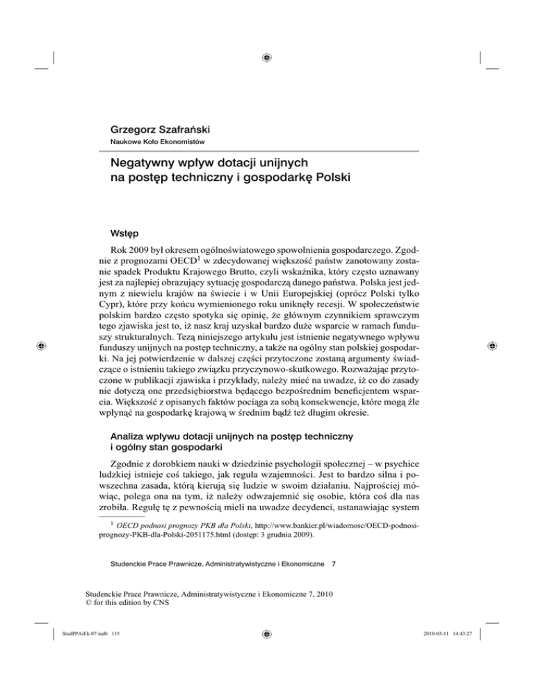 Grzegorz Szafrañski Naukowe Ko³o Ekonomistów Negatywny wp³yw dotacji unijnych na postêp techniczny i gospodarkê Polski Wstêp Rok 2009 był okresem ogólnoświatowego spowolnienia gospodarczego. Zgodnie z prognozami OECD1 w zdecydowanej większość państw zanotowany zostanie spadek Produktu Krajowego Brutto, czyli wskaźnika, który często uznawany jest za najlepiej obrazujący sytuację gospodarczą danego państwa. Polska jest jednym z niewielu krajów na świecie i w Unii Europejskiej (oprócz Polski tylko Cypr), które przy końcu wymienionego roku uniknęły recesji. W społeczeństwie polskim bardzo często spotyka się opinię, że głównym czynnikiem sprawczym tego zjawiska jest to, iż nasz kraj uzyskał bardzo duże wsparcie w ramach funduszy strukturalnych. Tezą niniejszego artykułu jest istnienie negatywnego wpływu funduszy unijnych na postęp techniczny, a także na ogólny stan polskiej gospodarki. Na jej potwierdzenie w dalszej części przytoczone zostaną argumenty świadczące o istnieniu takiego związku przyczynowo-skutkowego. Rozważając przytoczone w publikacji zjawiska i przykłady, należy mieć na uwadze, iż co do zasady nie dotyczą one przedsiębiorstwa będącego bezpośrednim beneficjentem wsparcia. Większość z opisanych faktów pociąga za sobą konsekwencje, które mogą źle wpłynąć na gospodarkę krajową w średnim bądź też długim okresie. Analiza wp³ywu dotacji unijnych na postêp techniczny i ogólny stan gospodarki Zgodnie z dorobkiem nauki w dziedzinie psychologii społecznej – w psychice ludzkiej istnieje coś takiego, jak reguła wzajemności. Jest to bardzo silna i powszechna zasada, którą kierują się ludzie w swoim działaniu. Najprościej mówiąc, polega ona na tym, iż należy odwzajemnić się osobie, która coś dla nas zrobiła. Regułę tę z pewnością mieli na uwadze decydenci, ustanawiając system 1 OECD podnosi prognozy PKB dla Polski, http://www.bankier.pl/wiadomosc/OECD-podnosiprognozy-PKB-dla-Polski-2051175.html (dostęp: 3 grudnia 2009). Studenckie Prace Prawnicze, Administratywistyczne i Ekonomiczne 7 Studenckie Prace Prawnicze, Administratywistyczne i Ekonomiczne 7, 2010 © for this edition by CNS StudPPAiEk-07.indb 115 2010-03-11 14:43:27 116 | GRZEGORZ SZAFRAŃSKI redystrybucji pieniędzy na dotacje. Biznesmen ma być z definicji osobą wolną, dumną i niezależną. Jeśli jego biznes polega na wystawaniu w urzędach i dopasowywaniu swojego modelu gospodarczego do wymagań formalnych oraz regulacji przydzielającego dotację, to przestaje on być biznesmenem, a zaczyna być petentem – klientem urzędu. Jest to smutne, bo przedsiębiorca już u zarania swojej działalności zaczyna od analizowania, co opłaci mu się najbardziej z punktu widzenia dotacji2. Ze względu na to, że w Polsce przyznawane są dotacje dla przedsiębiorstw, zakłócone zostają naturalne procesy rynkowe, dzięki którym na rynku przewagę zyskują najbardziej efektywne podmioty. Wynika to z tego, że przedsiębiorstwa, którym uda się otrzymać dotacje, stanowią nieuczciwą konkurencję wobec innych podmiotów, którym to się nie udało. Skutkuje to pogorszeniem się wyników tych drugich, a może nawet spowodować wiele bankructw. Dzieje się tak, ponieważ przedsiębiorstwa dotowane są w stanie zaoferować swoje produkty bądź też usługi po niższych cenach. Mechanizm ten działa podobnie jak w specjalnych strefach ekonomicznych, gdzie firmy są zwalniane z podatków dochodowych czy od nieruchomości. Niestety specjalne strefy ekonomiczne rozwijają się kosztem reszty kraju. Przedsiębiorcy przenoszą swoją działalność z innych rejonów do strefy, gdzie tworzą nowe miejsca pracy, równocześnie likwidując je gdzie indziej. „Transfer publicznych pieniędzy do przedsiębiorstw, zarówno publicznych, jak i prywatnych, narusza fundamentalną zasadę równej konkurencji i w efekcie obniża efektywność alokacji kapitału” – napisano w Czarnej liście barier dla przedsiębiorczości 2003 przygotowanej przez Polską Konfederację Pracodawców Prywatnych. Należy zaznaczyć, że jakiekolwiek dotacje nie mają nic wspólnego z wolnym rynkiem. Subsydia utrudniają rozwój wolnej konkurencji, ponieważ przedsiębiorstwa wolą walczyć o państwowe dofinansowanie niż z konkurentami na wolnym rynku, co pogarsza jakość ich usług i wyrobów oraz zwiększa cenę. Istotne jest także to, że środki, z których wypłacane są dotacje, to pieniądze odebrane komuś innemu. Ze względu na istotność podatku dochodowego czy też podatków pośrednich dla dochodów państw (ponad 80% dochodów) oraz, co za tym idzie, na przykład Unii Europejskiej (organizacja ponadpaństwowa) można przyjmować, że pieniądz na dotację dla „potrzebujących wsparcia osób i firm” pochodzi bezpośrednio od osób i firm potrafiących tworzyć dochód. Z tego względu taki mechanizm redystrybucyjny pełni funkcję demotywującą do efektywnego działania i efektywnej alokacji czynników produkcji. Przedsiębiorstwo nie musi zmagać się z trudnym otoczeniem gospodarczym, skoro może skupić się na lobbowaniu polityków i urzędników w celu otrzymania specjalnego 2 K. Szczepański, Ciemna strona dotacji – o dotacjach bardzo krytycznie, http://www.biznesplany.biz/2009/10/ciemna-strona-dotacji-o-dotacjach-bardzo-krytycznie (dostęp: 2 grudnia 2009). Studenckie Prace Prawnicze, Administratywistyczne i Ekonomiczne 7, 2010 © for this edition by CNS StudPPAiEk-07.indb 116 2010-03-11 14:43:27 NEGATYWNY WPŁYW DOTACJI UNIJNYCH NA POSTĘP TECHNICZNY I GOSPODARKĘ POLSKI | 117 wsparcia finansowego, szczególnie gdy podmiot jest „zbyt duży by upaść” – too big to fail3. Kolejnym aspektem świadczącym o negatywnym wpływie dotacji unijnych na postęp techniczny i stan gospodarki jest to, iż decydując się na podjęcie starań o wsparcie, przedsiębiorstwo musi brać pod uwagę opóźnienie procesu inwestycyjnego, a także