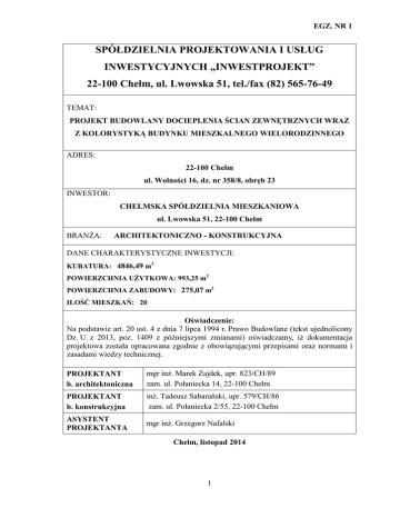 EGZ. NR 1 SPÓŁDZIELNIA PROJEKTOWANIA I USŁUG INWESTYCYJNYCH „INWESTPROJEKT” 22-100 Chełm, ul. Lwowska 51, tel./fax (82) 565-76-49 TEMAT: PROJEKT BUDOWLANY DOCIEPLENIA ŚCIAN ZEWNĘTRZNYCH WRAZ Z KOLORYSTYKĄ BUDYNKU MIESZKALNEGO WIELORODZINNEGO ADRES: 22-100 Chełm ul. Wolności 16, dz. nr 358/8, obręb 23 INWESTOR: CHEŁMSKA SPÓŁDZIELNIA MIESZKANIOWA ul. Lwowska 51, 22-100 Chełm BRANŻA: ARCHITEKTONICZNO - KONSTRUKCYJNA DANE CHARAKTERYSTYCZNE INWESTYCJI: KUBATURA: 4846,49 m3 POWIERZCHNIA UŻYTKOWA: 993,25 m2 POWIERZCHNIA ZABUDOWY: 275,07 m2 ILOŚĆ MIESZKAŃ: 20 Oświadczenie: Na podstawie art. 20 ust. 4 z dnia 7 lipca 1994 r. Prawo Budowlane (tekst ujednolicony Dz. U. z 2013, poz. 1409 z późniejszymi zmianami) oświadczamy, iż dokumentacja projektowa została opracowana zgodnie z obowiązującymi przepisami oraz normami i zasadami wiedzy technicznej. PROJEKTANT b. architektoniczna mgr inż. Marek Zajdek, upr. 823/CH/89 zam. ul. Połaniecka 14, 22-100 Chełm PROJEKTANT b. konstrukcyjna inż. Tadeusz Sabarański, upr. 579/CH/86 zam. ul. Połaniecka 2/55, 22-100 Chełm ASYSTENT PROJEKTANTA mgr inż. Grzegorz Nafalski Chełm, listopad 2014 1 SPIS ZAWARTOŚCI I. DOKUMENTACJA FORMALNO - PRAWNA .................................. 3 Uprawnienia budowlane projektanta branży architektonicznej – mgr inż. Marek Zajdek, upr. 823/CH/89 ........................................................................................................................4 Przynależność do Lubelskiej Okręgowej Rady Izby Architektów RP projektanta branży architektonicznej ......................................................................................................................5 Uprawnienia budowlane projektanta branży konstrukcyjnej – inż. Tadeusz Sabarański, upr. 579/CH/86 .........................................................................................................................6 Przynależność do Polskiej Izby Inżynierów Budownictwa projektanta branży konstrukcyjnej ...........................................................................................................................7 II. ZAGOSPODAROWANIE TERENU – część opisowa + rysunkowa ....... 8 Opis do zagospodarowania terenu ............................................................................................9 Zagospodarowanie terenu – skala 1:500 ................................................................................ 13 III. PROJEKT BUDOWLANY – część opisowa ........................................... 14 Opis techniczny do projektu budowlanego ............................................................................ 15 Usytuowani kotew w ścianach zewnętrznych ........................................................................ 29 Charakterystyka energetyczna ............................................................................................... 38 Informacja do planu bezpieczeństwa i ochrony zdrowia ....................................................... 47 IV. INWENTARYZACJA – część rysunkowa ............................................... 54 Elewacje – rys. Nr 1 ................................................................................................................. 55 V. PROJEKT BUDOWLANY – część rysunkowa ....................................... 56 Kolorystyka elewacji – rys. Nr 2 .............................................................................................. 57 VI. SZCZEGÓŁY WYKONAWCZE ............................................................ 58 Rysunki szczegółowe – rys. S1 do rys. S12 ........................................................................ 59-70 2 ZAGOSPODAROWANIE TERENU DZIAŁKI ul. Wolności 16 dz. nr ewidencyjny 358/8 obręb 23 8 ZAGOSPODAROWANIE TERENU DZIAŁKI dz. nr ewidencyjny 358/8 obręb 23 ul. Wolności 16 INWESTOR: Chełmska Spółdzielnia Mieszkaniowa ul. Lwowska 51 22-100 Chełm ADRES OBIEKTU: Budynek mieszkalny wielorodzinny ul. Wolności 16 22-100 Chełm dz. nr ewidencyjny 358/8, obręb 23 PODSTAWA OPRACOWANIA: • umowa z Inwestorem z dn. 30.07.2014 r., • mapa zasadnicza skala 1:500, • wizja i pomiary w terenie + dokumentacja zdjęciowa, • obowiązujące przepisy i Polskie Normy Budowlane. PRZEDMIOT OPRACOWANIA: Przedmiotem opracowania jest projekt budowlany docieplenia ścian i cokołów wraz z kolorystyką budynku mieszkalnego wielorodzinnego w Chełmie przy ul. Wolności 16. ISTNIEJĄCY STAN ZAGOSPODAROWANIA TERENU: Opracowaniem objęto budynek mieszkalny wielorodzinny położony na działce ewidencyjnej nr 358/8 w Chełmie przy ul. Wolności 16. Jest to budynek 5 kondygnacyjny, całkowicie podpiwniczony. Budynek wykonano w technologii wielkiej płyty WK. OGÓLNE PARAMETRY BUDYNKU • • • • • • • • realizacja budynku długość szerokość powierzchnia zabudowy kubatura powierzchnia mieszkalna powierzchnia użytkowa ilość mieszkań - 1980 r. - 24,40 m - 11,79 m - 275,07 m2 - 4846,49 m3 - 642,55 m2 - 993,25 m2 - 20 9 • • • • • • • ilość kondygnacji -5 -2 ilość klatek schodowych podpiwniczenie - 100% wysokość budynku - ~16,33 m podział budynku na grupę wysokości średnio wysoki (SW) 12 m < h < 25 m przeznaczenie budynku - budynek mieszkalny wielorodzinny instalacje - kanalizacja sanitarna, deszczowa, sieć wodociągowa, instalacja elektryczna, gazowa, centralne ogrzewanie, instalacja telefoniczna, odgromowa. UKŁAD KOMUNIKACYJNY: Przedmiotowa działka nr ewid. 358/8 obręb 23 w Chełmie przy ul. Wolności 16 w zakresie usługi komunikacyjnej posiada dojazd i dojścia piesze o nawierzchni utwardzonej; układ komunikacyjny zapewnia prawidłowe funkcjonowanie obiektu. INFRASTRUKTURA TECHNICZNA: • • • • • • • • • kanalizacja sanitarna, kanalizacja deszczowa, sieć wodociągowa, instalacja elektryczna, instalacja gazowa, centralne ogrzewanie, instalacja telefoniczna, instalacja odgromowa, wentylacja grawitacyjn