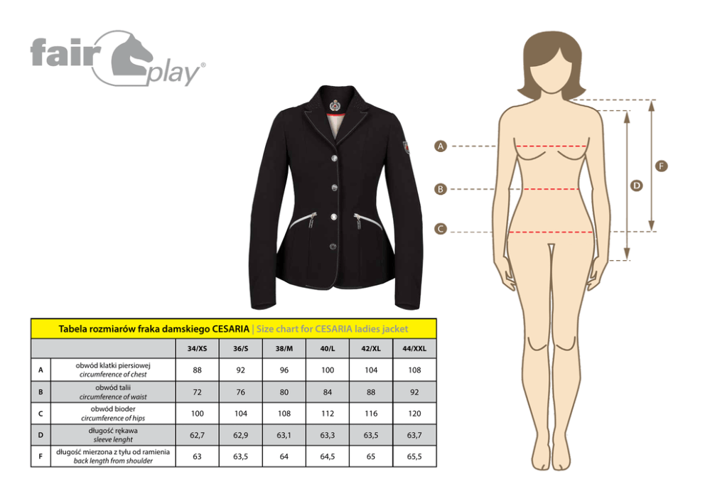 Tabela rozmiarów fraka damskiego CESARIA | Size chart for CESARIA ladies jacket 34/XS 36/S 38/M 40/L 42/XL 44/XXL A obwód klatki piersiowej circumference of chest 88 92 96 100 104 108 B obwód talii circumference of waist 72 76 80 84 88 92 C obwód bioder circumference of hips 100 104 108 112 116 120 D długość rękawa sleeve lenght 62,7 62,9 63,1 63,3 63,5 63,7 F długość mierzona z tyłu od ramienia back length from shoulder 63 63,5 64 64,5 65 65,5