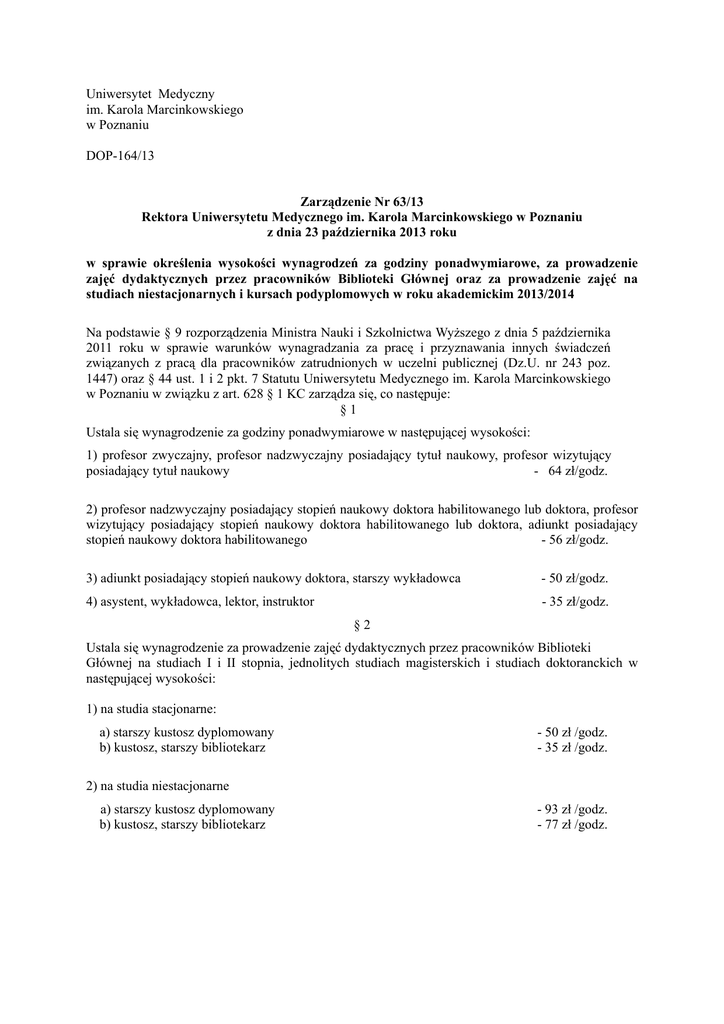 Uniwersytet Medyczny im. Karola Marcinkowskiego w Poznaniu DOP-164/13 Zarządzenie Nr 63/13 Rektora Uniwersytetu Medycznego im. Karola Marcinkowskiego w Poznaniu z dnia 23 października 2013 roku w sprawie określenia wysokości wynagrodzeń za godziny ponadwymiarowe, za prowadzenie zajęć dydaktycznych przez pracowników Biblioteki Głównej oraz za prowadzenie zajęć na studiach niestacjonarnych i kursach podyplomowych w roku akademickim 2013/2014 Na podstawie § 9 rozporządzenia Ministra Nauki i Szkolnictwa Wyższego z dnia 5 października 2011 roku w sprawie warunków wynagradzania za pracę i przyznawania innych świadczeń związanych z pracą dla pracowników zatrudnionych w uczelni publicznej (Dz.U. nr 243 poz. 1447) oraz § 44 ust. 1 i 2 pkt. 7 Statutu Uniwersytetu Medycznego im. Karola Marcinkowskiego w Poznaniu w związku z art. 628 § 1 KC zarządza się, co następuje: §1 Ustala się wynagrodzenie za godziny ponadwymiarowe w następującej wysokości: 1) profesor zwyczajny, profesor nadzwyczajny posiadający tytuł naukowy, profesor wizytujący posiadający tytuł naukowy - 64 zł/godz. 2) profesor nadzwyczajny posiadający stopień naukowy doktora habilitowanego lub doktora, profesor wizytujący posiadający stopień naukowy doktora habilitowanego lub doktora, adiunkt posiadający stopień naukowy doktora habilitowanego - 56 zł/godz. 3) adiunkt posiadający stopień naukowy doktora, starszy wykładowca - 50 zł/godz. 4) asystent, wykładowca, lektor, instruktor - 35 zł/godz. §2 Ustala się wynagrodzenie za prowadzenie zajęć dydaktycznych przez pracowników Biblioteki Głównej na studiach I i II stopnia, jednolitych studiach magisterskich i studiach doktoranckich w następującej wysokości: 1) na studia stacjonarne: a) starszy kustosz dyplomowany b) kustosz, starszy bibliotekarz - 50 zł /godz. - 35 zł /godz. 2) na studia niestacjonarne a) starszy kustosz dyplomowany b) kustosz, starszy bibliotekarz - 93 zł /godz. - 77 zł /godz. §3 Ustala się stawki wynagrodzenia za prowadzenie zajęć na studiach niestacjonarnych, na kursach podyplomowych finansowanych z budżetu państwa, w następującej wysokości: 1) za prowadzenie zajęć dydaktycznych: a) profesor zwyczajny, profesor nadzwyczajny posiadający tytuł naukowy, profesor wizytujący posiadający tytuł naukowy - 125 zł/godz. b) profesor nadzwyczajny posiadający stopień naukowy doktora habilitowanego lub doktora, profesor wizytujący posiadający stopień naukowy doktora habilitowanego lub doktora, adiunkt posiadający stopień naukowy doktora habilitowanego - 100 zł/godz. c) adiunkt posiadający stopień naukowy doktora, starszy wykładowca - 90 zł/godz. d) asystent, wykładowca, lektor, instruktor - 75 zł/godz. 2) za kierowanie pracą magisterską - 1100 zł 3) za kierowanie pracą licencjacką - 400 zł §4 1. Ustala się stawki wynagrodzenia za prowadzenie zajęć na kursach, specjalizacjach, studiach podyplomowych finansowanych w całości przez uczestników, w następującej wysokości: 1) profesor zwyczajny, profesor nadzwyczajny posiadający tytuł naukowy, profesor wizytujący posiadający tytuł naukowy -100-200 zł/godz. 2) profesor nadzwyczajny posiadający stopień naukowy doktora habilitowanego lub doktora, profesor wizytujący posiadający stopień naukowy doktora habilitowanego lub doktora, adiunkt posiadający stopień naukowy doktora habilitowanego - 85-150 zł/godz. 3) adiunkt posiadający stopień naukowy doktora, starszy wykładowca - 75-130zł/godz. 4) asystent, wykładowca, lektor, instruktor - 60-90 zł/godz. 2.Stawki, o których mowa w ust. 1 uzależnione są od możliwości finansowych kursu i nie mogą się wiązać z obniżeniem kosztów pośrednich kursu. §5 Wykonanie zarządzenia powierza się Kierownikom Dziekanatów, Kierownikowi Działu Spraw Studenckich, Kierownikowi Działu Badań Naukowych i Kwestorowi. §6 Zarządzenie wchodzi w życie z dniem podpisania, z mocą obowiązującą od 28 września 2013 roku. REKTOR prof. dr hab. Jacek Wysocki