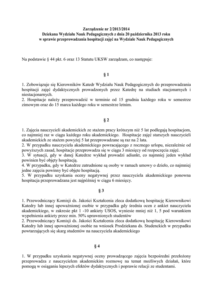 Zarządzenie nr 2/2013/2014 Dziekana Wydziału Nauk Pedagogicznych z dnia 20 października 2013 roku w sprawie przeprowadzania hospitacji zajęć na Wydziale Nauk Pedagogicznych Na podstawie § 44 pkt. 6 oraz 13 Statutu UKSW zarządzam, co następuje: §1 1. Zobowiązuje się Kierowników Katedr Wydziału Nauk Pedagogicznych do przeprowadzania hospitacji zajęć dydaktycznych prowadzonych przez Katedrę na studiach stacjonarnych i niestacjonarnych. 2. Hospitacje należy przeprowadzić w terminie od 15 grudnia każdego roku w semestrze zimowym oraz do 15 marca każdego roku w semestrze letnim. §2 1. Zajęcia nauczycieli akademickich ze stażem pracy krótszym niż 5 lat podlegają hospitacjom, co najmniej raz w ciągu każdego roku akademickiego. Hospitacje zajęć starszych nauczycieli akademickich ze stażem powyżej 5 lat przeprowadzane są raz na 2 lata. 2. W przypadku nauczyciela akademickiego powracającego z rocznego urlopu, niezależnie od powyższych zasad, hospitacje przeprowadza się w ciągu 3 miesięcy od rozpoczęcia zajęć. 3. W sytuacji, gdy w danej Katedrze wykład prowadzi adiunkt, co najmniej jeden wykład powinien być objęty hospitacją. 4. W przypadku, gdy w Katedrze zatrudnione są osoby w ramach umowy o dzieło, co najmniej jedne zajęcia powinny być objęte hospitacją. 5. W przypadku uzyskania oceny negatywnej przez nauczyciela akademickiego ponowna hospitacja przeprowadzana jest najpóźniej w ciągu 6 miesięcy. §3 1. Przewodniczący Komisji ds. Jakości Kształcenia zleca dodatkową hospitację Kierownikowi Katedry lub innej upoważnionej osobie w przypadku gdy średnia ocen z ankiet nauczyciela akademickiego, w zakresie pkt 1 -10 ankiety USOS, wyniesie mniej niż 1, 5 pod warunkiem wypełnienia ankiety przez min. 50% uprawnionych studentów 2. Przewodniczący Komisji ds. Jakości Kształcenia zleca dodatkową hospitację Kierownikowi Katedry lub innej upoważnionej osobie na wniosek Prodziekana ds. Studenckich w przypadku powtarzających się skarg studentów na nauczyciela akademickiego §4 1. W przypadku uzyskania negatywnej oceny prowadzącego zajęcia bezpośredni przełożony przeprowadza z nauczycielem akademickim rozmowę na temat możliwych działań, które pomogą w osiąganiu lepszych efektów dydaktycznych i poprawie relacji ze studentami. 2. W przypadku uzyskania ponownej niskiej oceny Dziekan przeprowadza rozmowę na temat możliwych działań, które pomogą w osiąganiu lepszych efektów dydaktycznych i poprawie relacji ze studentami. 3. Prowadzący zajęcia przygotowuje na rozmowę z Dziekanem pisemny plan działań oraz harmonogram, mających pomóc mu w osiąganiu lepszych efektów dydaktycznych i poprawie relacji ze studentami, konsultuje jego treść z bezpośrednim przełożonym. Kopię planu przekazuje się po zatwierdzeniu przez Dziekana do Wydziałowej Komisji ds. Jakości Kształcenia oraz Kierownikowi Dziekanatu. §5 1. Hospitacje powinny być zapowiedziane a po ich przeprowadzeniu należy sporządzić protokół (opinię) obejmujący ocenę zajęć wg wzoru załącznik nr 1. Hospitujący przedstawia protokół hospitowanemu. 2. Podpisane protokoły powinny być złożone w Sekretariacie Dziekana (pod rygorem wstrzymania dodatków) w nieprzekraczalnym terminie do 15 stycznia każdego roku - za semestr zimowy i do 30 marca każdego roku - za semestr letni. §6 Zarządzenie wchodzi w życie z dniem podpisania. Załącznik nr 1 Zarządzenia nr Dziekana z dnia 20 października 2013 roku Wydział Nauk Pedagogicznych UKSW Protokół hospitacji zajęć dydaktycznych Przedmiot: …………………………………………………………………………………………………….. Temat zajęć: …………………………………………………………………………………………………….. Forma zajęć: …………………………………………………………………………………………………….. Miejsce: …………………………………………………………………………………………………….. Data: ……………………………………………………………………………………………………... Nauczyciel prowadzący:………………………………………………………………………………………. Osoba hospitująca: ……………………………………………………………………………………………………... I. Samoocena zajęć dydaktycznych dokonana przez nauczyciela prowadzącego: (proszę zaznaczyć punkt od 0 do 2) A. Organizacja pracy studentów podczas zajęć: 0. brak ( chaos, rozmowy itp.) 1. zadowalająca (chwilami brak organizacji) 2. wzorowa B. Kontakt interpersonalny (nauczyciela ze studentami): 0. nieprzyjazny, konfrontacyjny 1. formalny oficjalny 2. przyjazny, życzliwy C. Aktywizacja studentów do czynnego udziału w zajęciach: 0. (brak wszyscy studenci bierni) 1. niepełna (nieliczni studenci aktywni) 2. pełna ( (wszyscy studenci aktywni) D. Sposób przekazywania treści nauczania: 0. niejasny, zawiły, nieinteresujący 1. dość jasny, ale mało interesujący 2. jasny, interesujący E. Znajomość programu kształcenia i aktualność nauczanych treści: 0. brak lub treści kształcenia nieaktualne 1. niepełna, bez uzupełnień o aktualne treści 2. pełna, uzupełniona o aktualne treści F. Stosowanie właściwych metod, technik i pomocy dydaktycznych: 0. brak 1. przestarzałe, mało wartościowe 2. nowoczesne, wartościowe II. Ocena zajęć dydaktycznych dokonana przez osobę hospitującą: (proszę zaznaczyć punkt od 0 do 2) A. Organizacja pracy studentów podczas zajęć: 0. brak (chaos, rozmowy itp.) 1. zadowalająca (chwilami brak organizacji) 2. wzorowa B. Kontakt interpersonalny (nauczyciela ze studentami): 0. nieprzyjazny, konfrontacyjny 1. formalny oficjalny 2. przyjazny, życzliwy C. Aktywizacja studentów do czynnego udziału w zajęciach: 0. brak (wszyscy s