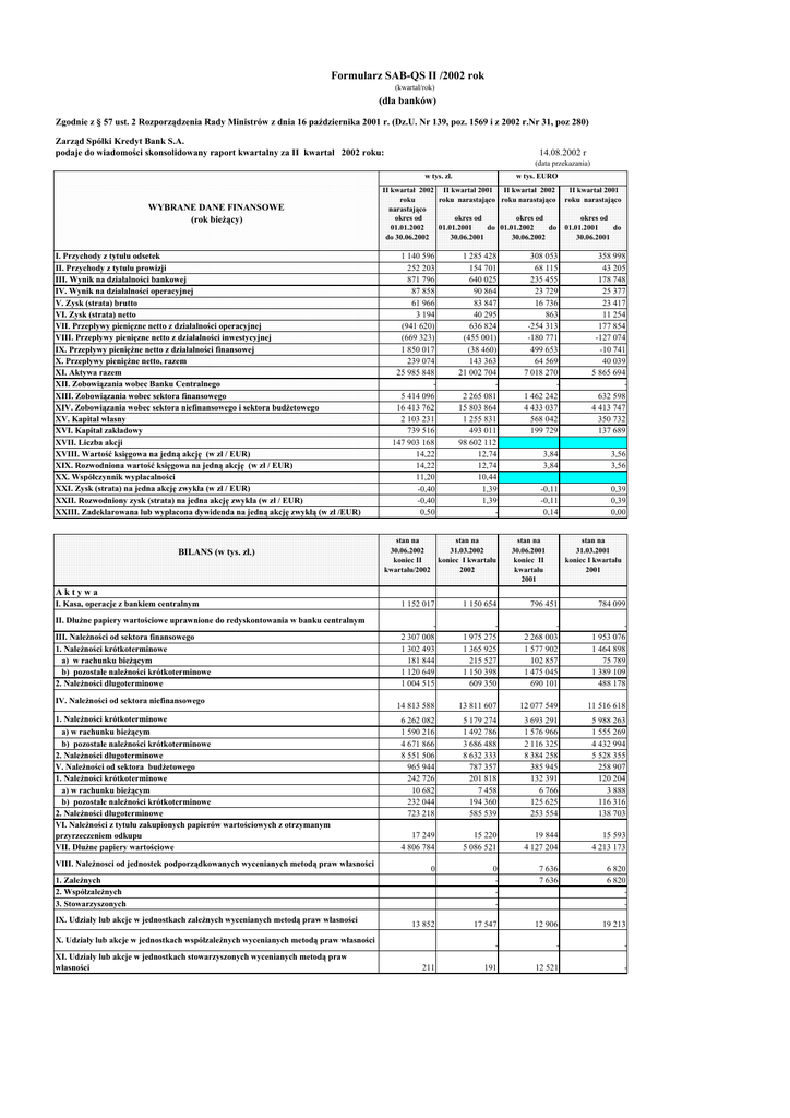 Formularz SAB-QS II /2002 rok (kwartał/rok) (dla banków) Zgodnie z § 57 ust. 2 Rozporządzenia Rady Ministrów z dnia 16 października 2001 r. (Dz.U. Nr 139, poz. 1569 i z 2002 r.Nr 31, poz 280) Zarząd Spółki Kredyt Bank S.A. podaje do wiadomości skonsolidowany raport kwartalny za II kwartał 2002 roku: 14.08.2002 r (data przekazania) w tys. zł. WYBRANE DANE FINANSOWE (rok bieżący) I. Przychody z tytułu odsetek II. Przychody z tytułu prowizji III. Wynik na działalności bankowej IV. Wynik na działalności operacyjnej V. Zysk (strata) brutto VI. Zysk (strata) netto VII. Przepływy pienięzne netto z działalności operacyjnej VIII. Przepływy pienięzne netto z działalności inwestycyjnej IX. Przepływy pieniężne netto z działalności finansowej X. Przepływy pieniężne netto, razem XI. Aktywa razem XII. Zobowiązania wobec Banku Centralnego XIII. Zobowiązania wobec sektora finansowego XIV. Zobowiązania wobec sektora niefinansowego i sektora budżetowego XV. Kapitał własny XVI. Kapitał zakładowy XVII. Liczba akcji XVIII. Wartość księgowa na jedną akcję (w zł / EUR) XIX. Rozwodniona wartość księgowa na jedną akcję (w zł / EUR) XX. Współczynnik wypłacalności XXI. Zysk (strata) na jedna akcję zwykła (w zł / EUR) XXII. Rozwodniony zysk (strata) na jedna akcję zwykła (w zł / EUR) XXIII. Zadeklarowana lub wypłacona dywidenda na jedną akcję zwykłą (w zł /EUR) BILANS (w tys. zł.) w tys. EURO II kwartał 2002 II kwartał 2001 II kwartał 2002 roku narastająco roku narastająco roku narastająco okres od okres od okres od 01.01.2002 01.01.2001 do 01.01.2002 do do 30.06.2002 30.06.2001 30.06.2002 1 140 596 252 203 871 796 87 858 61 966 3 194 (941 620) (669 323) 1 850 017 239 074 25 985 848 5 414 096 16 413 762 2 103 231 739 516 147 903 168 14,22 14,22 11,20 -0,40 -0,40 0,50 stan na 30.06.2002 koniec II kwartału/2002 1 285 428 154 701 640 025 90 864 83 847 40 295 636 824 (455 001) (38 460) 143 363 21 002 704 2 265 081 15 803 864 1 255 831 493 011 98 602 112 12,74 12,74 10,44 1,39 1,39 stan na 31.03.2002 koniec I kwartału 2002 II kwartał 2001 roku narastająco okres od 01.01.2001 do 30.06.2001 308 053 68 115 235 455 23 729 16 736 863 -254 313 -180 771 499 653 64 569 7 018 270 1 462 242 4 433 037 568 042 199 729 358 998 43 205 178 748 25 377 23 417 11 254 177 854 -127 074 -10 741 40 039 5 865 694 632 598 4 413 747 350 732 137 689 3,84 3,84 3,56 3,56 -0,11 -0,11 0,14 0,39 0,39 0,00 stan na 30.06.2001 koniec II kwartału 2001 stan na 31.03.2001 koniec I kwartału 2001 Aktywa I. Kasa, operacje z bankiem centralnym II. Dłużne papiery wartościowe uprawnione do redyskontowania w banku centralnym III. Należności od sektora finansowego 1. Należności krótkoterminowe a) w rachunku bieżącym b) pozostałe należności krótkoterminowe 2. Należności długoterminowe IV. Należności od sektora niefinansowego 1. Należności krótkoterminowe a) w rachunku bieżącym b) pozostałe należności krótkoterminowe 2. Należności długoterminowe V. Należności od sektora budżetowego 1. Należności krótkoterminowe a) w rachunku bieżącym b) pozostałe należności krótkoterminowe 2. Należności długoterminowe VI. Należności z tytułu zakupionych papierów wartościowych z otrzymanym przyrzeczeniem odkupu VII. Dłużne papiery wartościowe VIII. Należnosci od jednostek podporządkowanych wycenianych metodą praw własności 1 152 017 1 150 654 796 451 784 099 2 307 008 1 302 493 181 844 1 120 649 1 004 515 1 975 275 1 365 925 215 527 1 150 398 609 350 2 268 003 1 577 902 102 857 1 475 045 690 101 1 953 076 1 464 898 75 789 1 389 109 488 178 14 813 588 13 811 607 12 077 549 11 516 618 6 262 082 1 590 216 4 671 866 8 551 506 965 944 242 726 10 682 232 044 723 218 5 179 274 1 492 786 3 686 488 8 632 333 787 357 201 818 7 458 194 360 585 539 3 693 291 1 576 966 2 116 325 8 384 258 385 945 132 391 6 766 125 625 253 554 5 988 263 1 555 269 4 432 994 5 528 355 258 907 120 204 3 888 116 316 138 703 17 249 4 806 784 15 220 5 086 521 19 844 4 127 204 15 593 4 213 173 0 0 - 7 636 7 636 6 820 6 820 - 13 852 17 547 12 906 19 213 - - - 191 12 521 - 1. Zależnych 2. Współzależnych 3. Stowarzyszonych IX. Udziały lub akcje w jednostkach zależnych wycenianych metodą praw własności X. Udziały lub akcje w jednostkach współzależnych wycenianych metodą praw własności XI. Udziały lub akcje w jednostkach stowarzyszonych wycenianych metodą praw własności 211 XII. Udziały lub akcje w innych jednostkach XIII. Pozostałe papiery wartościowe i inne aktywa finansowe XIV. Wartości niematerialne i prawne, w tym: -wartość firmy XV. Wartość firmy jednostek podporzadkowanych XVI. Rzeczowe aktywa trwałe XVII. Inne aktywa 1. Przejęte aktywa - do zbycia 2. Zapasy 3. Pozostałe XVIII. Rozliczenia międzyokresowe 1. Aktywa z tytułu odroczonego podatku dochodowego 2. Pozostałe rozliczenia międzyokresowe Aktywa razem BILANS (w tys. zł.) 199 979 18 359 131 770 6 052 103 194 847 572 374 086 31 870 46 296 295 920 234 235 198 776 62 748 119 691 2 833 52 493 746 770 596 186 34 919 25 016 536 251 272 374 316 156 89 212 558 114 131 568 428 286 286 447 19 350 267 097 79 321 155 599 78 636 25 985 848 147 453 124 921 24 893 410 89 212 21 002 704 79 321 20 251 235 stan na 30.06.2002 koniec II kwartału/2002 stan na 31.03.2002 koniec I kwartału 2002 249 073 130 070 4 279 17 683 458 936 349 671 33 515 stan na 30.06.2001 koniec II kwartału 2001 stan na 31.03.2001 koniec I kwartału 2001 Pasywa I. Zobowiązania wobec banku centralnego II. Zobowiązania wobec sektora finansowego 1. Zobowiązania krótkoterminowe a) w rachunku bieżącym b) pozostałe zobowiązania krótkoterminowe 2. Zobowiązania długoterminowe III. Zobowiązania wobec sektora niefinansowego 1. Zobowiązania krótkoterminowe a) w rachunku bieżącym w tym: - oszczędnościowe b) Pozostałe zobowiązania krótkoterminowe, w tym: - oszczędnościowe 2. Zobowiązania długoterminowe, w tym: - oszczędn