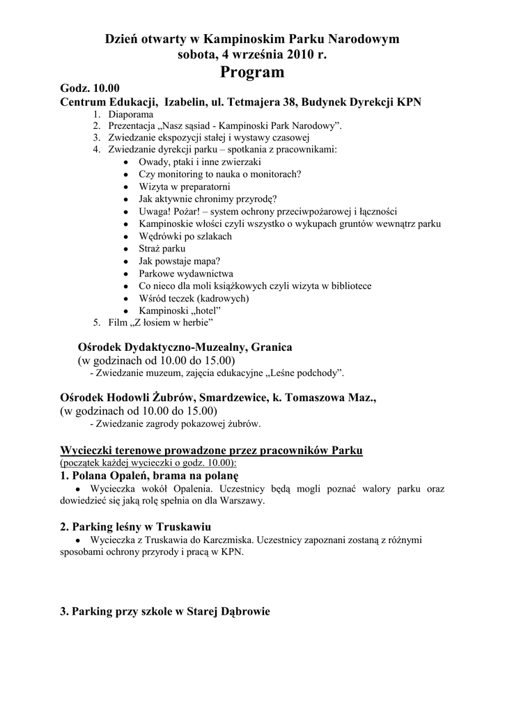 Dzień otwarty w Kampinoskim Parku Narodowym sobota, 4 września 2010 r. Program Godz. 10.00 Centrum Edukacji, Izabelin, ul. Tetmajera 38, Budynek Dyrekcji KPN 1. 2. 3. 4. Diaporama Prezentacja „Nasz sąsiad - Kampinoski Park Narodowy”. Zwiedzanie ekspozycji stałej i wystawy czasowej Zwiedzanie dyrekcji parku – spotkania z pracownikami: Owady, ptaki i inne zwierzaki Czy monitoring to nauka o monitorach? Wizyta w preparatorni Jak aktywnie chronimy przyrodę? Uwaga! Pożar! – system ochrony przeciwpożarowej i łączności Kampinoskie włości czyli wszystko o wykupach gruntów wewnątrz parku Wędrówki po szlakach Straż parku Jak powstaje mapa? Parkowe wydawnictwa Co nieco dla moli książkowych czyli wizyta w bibliotece Wśród teczek (kadrowych) Kampinoski „hotel” 5. Film „Z łosiem w herbie” Ośrodek Dydaktyczno-Muzealny, Granica (w godzinach od 10.00 do 15.00) - Zwiedzanie muzeum, zajęcia edukacyjne „Leśne podchody”. Ośrodek Hodowli Żubrów, Smardzewice, k. Tomaszowa Maz., (w godzinach od 10.00 do 15.00) - Zwiedzanie zagrody pokazowej żubrów. Wycieczki terenowe prowadzone przez pracowników Parku (początek każdej wycieczki o godz. 10.00): 1. Polana Opaleń, brama na polanę Wycieczka wokół Opalenia. Uczestnicy będą mogli poznać walory parku oraz dowiedzieć się jaką rolę spełnia on dla Warszawy. 2. Parking leśny w Truskawiu Wycieczka z Truskawia do Karczmiska. Uczestnicy zapoznani zostaną z różnymi sposobami ochrony przyrody i pracą w KPN. 3. Parking przy szkole w Starej Dąbrowie Przejście ścieżką dydaktyczną „Wokół Bieli”. 4. Parking w Roztoce Wycieczka po ścieżce dydaktycznej „Doliną Roztoki”. 5. Gospodarstwo szkółkarskie w Julinku Prezentacja prac szkółkarskich i gatunków hodowlanych w szkółce. 6. Pętla autobusowa we wsi Palmiry Spacer czarnym szlakiem po obszarze ochrony ścisłej „Kaliszki”. Zapoznanie uczestników z typową roślinnością, światem zwierzęcym i warunkami abiotycznymi kształtującymi ekosystem lasu na danym terenie. Godz. 12.00 Izabelin, ul. Tetmajera 38, baza techniczna, przy budynku Dyrekcji KPN Prezentacja sprzętu przeciwpożarowego i pokaz akcji gaśniczej Godz. 12.00 Centrum Edukacji, Izabelin, ul. Tetmajera 38, Budynek Dyrekcji KPN 1. 2. 3. 4. Diaporama Prezentacja „Nasz sąsiad - Kampinoski Park Narodowy”. Zwiedzanie ekspozycji stałej i wystawy czasowej Zwiedzanie dyrekcji parku – spotkania z pracownikami: - Owady, ptaki i inne zwierzaki - Czy monitoring to nauka o monitorach? - Wizyta w preparatorni. - Jak aktywnie chronimy przyrodę? - Uwaga! Pożar! – system ochrony przeciwpożarowej i łączności - Kampinoskie włości czyli wszystko o wykupach gruntów wewnątrz parku - Wędrówki po szlakach - Straż parku - Jak powstaje mapa? - Parkowe wydawnictwa - Co nieco dla moli książkowych czyli wizyta w bibliotece - Wśród teczek (kadrowych) - Kampinoski „hotel” 5. Film „Z łosiem w herbie”. Godz. 14.00 Izabelin, ul. Tetmajera 38, baza techniczna, przy budynku Dyrekcji KPN Prezentacja sprzętu przeciwpożarowego i pokaz akcji gaśniczej. Godz. 14.30 – 16.00 Izabelin, ul. Tetmajera 38, Polana Jakubów, przy budynku Dyrekcji KPN Spotkanie przy ognisku, poczęstunek Konkursy z nagrodami Pożegnanie Więcej informacji na: www.kampinoski-pn.gov.pl