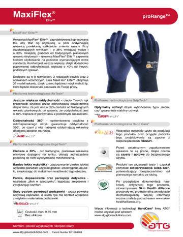 MaxiFlex® EliteTM proRangeTM MaxiFlex® Elite™ Rękawica MaxiFlex® Elite™, zaprojektowana i opracowana tak, aby stać się najlżejszą, w pełni oddychającą rękawicą powlekaną, całkowicie zmienia zasady. Przy oszałamiających wynikach – o 36% mniejszej wadze i o 30% mniejszej grubości od tradycyjnych piankowych rękawic nitrylowych – rękawica MaxiFlex® Elite™ zapewnia komfort użytkowania na poziomie wyznaczającym nowe standardy. Komfort jest jeszcze większy, dzięki dodatkowo poprawionej oddychalności, większej o 40% od innych, podobnych rękawic. Dostępne są w 8 rozmiarach, 2 rodzajach powłok oraz 2 odmianach wzorniczych. Linia MaxiFlex® Elite™ obejmuje 32 modeli rękawic, dzięki czemu będziesz mógł znaleźć tę, która będzie doskonale pasowała do Twojej pracy. Platforma technologiczna AirTech® Oddychalność 360° - opatentowana powłoka z mikrospienianego nitrylu gwarantuje oddychalność 360°, co czyni z niej najlepiej oddychającą rękawicę dostępną obecnie na rynku. Platforma technologiczna ErgoTech® Cieńsze o 30% - niż tradycyjne, piankowe rękawice nitrylowe dostępne na rynku; oferują jednocześnie podobną do nich wytrzymałość mechaniczną. Bardzo lekka wyściółka - zastosowanie bardzo lekkiej wyściółki pozwoliło uzyskać gładkie i zaokrąglone opuszki, zwiększając do maksimum wrażliwość tego obszaru. Forma, dopasowanie oraz percepcja dotykowa naśladuje „dłoń w spoczynku”, łagodząc zmęczenie i zwiększając komfort. Stały poziom penetracji podszewki - przez powłokę nitrylową zapewnia, iż skóra ręki ma kontakt wyłącznie z miękkim materiałem podszewki. 4121 Grubość dłoni 0,75 mm Bez silikonu Platforma technologiczna GripTech® Optymalny uchwyt dzięki wykończeniu typu „microcup” gwarantuje stabilny uchwyt. Platforma technologiczna Hand Care® Wszystkie materiały użyte do produkcji tego produktu oraz przyjęte podczas jego projektowania są zgodne z rozporządzeniem REACH. Przed ostatecznym zapakowaniem rękawice te są prane, dzięki czemu są czyste i gotowe do bezpiecznego użytku. Produkt ten przeszedł testy i uzyskał certyfikat stowarzyszenia Oeko-Tex®, potwierdzający bezpieczeństwo od pierwszego kontaktu ze skórą. Po przeglądzie dokumentacji naukowej, dotyczącej tego produktu, stowarzyszenie Skin Health Alliance przyznało mu profesjonalną akredytację dermatologiczną. Więcej informacji można znaleźć pod adresem www.skinhealthalliance.org. Więcej informacji o technologii HandCare® firmy ATG® można uzyskać pod adresem www.atg-glovesolutions.com. Komfort i jakość wyjątkowych narzędzi pracy www.atg-glovesolutions.com - Patent Number EP1608808 Intelligent Glove Solutions formerly John Ward Ceylon (Pvt) Ltd Jeszcze większa oddychalność - ciepło Twoich rąk przechodzi szybciej przez oddychającą powierzchnię dzięki temu, że jest ona o 35% cieńsza od tradycyjnych rękawic piankowych, co sprawia, że oddychalność jest o 40% większa w porównaniu z podobnymi rękawicami. MaxiFlex® proRangeTM EliteTM Branże Zastosowania Materiały podstawowe Urządzenia, rolnicze substancje chemiczne, aluminium, montaż samochodów, rynek usług motoryzacyjnych i produktów do obsługi samochodów, sprzęt elektryczny i elektroniczny, substancje chemiczne, producenci oryginalnego wyposażenia, ropa i gaz, metale oraz materiały, górnictwo, stal i żelazo, pakowanie oraz kontenery, przemysł celulozowo-papierniczy, guma i tworzywa sztuczne, samochody ciężarowe i inne pojazdy, sprzęt elektryczny. Majsterkowanie Prace wykończeniowe oraz inspekcje Ogrodnictwo Operowanie małymi elementami Montaż wstępny, wtórny oraz końcowy Prace konserwacyjne Logistyka i składowanie Obsługa narzędzi oraz instrumentów Obsługa instalacji elektrycznych Wyroby przemysłowe Lotnictwo i wojskowość, ogólne materiały budowlane, przedsiębiorstwa, szkło, budownictwo, artykuły trwałego użytku, przemysłowe urządzenia elektryczne, wyrób metali, budownictwo mieszkaniowe, drobne narzędzia i akcesoria, wyroby włókiennicze. Dostępne także w serii MaxiFlex® Usługi Ochrona portów lotniczych, sklepy z częściami samochodowymi, obsługa bagażowa, sprzedaż hurtowa materiałów budowlanych, gry, sklepy spożywcze, roboty drogowe i kolejowe. MaxiFlex® Ultimate™ Oryginalne MaxiFlex® to rękawice zapewniające oddychalność. MaxiFlex® Active™ Nasączenie witaminą E oraz aloesem. Wspiera walkę z rakiem piersi MaxiFlex® Elite MaxiFlex® Comfort™ Miękka i chłonna bawełniana podszewka zapewniająca dodatkowy komfort. Nr ref. Powłoka WykończenieKolor Wyściółka Rozmiary 34-274 Dłoń 34-275 Maczane 34-244 Dłoń 34-245 Maczane nd. nd. Groszki Groszki NiebieskiNiebieski NiebieskiNiebieski NiebieskiNiebieski NiebieskiNiebieski 5 (XXS) - 12 (XXXL) 5 (XXS) - 12 (XXXL) 5 (XXS) - 12 (XXXL) 5 (XXS) - 12 (XXXL) Długość Grubość dłoni 25cm 0.75mm 25cm 0.75mm 25cm 0.75mm 25cm 0.75mm EN388 Bez silikonu 4121 4121 4121 4121 Tak Tak Nie Nie Komfort i jakość wyjątkowych narzędzi pracy www.atg-glovesolutions.com - Patent Number EP1608808 Intelligent Glove Solutions formerly John Ward Ceylon (Pvt) Ltd MaxiFlex® Endurance™ Dodatkowe zabezpieczenie i ochrona przed ścieraniem.