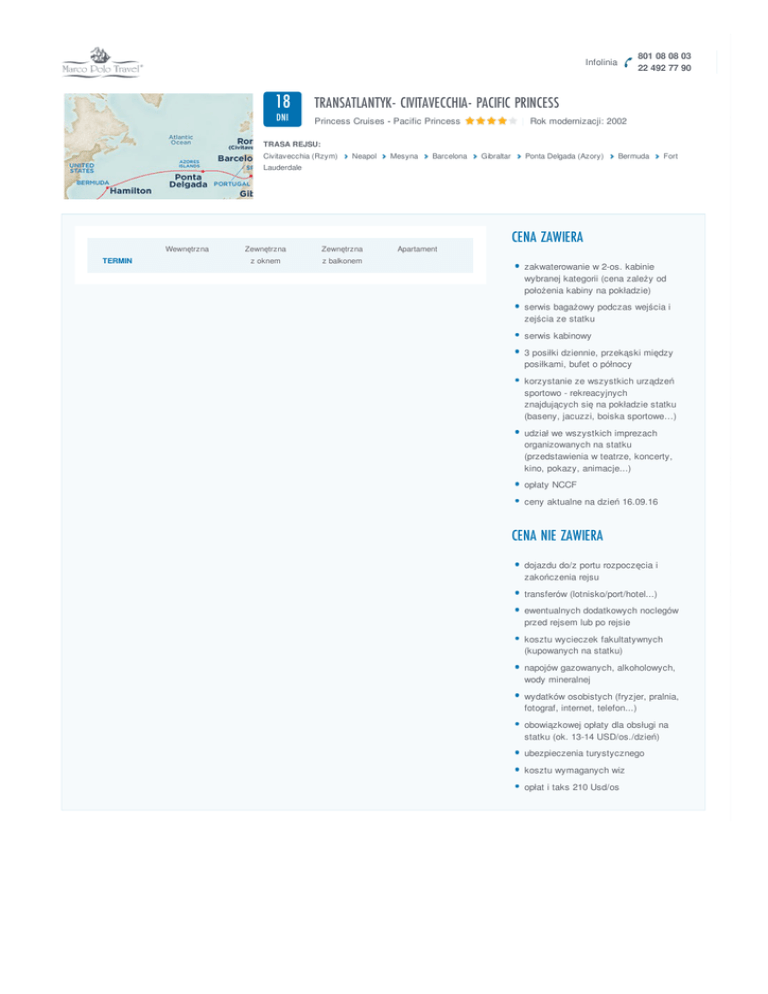 801 08 08 03 22 492 77 90 Infolinia 18 TRANSATLANTYK- CIVITAVECCHIA- PACIFIC PRINCESS DNI Princess Cruises - Pacific Princess | Rok modernizacji: 2002 TRASA REJSU: Civitavecchia (Rzym) Neapol Mesyna Barcelona Gibraltar Ponta Delgada (Azory) Bermuda Fort Lauderdale Wewnętrzna TERMIN Zewnętrzna Zewnętrzna z oknem z balkonem Apartament CENA ZAWIERA zakwaterowanie w 2-os. kabinie wybranej kategorii (cena zależy od położenia kabiny na pokładzie) serwis bagażowy podczas wejścia i zejścia ze statku serwis kabinowy 3 posiłki dziennie, przekąski między posiłkami, bufet o północy korzystanie ze wszystkich urządzeń sportowo - rekreacyjnych znajdujących się na pokładzie statku (baseny, jacuzzi, boiska sportowe…) udział we wszystkich imprezach organizowanych na statku (przedstawienia w teatrze, koncerty, kino, pokazy, animacje...) opłaty NCCF ceny aktualne na dzień 16.09.16 CENA NIE ZAWIERA dojazdu do/z portu rozpoczęcia i zakończenia rejsu transferów (lotnisko/port/hotel...) ewentualnych dodatkowych noclegów przed rejsem lub po rejsie kosztu wycieczek fakultatywnych (kupowanych na statku) napojów gazowanych, alkoholowych, wody mineralnej wydatków osobistych (fryzjer, pralnia, fotograf, internet, telefon...) obowiązkowej opłaty dla obsługi na statku (ok. 13-14 USD/os./dzień) ubezpieczenia turystycznego kosztu wymaganych wiz opłat i taks 210 Usd/os