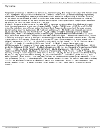Płońszczak - Gazeta lokalna - Płońsk, Raciąż, Baboszewo, Czerwińsk, Dzierzążnia, Joniec, Naruszewo Pływanie Rozpoczeli rywalizację w lidzePłońscy zawodnicy, reprezentujący dwa miejscowe kluby: UKS Korsarz oraz PUKS, występami na pływalniach w Piasecznie (6 marca) i Warszawie (9 marca) rozpoczęli tegoroczny sezon startÃłw w okręgowej lidze pływackiej Warszawy i Mazowsza.W rywalizacji w roczniku 1994-95, ktÃłra odbyła się we wtorek, 6 marca w Piasecznie, barw Płońska bronił jeden reprezentant - Maciej Myszyński (UKS Korsarz), ktÃłry na dystansie 100 m stylem dowolnym i stylem motylkowym uplasował się kolejno na 20 (1.09,06) i 10 miejscu (1.24,80). W piątek, 9 marca, w Warszawie w roczniku 1997 o pierwsze punkty do klasyfikacji ligi rywalizowała jużÂ dziewięcioosobowa grupa naszych zawodnikÃłw (ośmiu z PUKS i jeden z UKS Korsarz).WśrÃłd chłopcÃłw najwięcej powodÃłw do zadowolenia ma Kamil Popowski. Reprezentant Korsarza uzyskał bowiem dobre czasy na dystansach: 50 m stylem grzbietowym - 40,86 (trzecie miejsce), dowolnym 35,06 (czwarte miejsce) oraz motylkowym - 43,91 (piąta pozycja).W żeńskiej rywalizacji nasze zawodniczki, mimo iż nie zdobyły punktÃłw dla drużyny (startowały trzy zawodniczki PUKS-u), także mają powody do zadowolenia. Podopieczne Roberta Goszczyńskiego i Radosława Ozimkiewicza, ktÃłre startowały ze względu na swÃłj wiek poza konkurencją (walczyły ze starszymi zawodniczkami) uzyskały bowiem bardzo dobre czasy (patrz wyniki). (makn)foto: zbiory prywatneWyniki6 marca, Piaseczno - rocz. 1994-95Styl dowolny (100 m): 20. Maciej Myszyński (UKS Korsarz Płońsk) - 1.09,06. Styl motylkowy (100 m): 10. Maciej Myszyński (UKS Korsarz Płońsk) - 1.24,80. 9 marca, Warszawa, rocz. 1997Dziewczęta Styl klasyczny (50 m): poza konkurencją: Weronika Kostrzewa (PUKS Płońsk) - 50,35; pk. Emilia Tokarska (PUKS Płońsk) - 54,31. Styl grzbietowy (50 m): pk. Aleksandra Wierzchowska (PUKS Płońsk) - 47,76; pk. Emilia Tokarska (PUKS Płońsk) - 52,45. Styl dowolny (50 m): pk. Weronika Kostrzewa (PUKS Płońsk) - 38,98; pk. Aleksandra Wierzchowska (PUKS Płońsk) - 42,66. Chłopcy Styl dowolny (50 m): 4. Kamil Popowski (UKS Korsarz Płońsk) - 35,06; 26. Jakub Ceremański (PUKS Płońsk) 41,76; 28. Filip Zyskowski (PUKS Płońsk) - 42,16; dyskwalifikacja. Łukasz Nerć (PUKS Płońsk); dysk. Karol Dyksiński (PUKS Płońsk). Styl klasyczny (50 m): 19. Przemysław Bugalski (PUKS Płońsk) - 1.03,92. Styl grzbietowy (50 m): 3. Kamil Popowski (UKS Korsarz Płońsk) - 40,86; 36. Łukasz Nerć (PUKS Płońsk) - 55,52; 43. Karol Dyksiński (PUKS Płońsk) - 59,88. Styl motylkowy (50 m): 5. Kamil Popowski (UKS Korsarz Płońsk) - 43,91; 9. Filip Zyskowski (PUKS Płońsk) - 53,45; dysk. Jakub Ceremański (PUKS Płońsk). http://www.plonszczak.pl Kreator PDF Utworzono 8 March, 2017, 01:08
