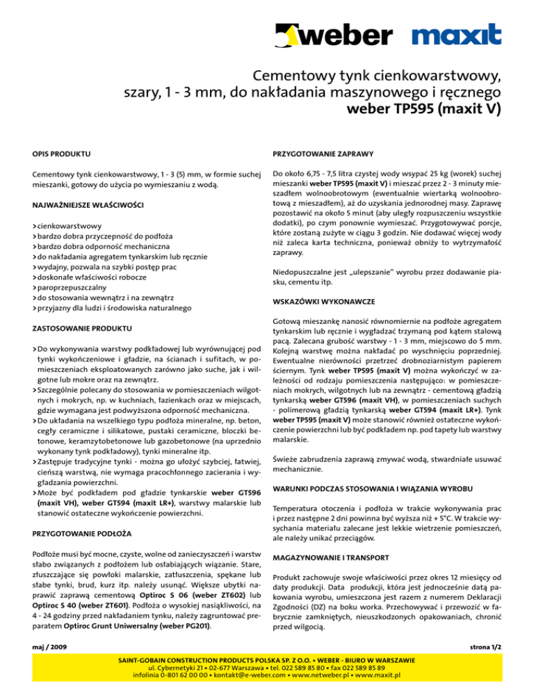 Cementowy tynk cienkowarstwowy, szary, 1 - 3 mm, do nakładania maszynowego i ręcznego weber TP595 (maxit V) Opis produktu Przygotowanie zaprawy Cementowy tynk cienkowarstwowy, 1 - 3 (5) mm, w formie suchej mieszanki, gotowy do użycia po wymieszaniu z wodą. Do około 6,75 - 7,5 litra czystej wody wsypać 25 kg (worek) suchej mieszanki weber TP595 (maxit V) i mieszać przez 2 - 3 minuty mieszadłem wolnoobrotowym (ewentualnie wiertarką wolnoobrotową z mieszadłem), aż do uzyskania jednorodnej masy. Zaprawę pozostawić na około 5 minut (aby uległy rozpuszczeniu wszystkie dodatki), po czym ponownie wymieszać. Przygotowywać porcje, które zostaną zużyte w ciągu 3 godzin. Nie dodawać więcej wody niż zaleca karta techniczna, ponieważ obniży to wytrzymałość zaprawy. Najważniejsze właściwości > cienkowarstwowy > bardzo dobra przyczepność do podłoża > bardzo dobra odporność mechaniczna > do nakładania agregatem tynkarskim lub ręcznie > wydajny, pozwala na szybki postęp prac > doskonałe właściwości robocze > paroprzepuszczalny > do stosowania wewnątrz i na zewnątrz > przyjazny dla ludzi i środowiska naturalnego Zastosowanie produktu > Do wykonywania warstwy podkładowej lub wyrównującej pod tynki wykończeniowe i gładzie, na ścianach i sufitach, w pomieszczeniach eksploatowanych zarówno jako suche, jak i wilgotne lub mokre oraz na zewnątrz. > Szczególnie polecany do stosowania w pomieszczeniach wilgotnych i mokrych, np. w kuchniach, łazienkach oraz w miejscach, gdzie wymagana jest podwyższona odporność mechaniczna. > Do układania na wszelkiego typu podłoża mineralne, np. beton, cegły ceramiczne i silikatowe, pustaki ceramiczne, bloczki betonowe, keramzytobetonowe lub gazobetonowe (na uprzednio wykonany tynk podkładowy), tynki mineralne itp. > Zastępuje tradycyjne tynki - można go ułożyć szybciej, łatwiej, cieńszą warstwą, nie wymaga pracochłonnego zacierania i wygładzania powierzchni. > Może być podkładem pod gładzie tynkarskie weber GT596 (maxit VH), weber GT594 (maxit LR+), warstwy malarskie lub stanowić ostateczne wykończenie powierzchni. Przygotowanie podłoża Podłoże musi być mocne, czyste, wolne od zanieczyszczeń i warstw słabo związanych z podłożem lub osłabiających wiązanie. Stare, złuszczające się powłoki malarskie, zatłuszczenia, spękane lub słabe tynki, brud, kurz itp. należy usunąć. Większe ubytki naprawić zaprawą cementową Optiroc S 06 (weber ZT602) lub Optiroc S 40 (weber ZT601). Podłoża o wysokiej nasiąkliwości, na 4 - 24 godziny przed nakładaniem tynku, należy zagruntować preparatem Optiroc Grunt Uniwersalny (weber PG201). Niedopuszczalne jest „ulepszanie” wyrobu przez dodawanie piasku, cementu itp. Wskazówki wykonawcze Gotową mieszankę nanosić równomiernie na podłoże agregatem tynkarskim lub ręcznie i wygładzać trzymaną pod kątem stalową pacą. Zalecana grubość warstwy - 1 - 3 mm, miejscowo do 5 mm. Kolejną warstwę można nakładać po wyschnięciu poprzedniej. Ewentualne nierówności przetrzeć drobnoziarnistym papierem ściernym. Tynk weber TP595 (maxit V) można wykończyć w zależności od rodzaju pomieszczenia następująco: w pomieszczeniach mokrych, wilgotnych lub na zewnątrz - cementową gładzią tynkarską weber GT596 (maxit VH), w pomieszczeniach suchych - polimerową gładzią tynkarską weber GT594 (maxit LR+). Tynk weber TP595 (maxit V) może stanowić również ostateczne wykończenie powierzchni lub być podkładem np. pod tapety lub warstwy malarskie. Świeże zabrudzenia zaprawą zmywać wodą, stwardniałe usuwać mechanicznie. Warunki podczas stosowania i wiązania wyrobu Temperatura otoczenia i podłoża w trakcie wykonywania prac i przez następne 2 dni powinna być wyższa niż + 5°C. W trakcie wysychania materiału zalecane jest lekkie wietrzenie pomieszczeń, ale należy unikać przeciągów. Magazynowanie i transport Produkt zachowuje swoje właściwości przez okres 12 miesięcy od daty produkcji. Data produkcji, która jest jednocześnie datą pakowania wyrobu, umieszczona jest razem z numerem Deklaracji Zgodności (DZ) na boku worka. Przechowywać i przewozić w fabrycznie zamkniętych, nieuszkodzonych opakowaniach, chronić przed wilgocią. maj / 2009 strona 1/2 Saint-Gobain Construction Products Polska Sp. z o.o. • Weber - Biuro w Warszawie ul. Cybernetyki 21 • 02-677 Warszawa • tel. 022 589 85 80 • fax 022 589 85 89 infolinia 0-801 62 00 00 • [email protected] • www.netweber.pl • www.maxit.pl Cementowy tynk cienkowarstwowy, szary, 1 - 3 mm, do nakładania maszynowego i ręcznego weber TP595 (maxit V) Środki bezpieczeństwa Dane techniczne > Wyrób zgodny z PN-EN 998-1 > Gęstość w stanie suchym 1100 - 1300 kg / m > Reakcja na ogień A1 - niepalny > Przyczepność (po 28 dniach) ≥ 0,5 N / mm2 (FP:B) > Wytrzymałość na ściskanie CS IV > Absorpcja wody ≤ 0,2 kg / m2min0,5 (W2) > Współczynnik przepuszczalności pary wodnej μ 15 > Współczynnik przewodzenia ciepła, λ10,dry (wartość tabelaryczna) ≤ 0,27/0,30 W / m · K > Proporcje mieszania około 6,75 - 7,5 litra wody na 25 kg (worek) suchej mieszanki > Czas zużycia do 3 godzin (zależnie od temperatury) > Grubość warstwy 1 - 3 mm (miejscowo do 5 mm) > Zużycie materiału około 1,2 kg suchej mieszanki na 1 m2 grubości 1 mm > Temperatura stosowania od + 5°C do + 25°C 3 Wyrób zawiera cement - wymieszany z wodą daje odczyn alkaliczny. Podjąć działania zapobiegające pyleniu lub ochlapaniu zaprawą. Nie wdychać, chronić oczy i skórę. W przypadku zanieczyszczenia: oczy natychmiast przemyć wodą i zasięgnąć porady lekarza, skórę umyć mydłem i wodą. Przechowywać poza zasięgiem dzieci. Uwaga Producent gwarantuje jakość wyrobu, lecz nie ma wpływu na sposób jego zastosowania. Wyrób należy stosować zgodnie z podanym opisem. Przedstawione informacje nie mogą jednak zastąpić fachowego przygotowania wykonawcy i nie zw